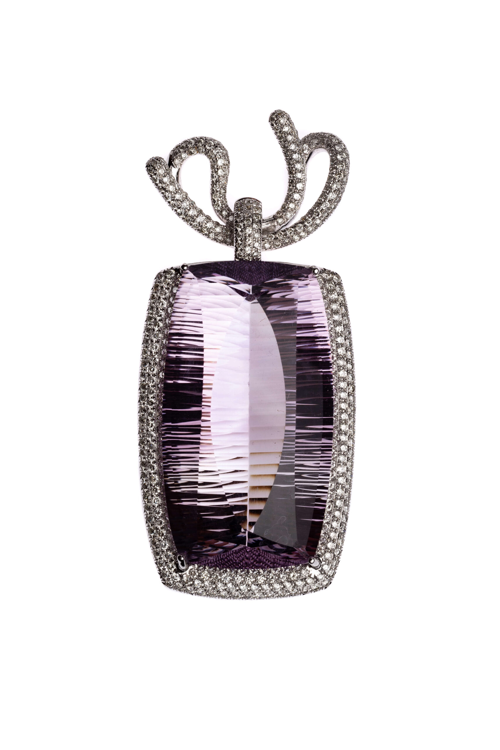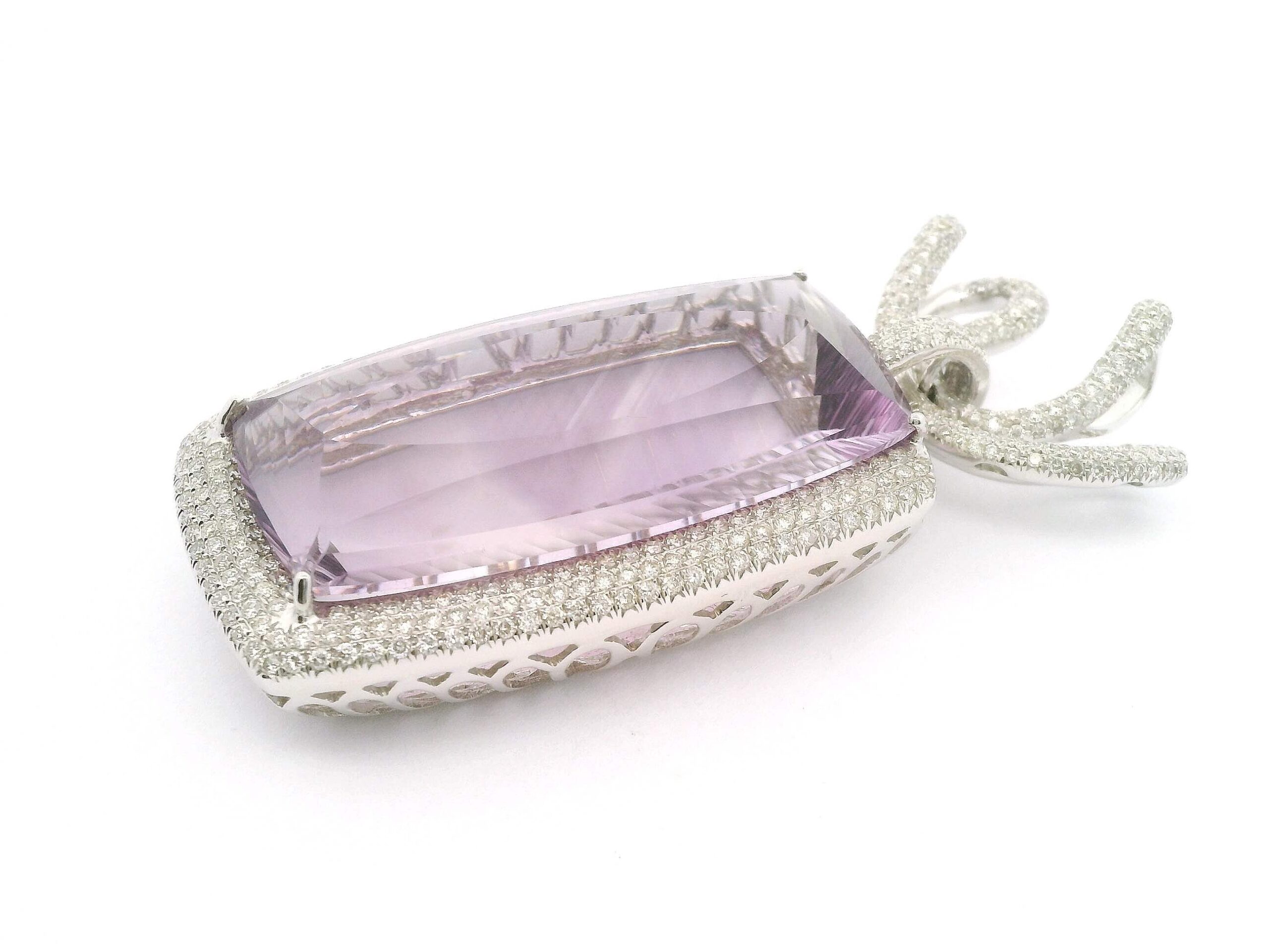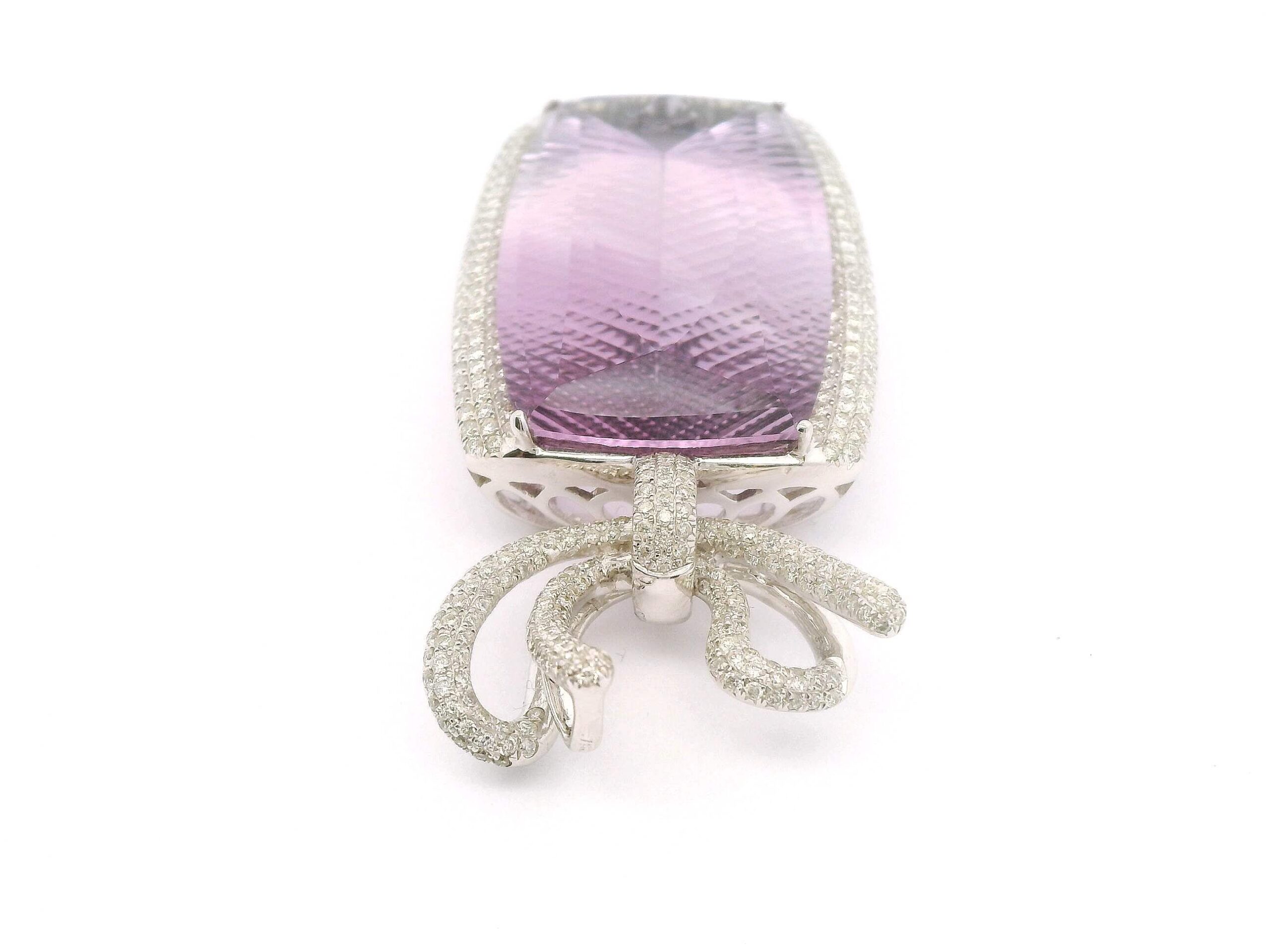 Anhänger aus Weißgold 750/fein mit Brillanten von zusammen circa 2,45 ct und einem Amethyst von circa 64 ct, Gesamtgewicht 17,6 g | Pendant in White Gold 750/Fine with Brilliant-Cut Diamonds Totaling Approx. 2.45 ct and One Amethyst Approx. 64 ct, Gross Weight 17.6 g