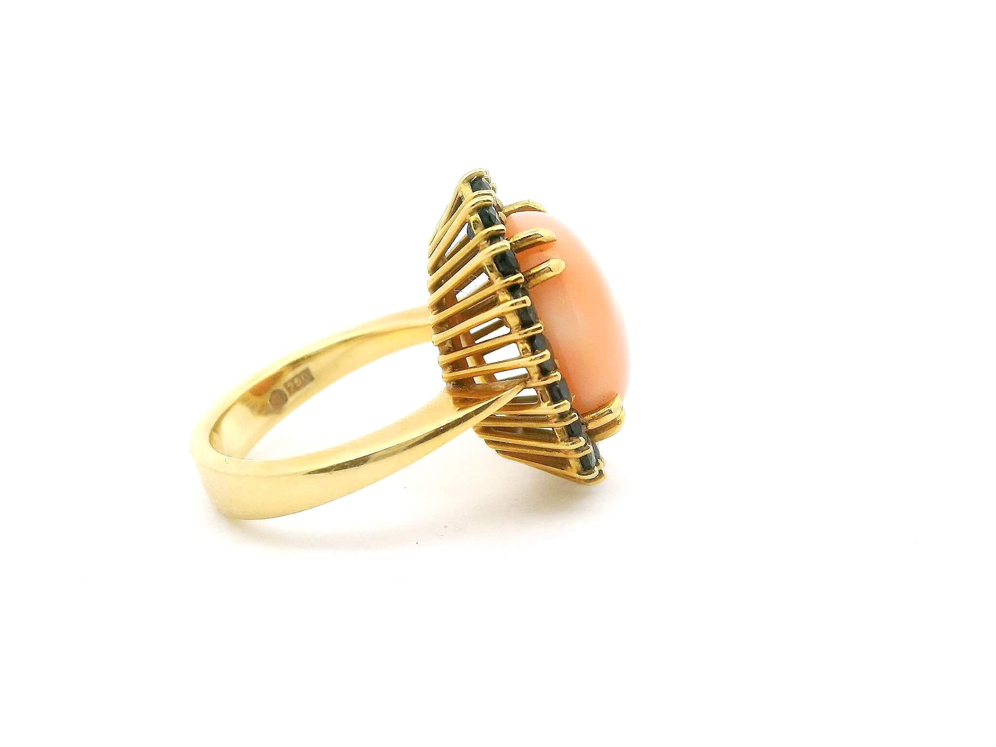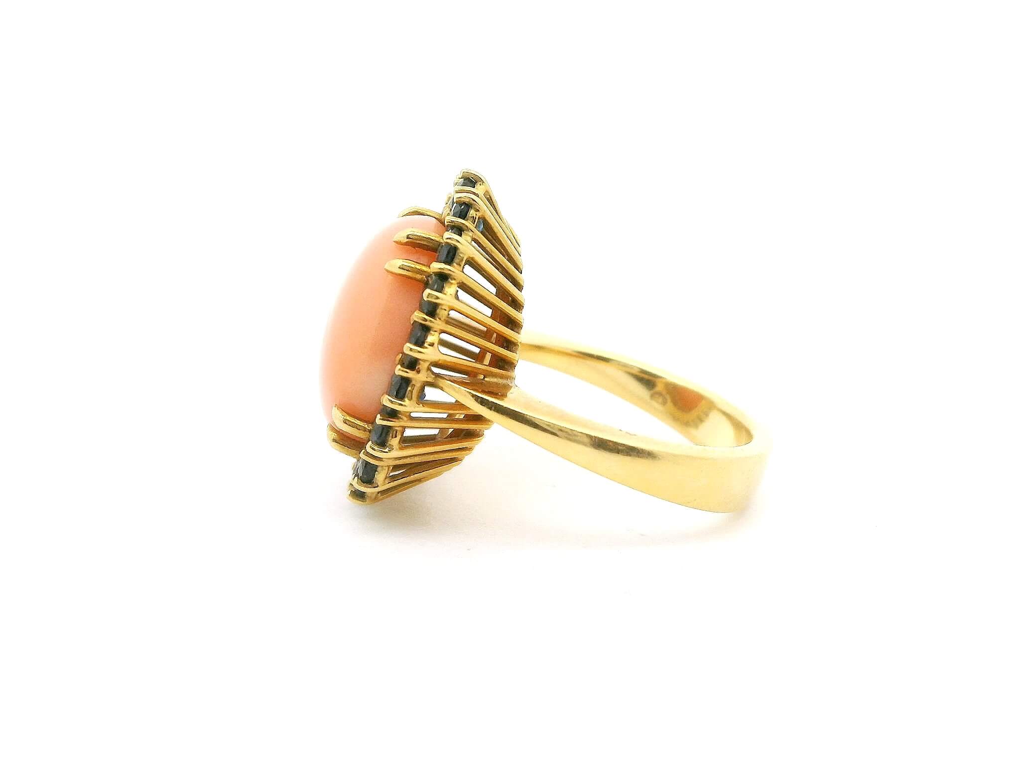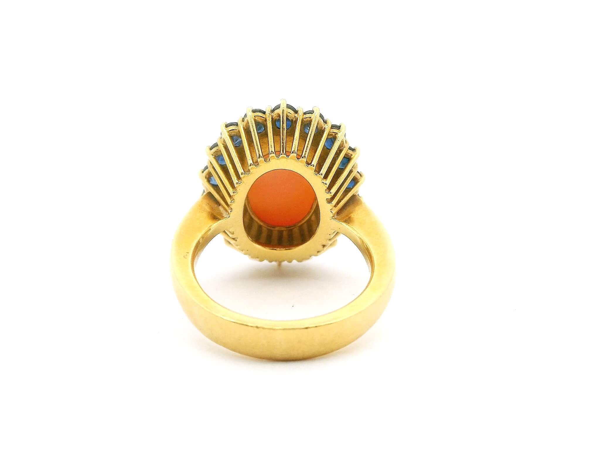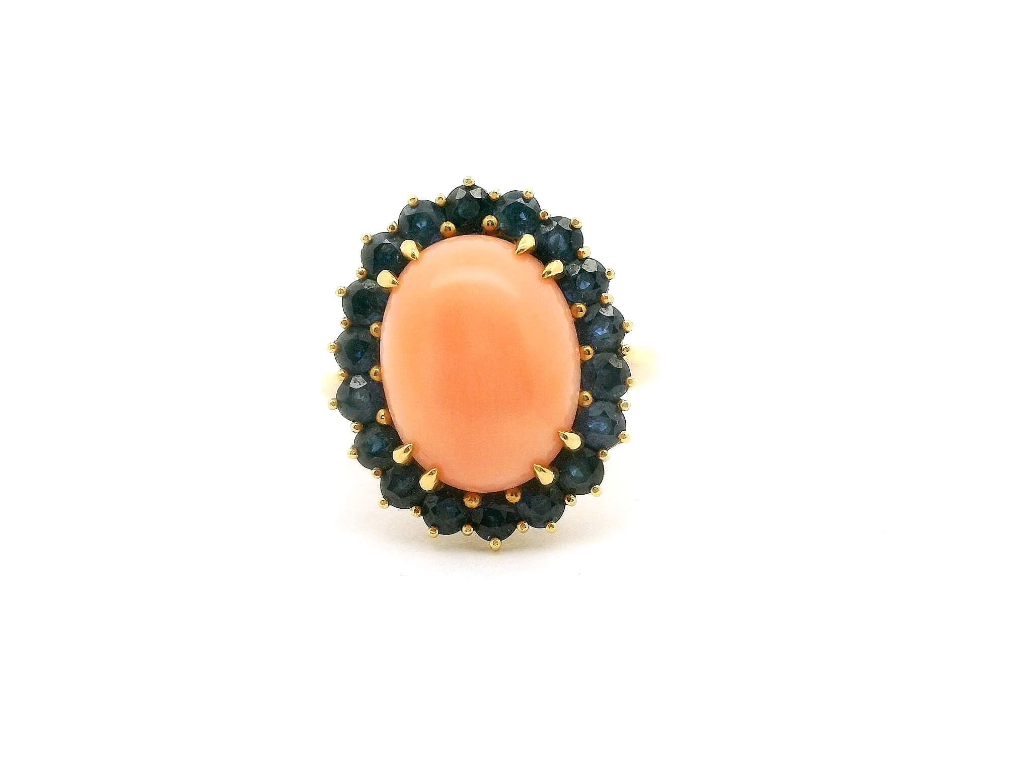 Ring aus Gelbgold 750/fein mit Saphiren von zusammen circa 1,2 ct und einer Koralle (14,5 × 11,2 mm), Gesamtgewicht 10,5 g, Ringweite 53 | Ring in 18K Yellow Gold set with Sapphires totaling approximately 1.2 ct and a coral measuring 14.5 × 11.2 mm, total weight 10.5 g, ring size 53