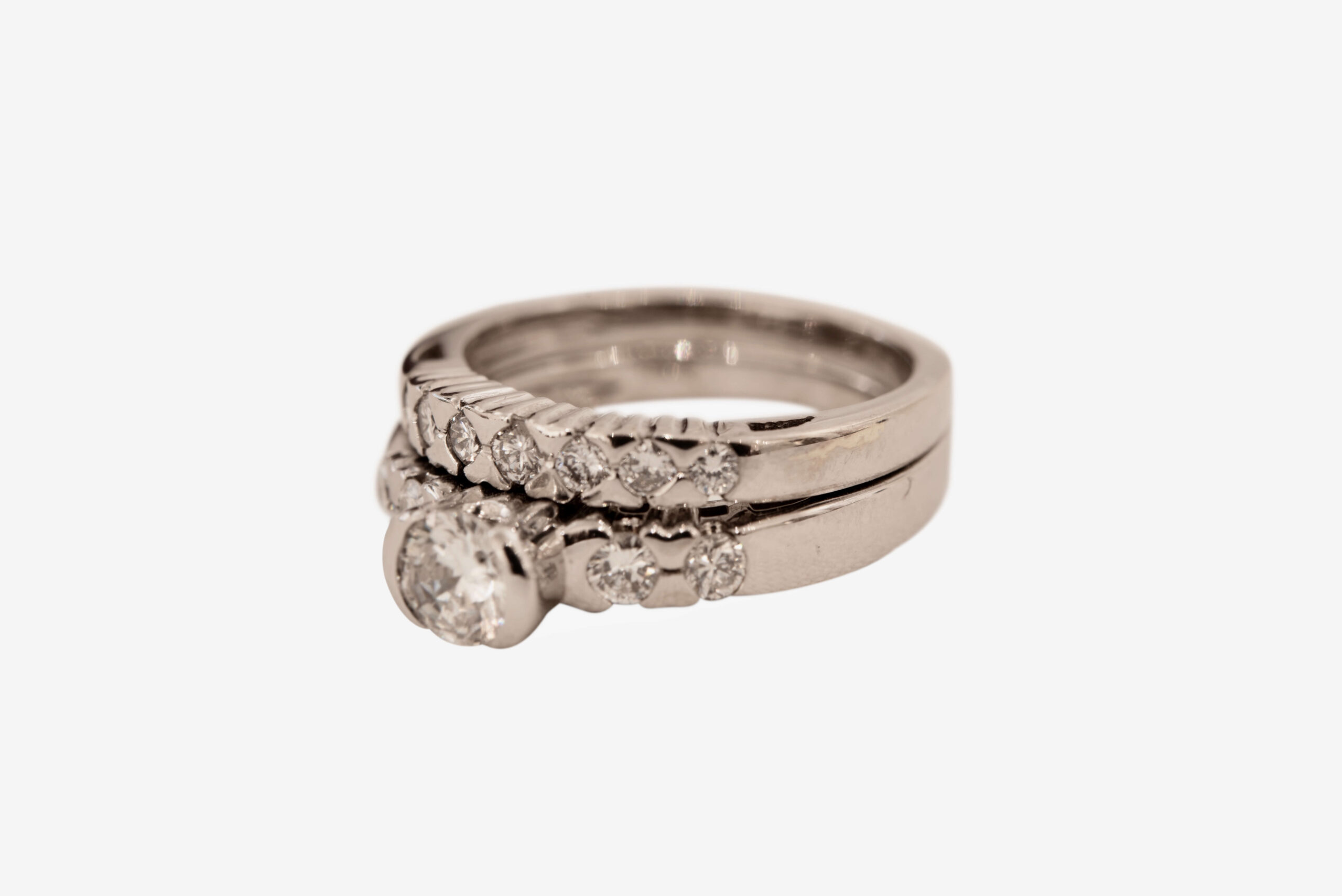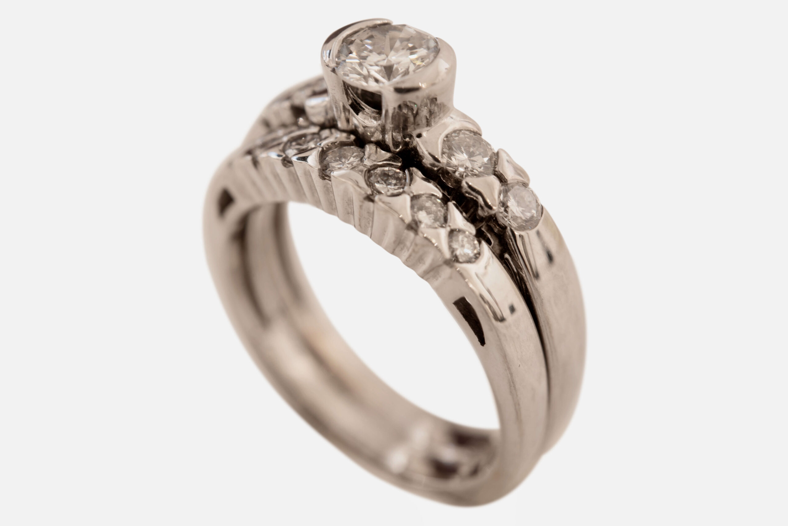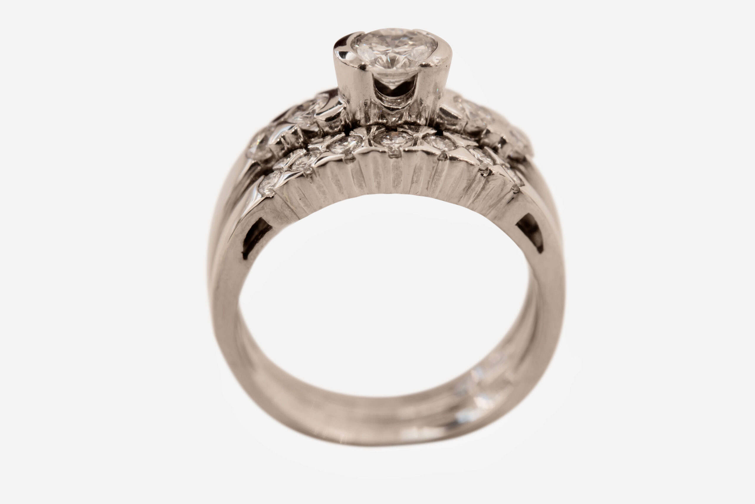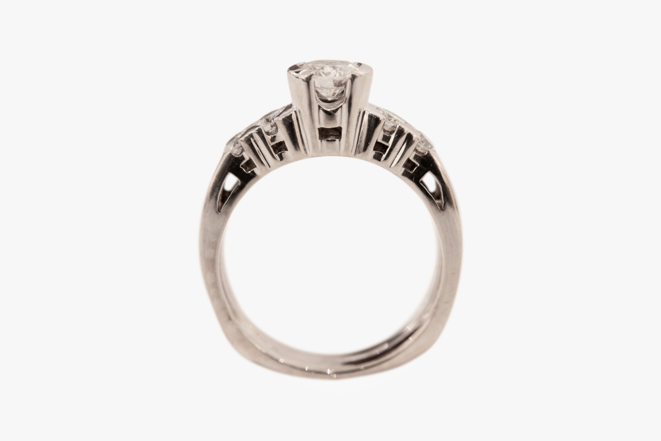 Ring aus Weißgold 585/fein mit einem Brillanten von circa 0,43 ct und weiteren Brillanten von zusammen circa 0,26 ct, Gesamtgewicht 6,8 g, Ringweite 53 | Ring in 14K White Gold set with one Brilliant-Cut Diamond of approximately 0.43 ct and additional Brilliant-Cut Diamonds totaling approximately 0.26 ct, total weight 6.8 g, ring size 53