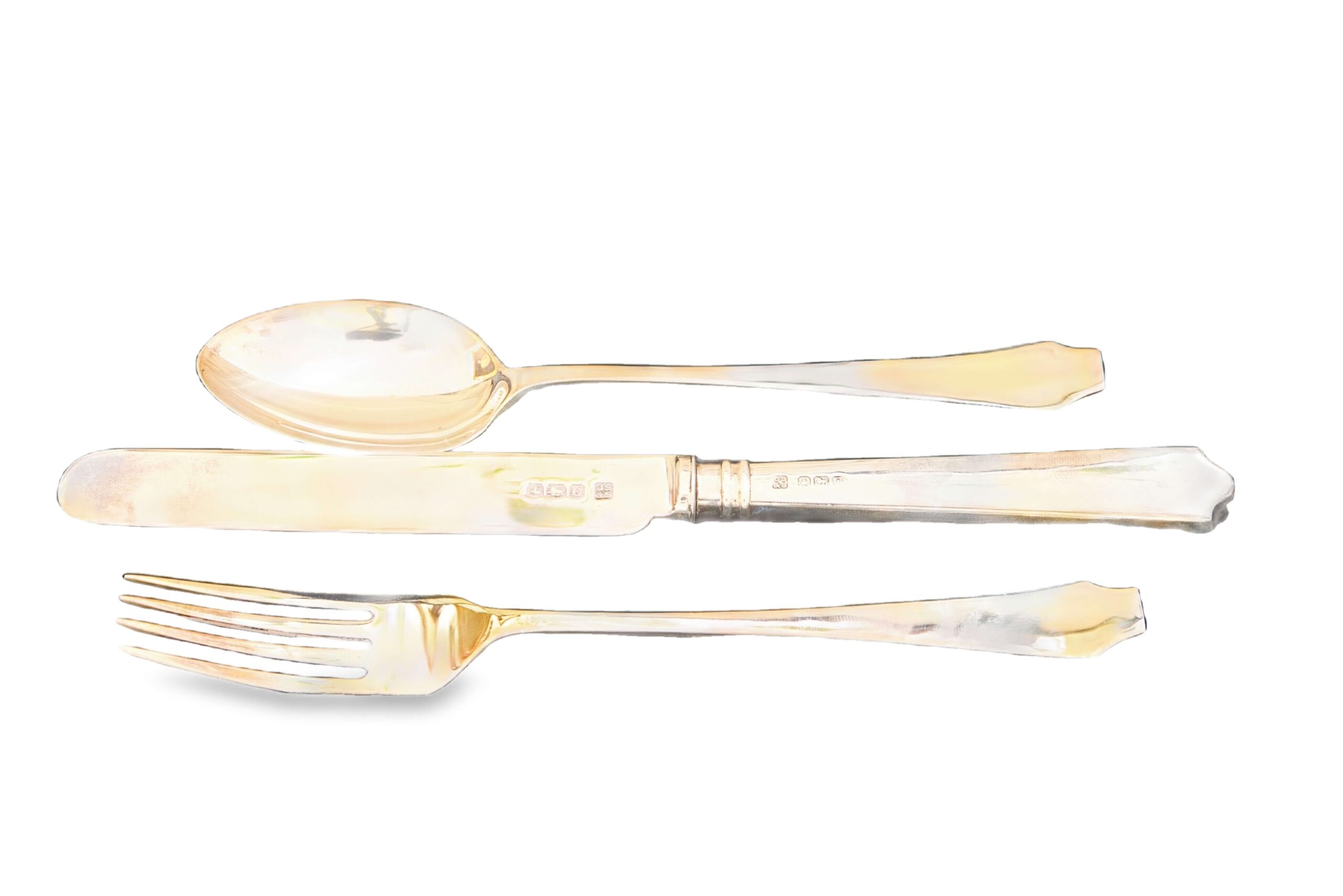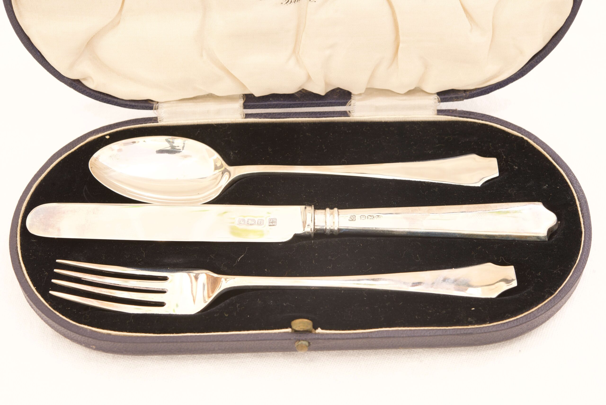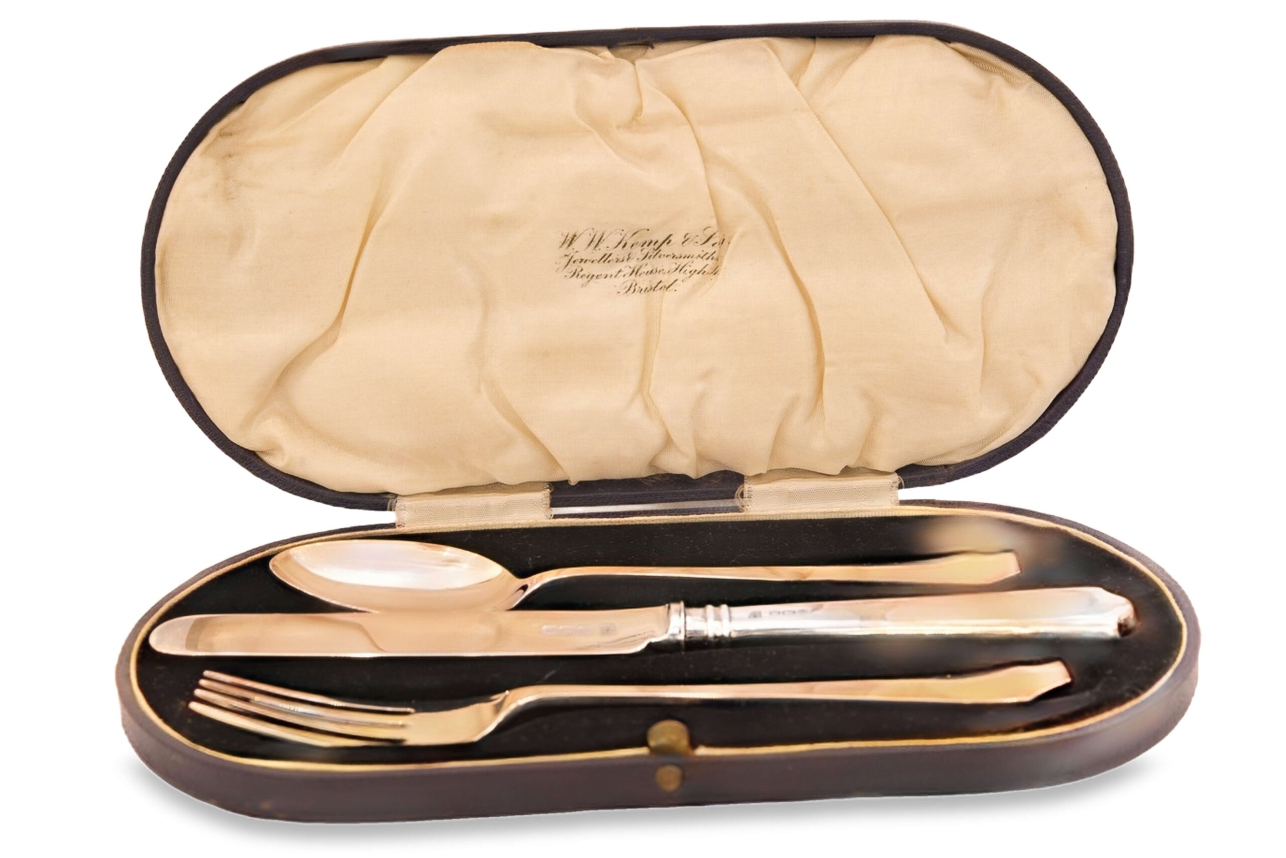 Taufbesteck (Christening Set Sheffield 1931) aus Sterlingsilber 925/fein, bestehend aus Messer, Gabel und Löffel, mit Etui, Gesamtgewicht 74,4 g | Christening cutlery set (Sheffield 1931) in Sterling Silver 925, comprising knife, fork, and spoon, with case, total weight 74.4 g