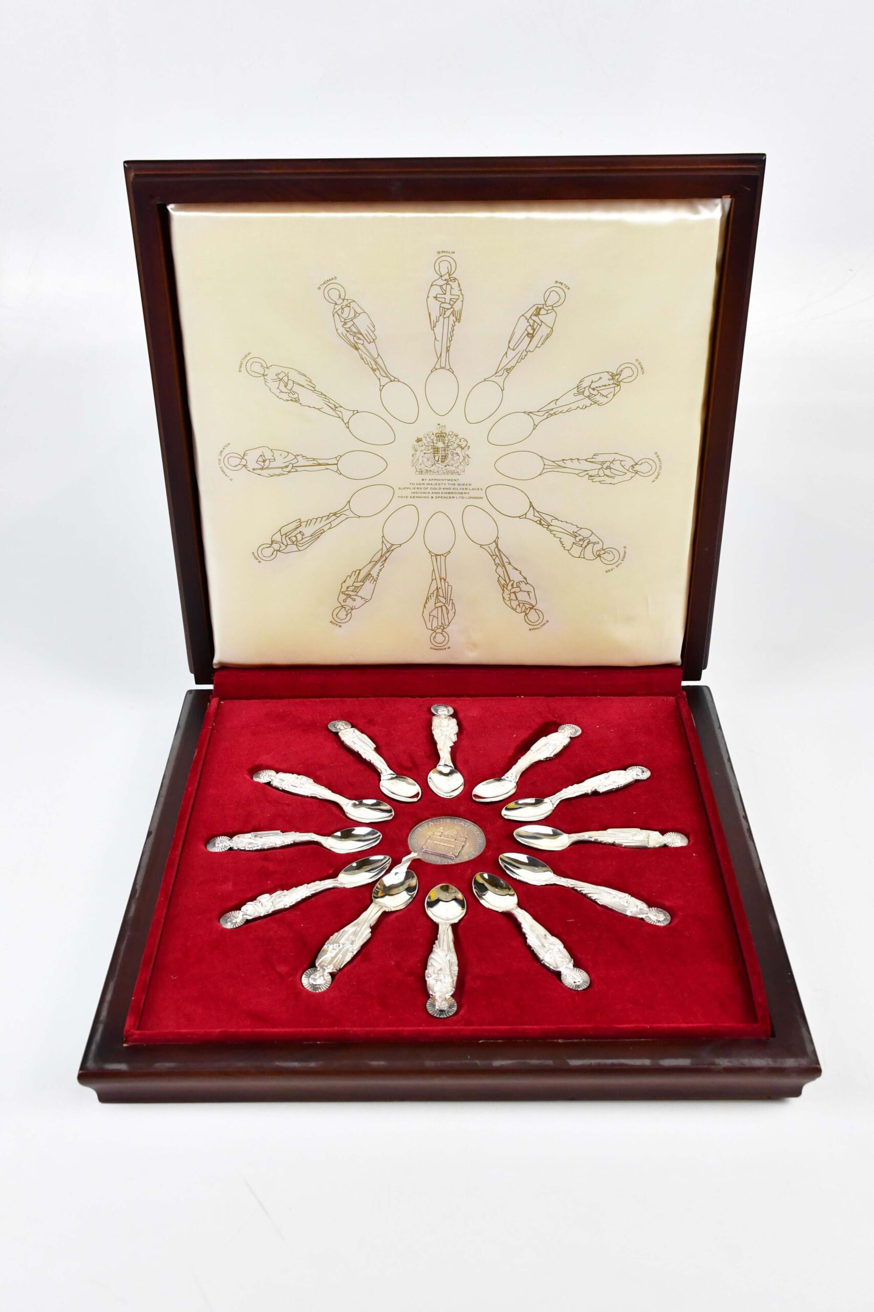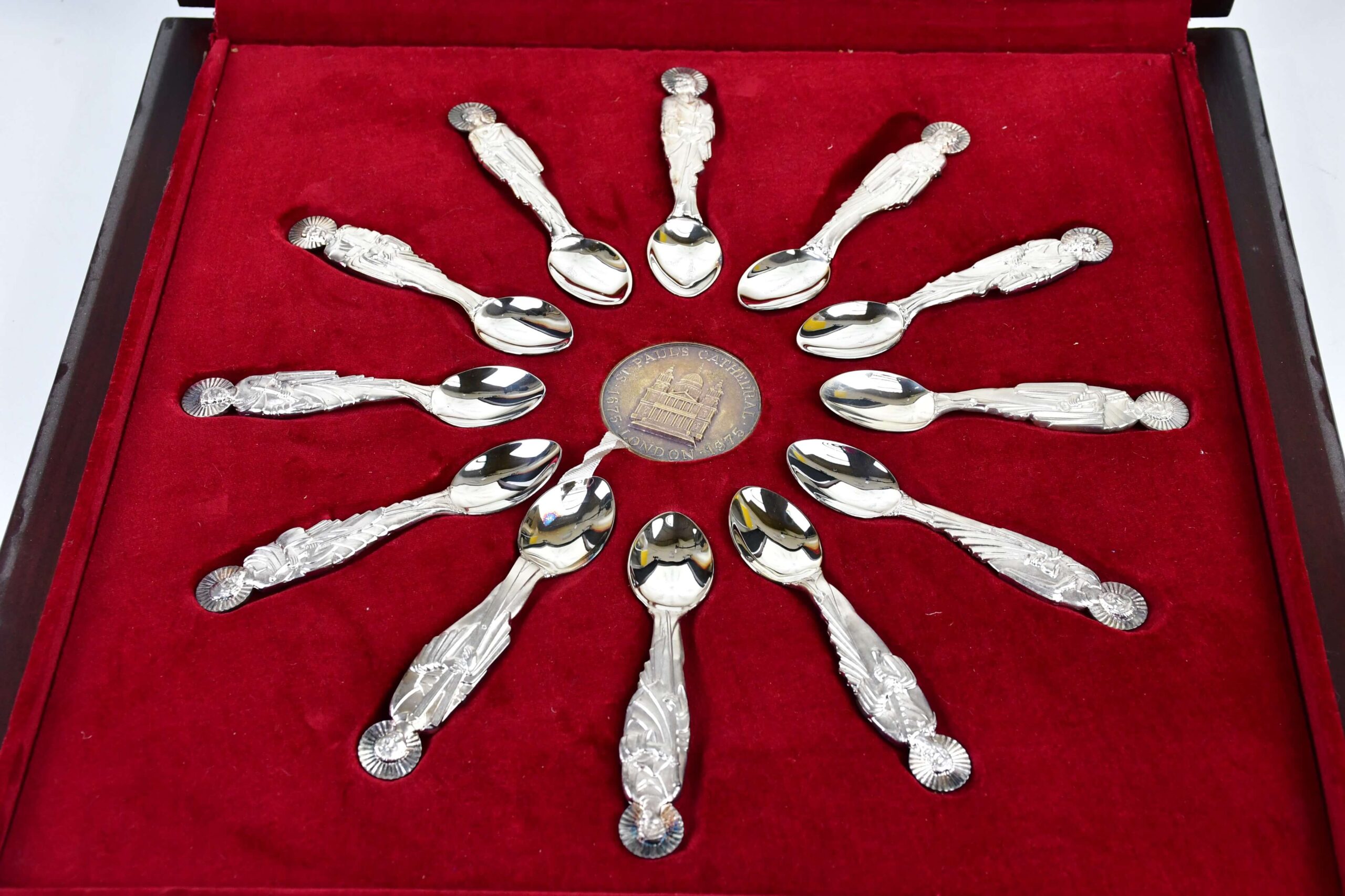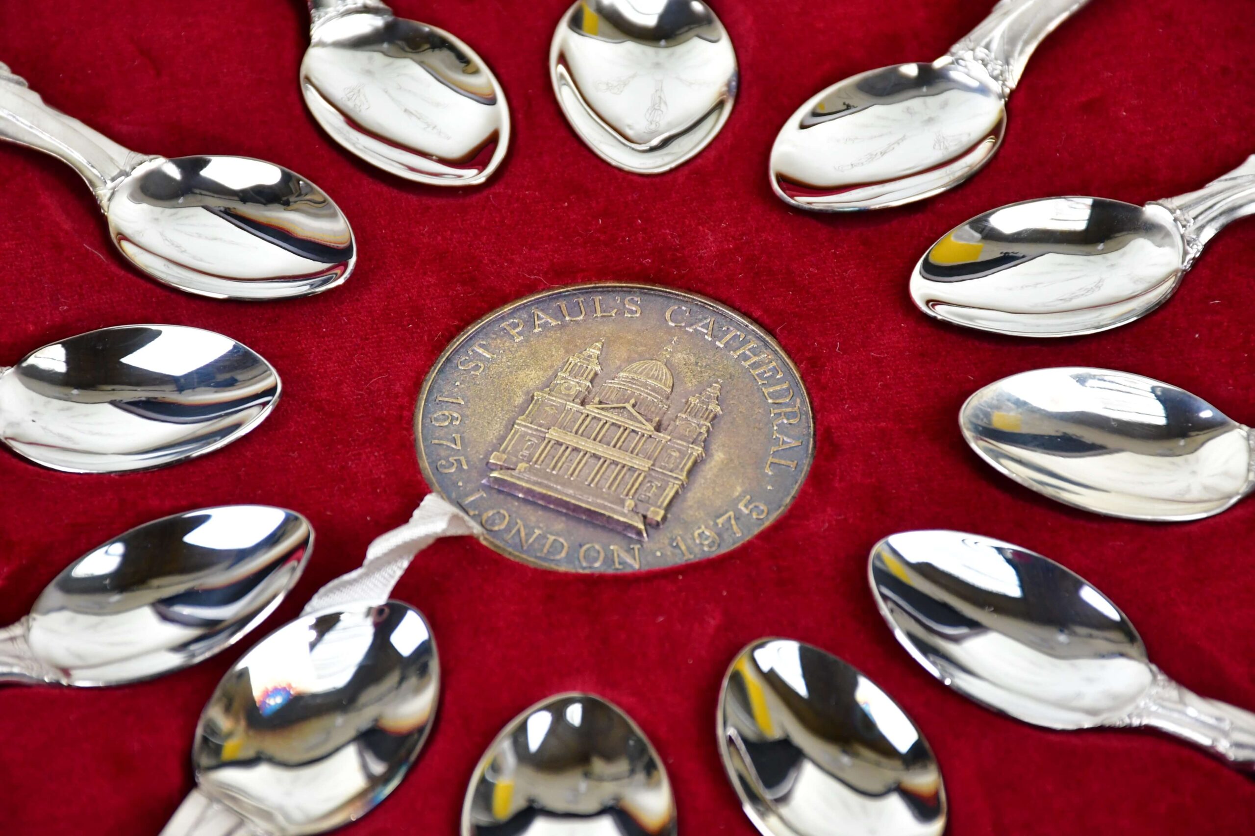 Löffelset mit 12 Apostellöffeln zum Jubiläum der St.-Pauls-Kathedrale London 1675–1975, Nr. 0631/2500, mit silberner Medaille aus Sterlingsilber, Gesamtgewicht 51,8 g | Set of 12 Apostle Spoons commemorating the 300th Anniversary of St. Paul’s Cathedral London 1675–1975, No. 0631/2500, with central silver medallion in sterling silver, total weight 51.8 g