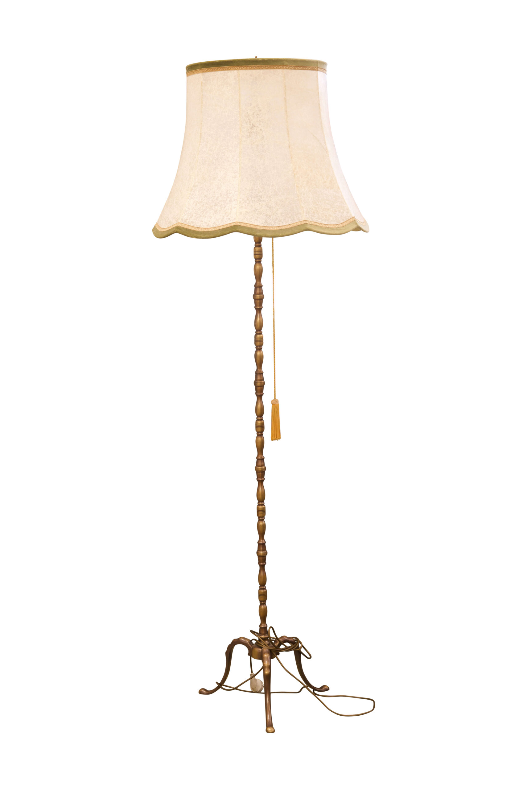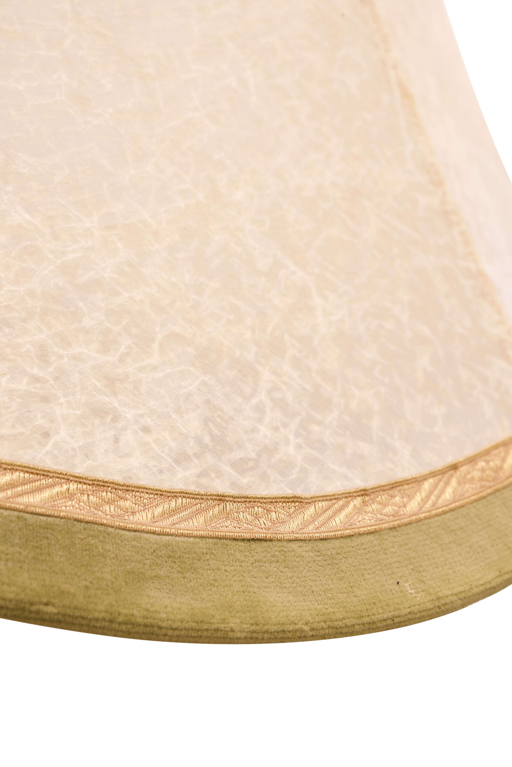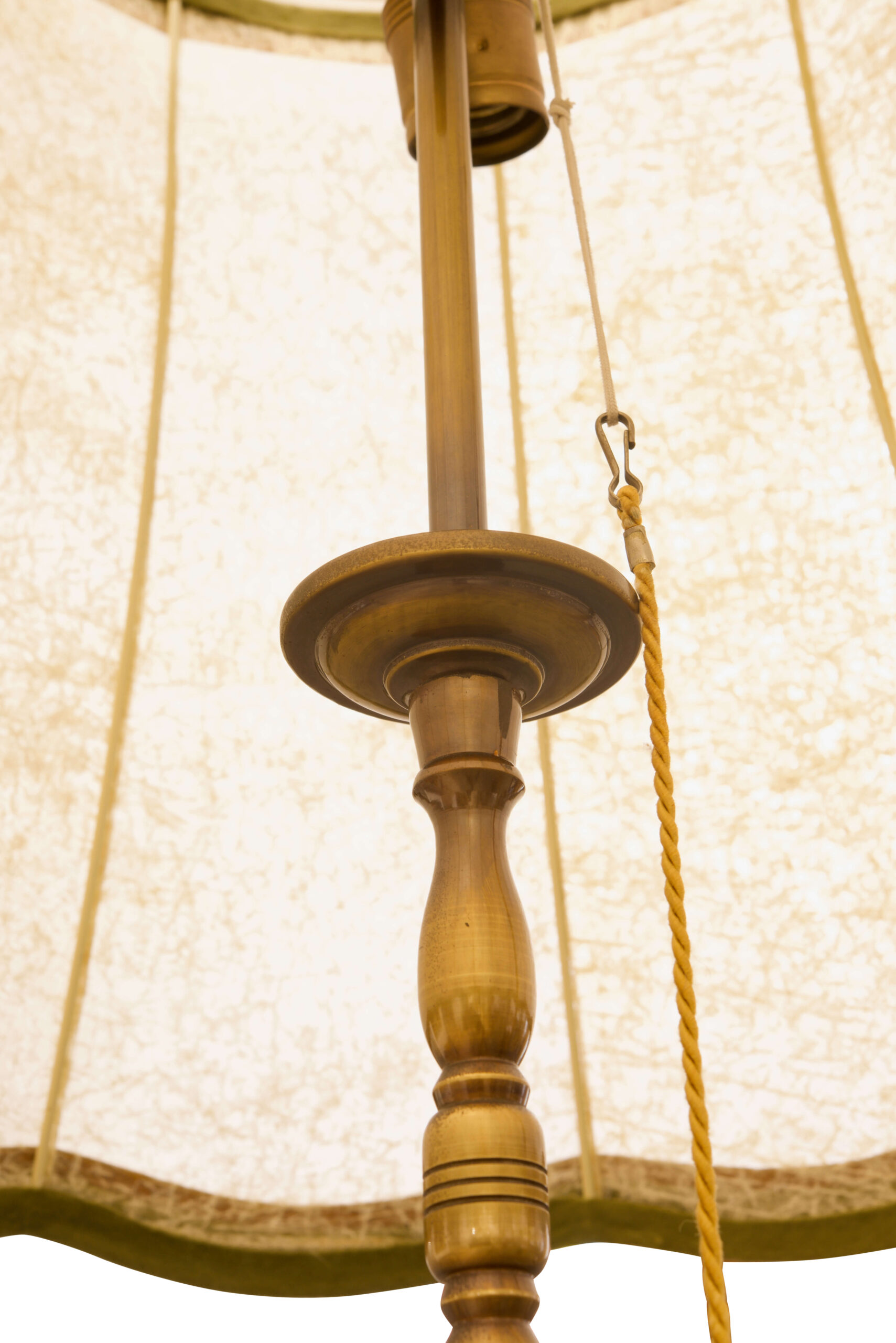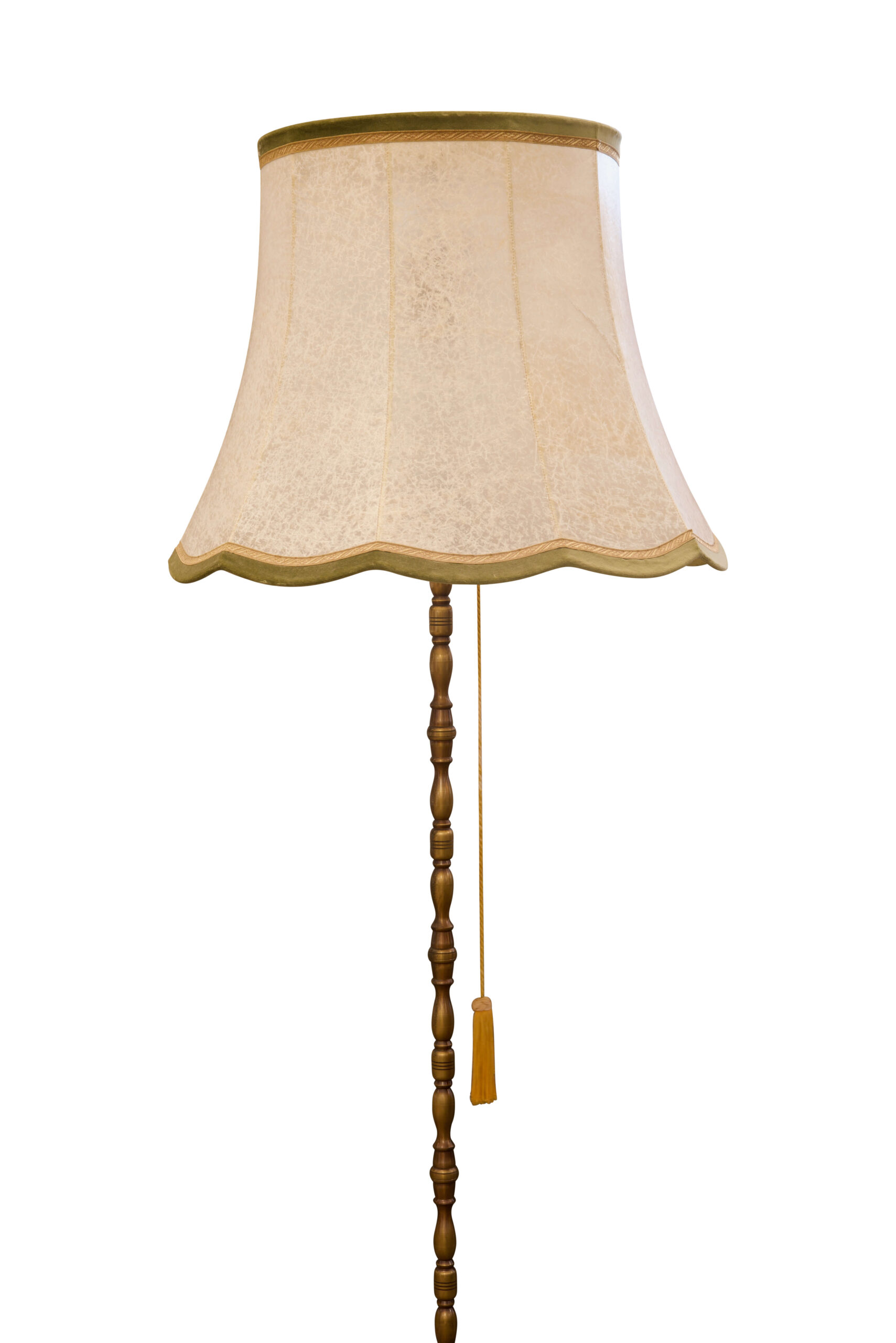 Stehlampe, mit klassischem Stoffschirm in Weiß mit grün-goldener Borte, geschwungene Form mit elegantem Messingfuß, dekoratives Stück im Stil der 1960er Jahre, elektrifiziert, Maße: Höhe 170 cm | Floor Lamp with classic white fabric shade with green and gold trim, curved form with elegant brass base, decorative piece in the style of the 1960s, electrified, dimensions: height 170 cm