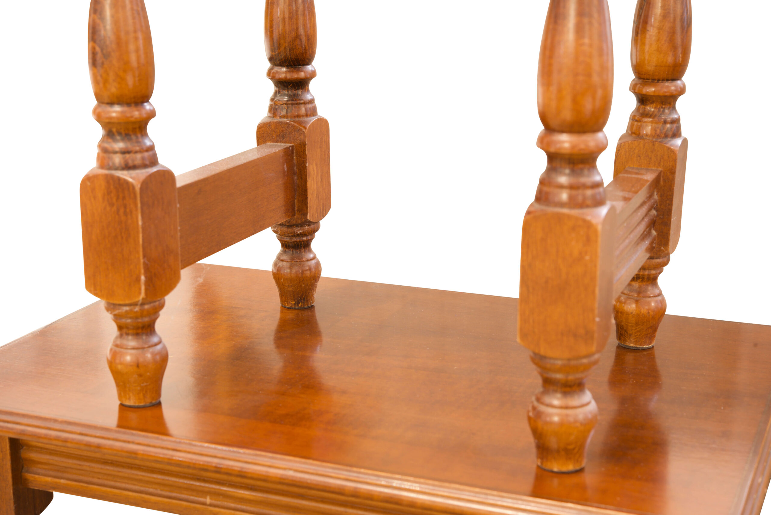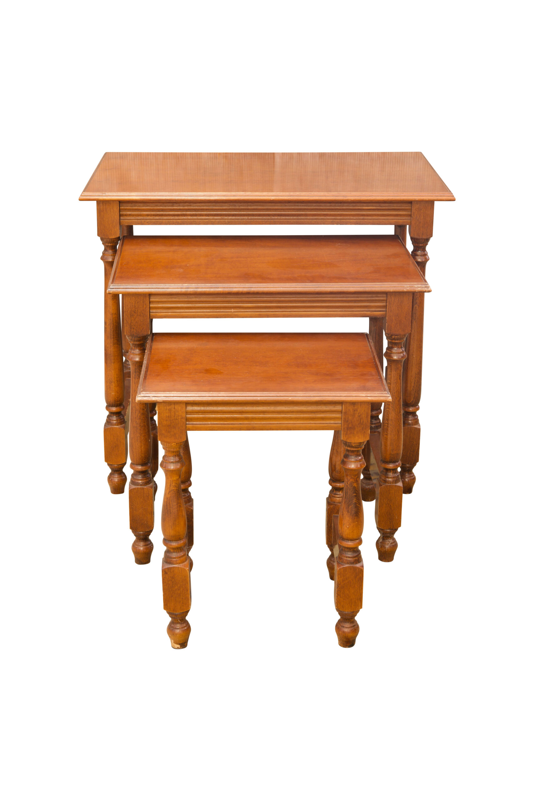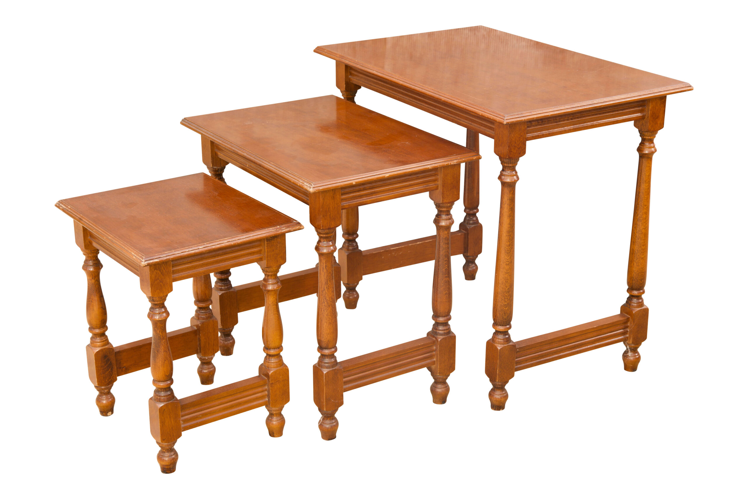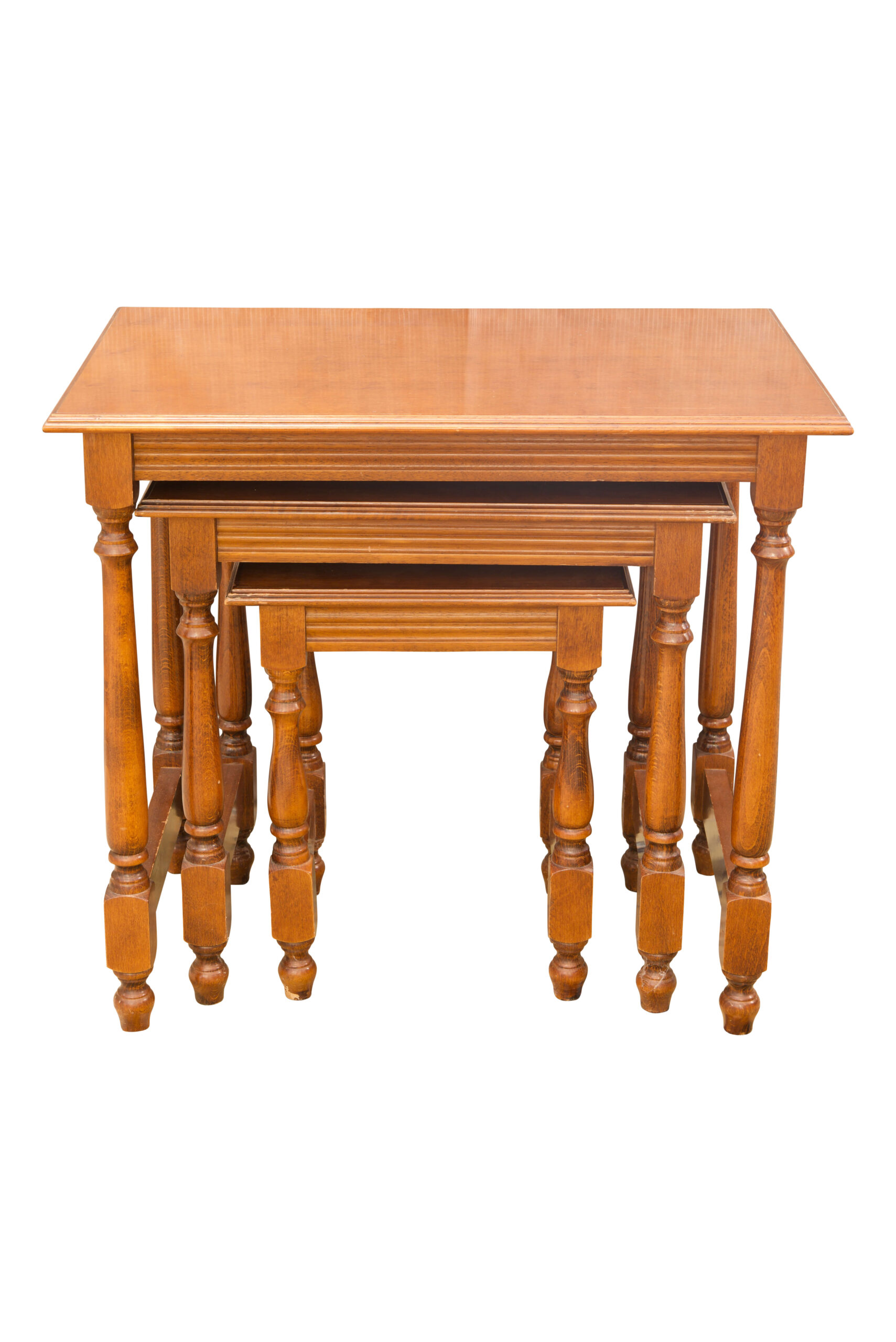 Satztisch, Beistelltisch-Set aus Holz, bestehend aus drei ineinander schiebbaren Tischen, mit gedrechselten Beinen und polierter Oberfläche, praktisches und dekoratives Ensemble, Maße aller Tische einzeln: Höhe 55cm, Breite 40 cm, Länge 61cm, Höhe 47 cm, Breite 32cm, Länge 47 cm, Höhe 39cm, Länge 27,5cm, Breite 33 cm | Nest Of Tables, wooden side table set consisting of three stackable tables with turned legs and polished surfaces, practical and decorative ensemble, individual table dimensions: height 55 cm, width 40 cm, length 61 cm; height 47 cm, width 32 cm, length 47 cm; height 39 cm, width 33 cm, length 27.5 cm