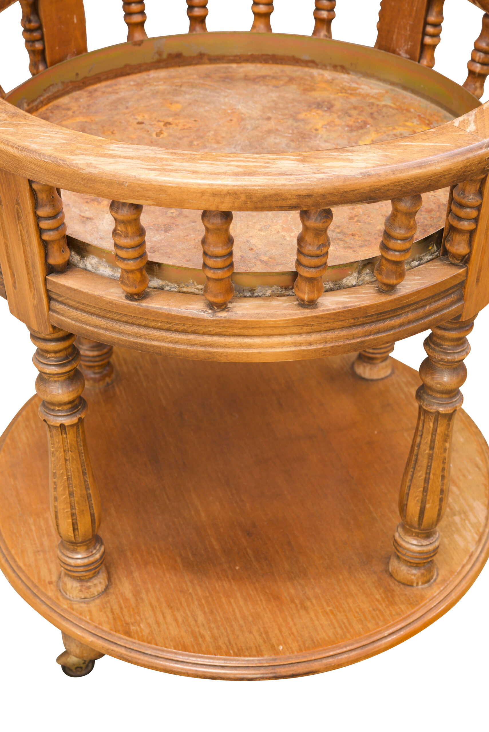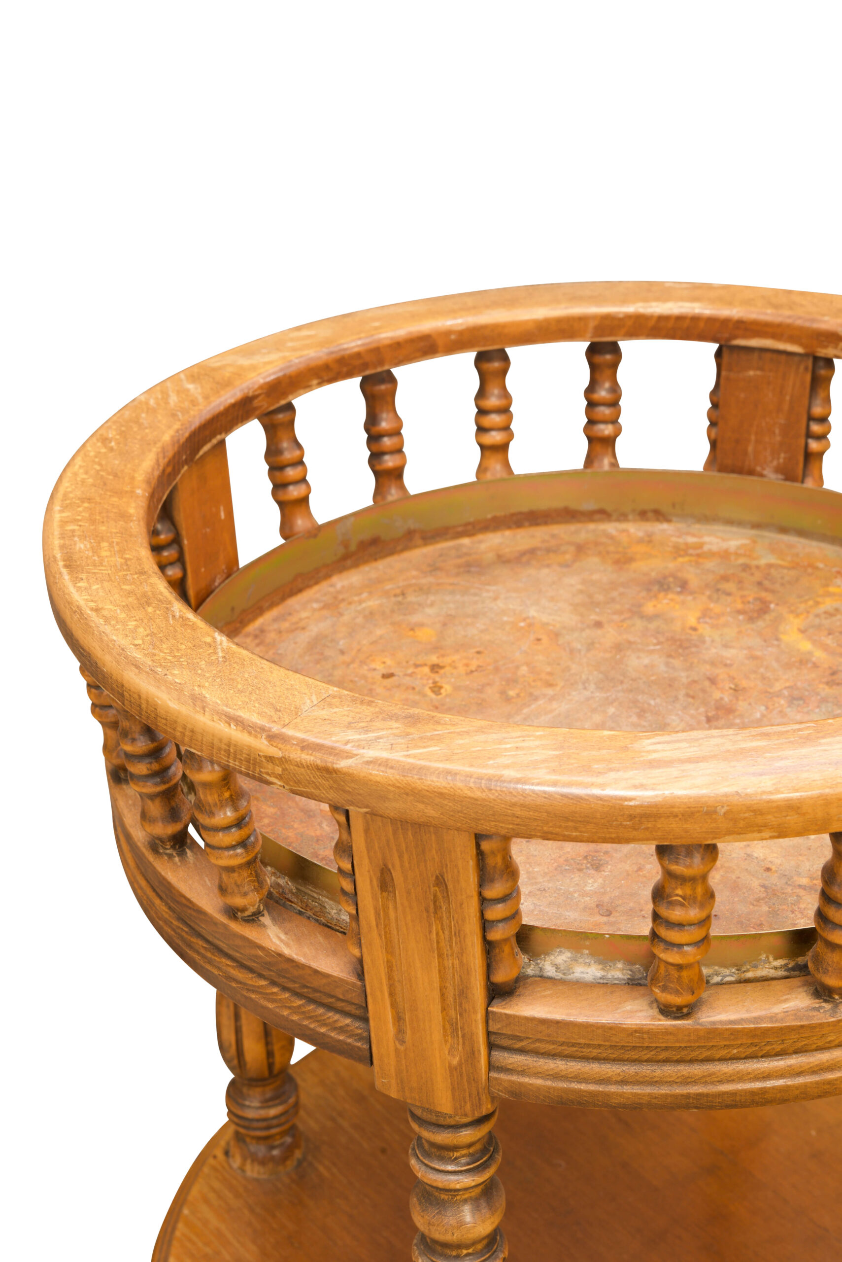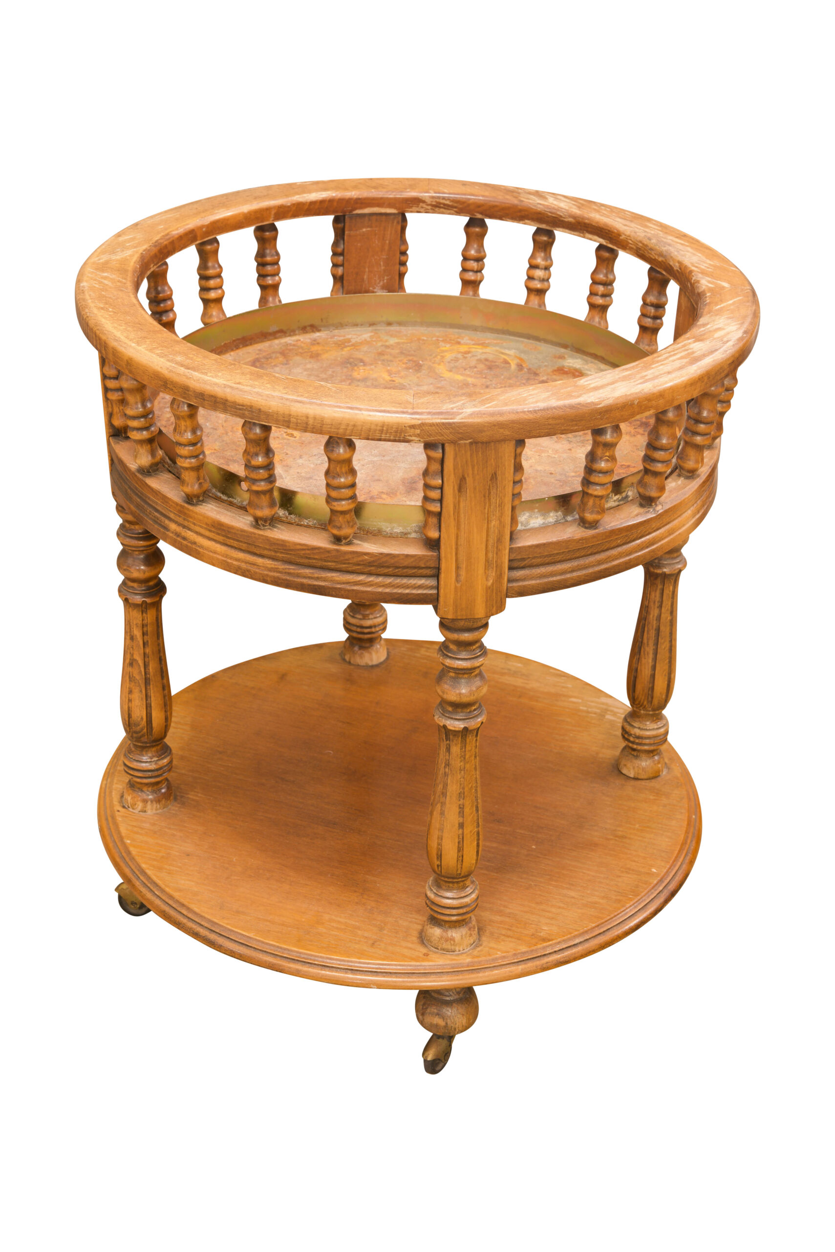 Runder Servier- oder Flaschentisch, aus Holz, mit zwei Ebenen und gedrechselten Streben, auf Rollen, elegant gearbeitet und vielseitig einsetzbar als Barwagen oder Beistelltisch, Maße: Höhe 61cm, Durchmesser 54 cm | Round Serving Or Bottle Table made of wood, with two tiers and turned supports, on casters, elegantly crafted and versatile, usable as bar cart or side table, dimensions: height 61 cm, diameter 54 cm