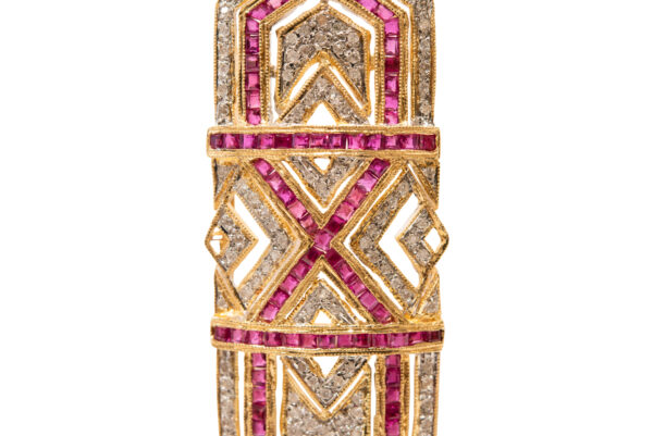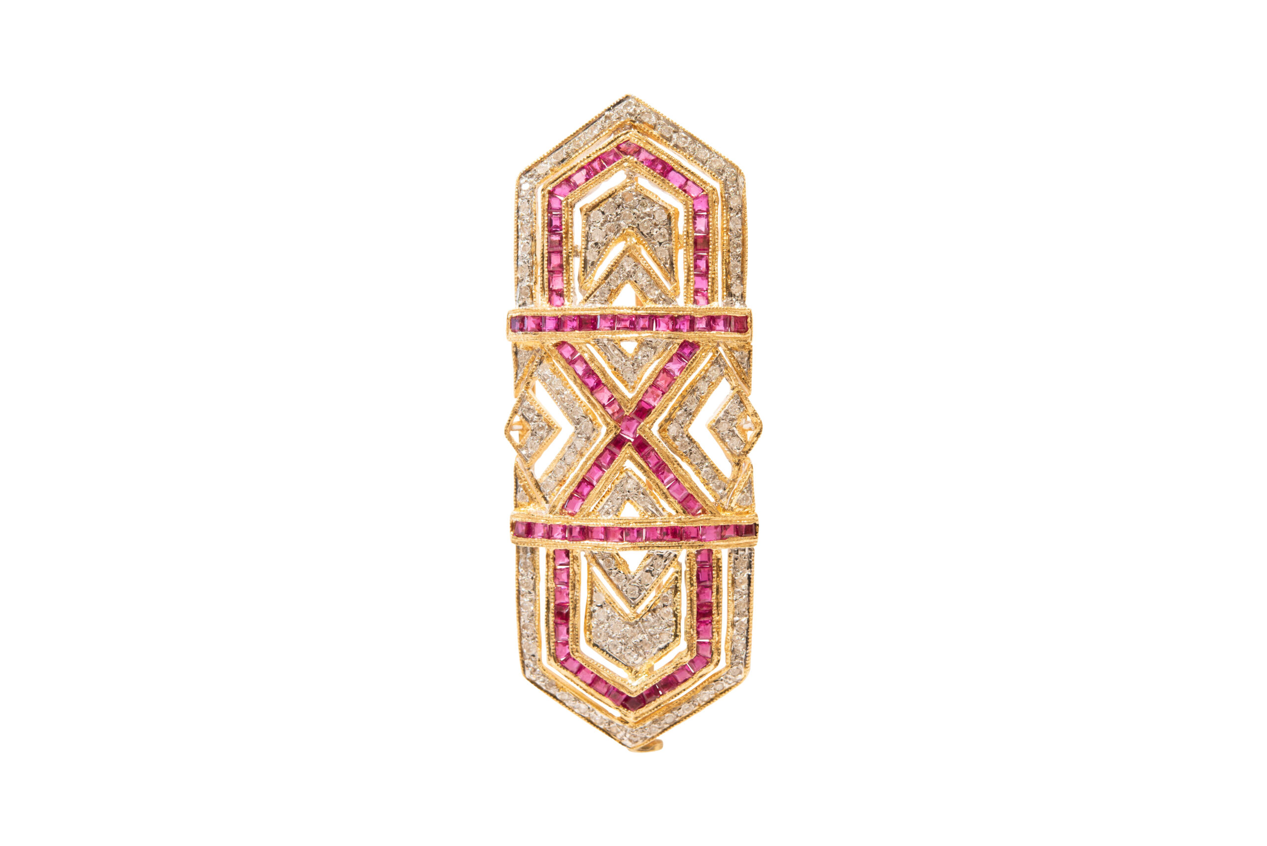Brosche Gelbgold und Weißgold 750/fein mit Achtkant-Diamant, zusammen ca. 0,732 ct und Rubinen, zusammen ca. 1,74 ct, Gesamtgewicht 15 g, Maße: ca. 56 x 22 mm | Brooch yellow gold and white gold 750/fine with octagonal diamonds, together approx. 0.732 ct and rubies, together approx. 1.74 ct, total weight 15 g, dimensions: approx. 56 x 22 mm