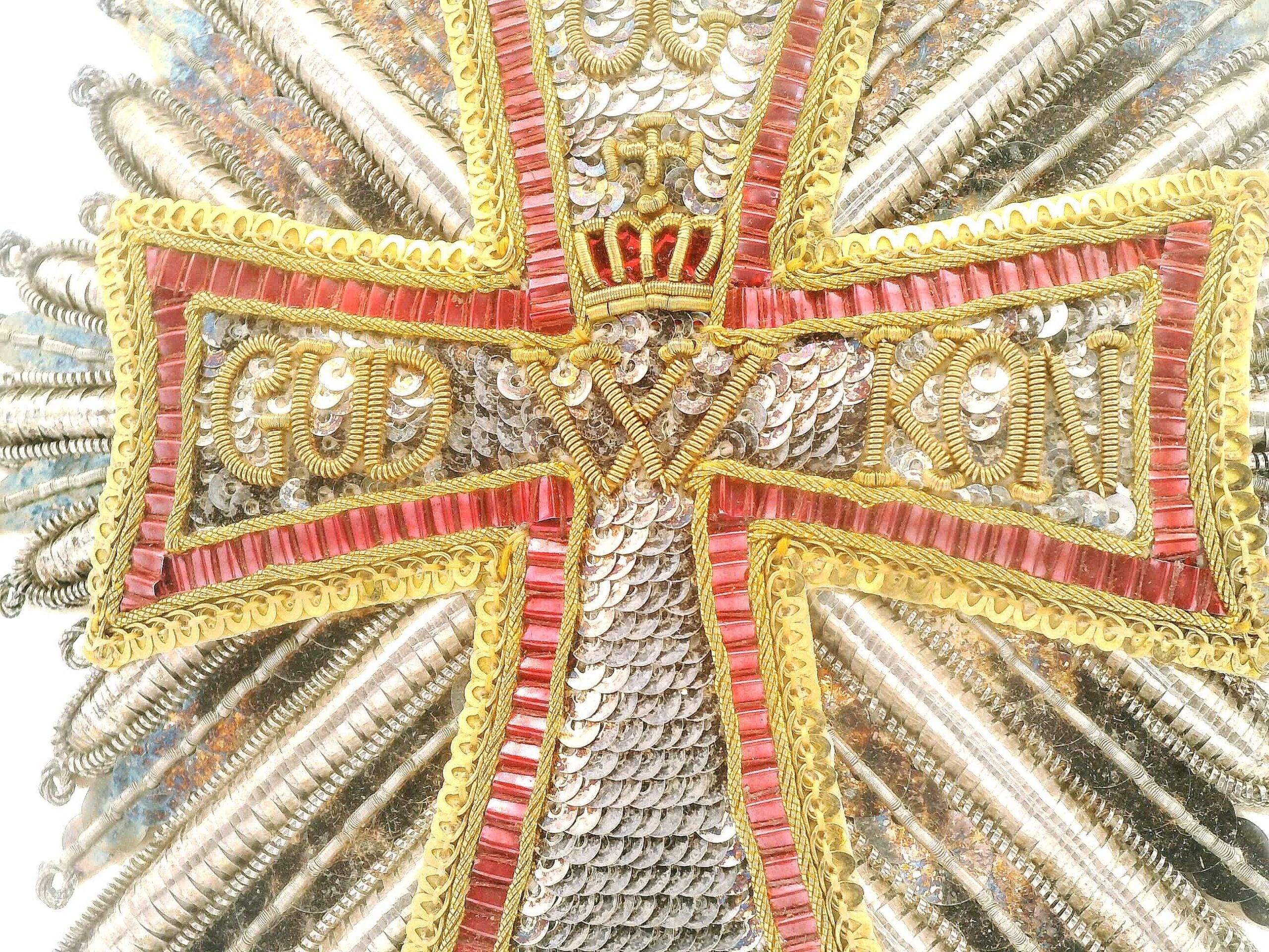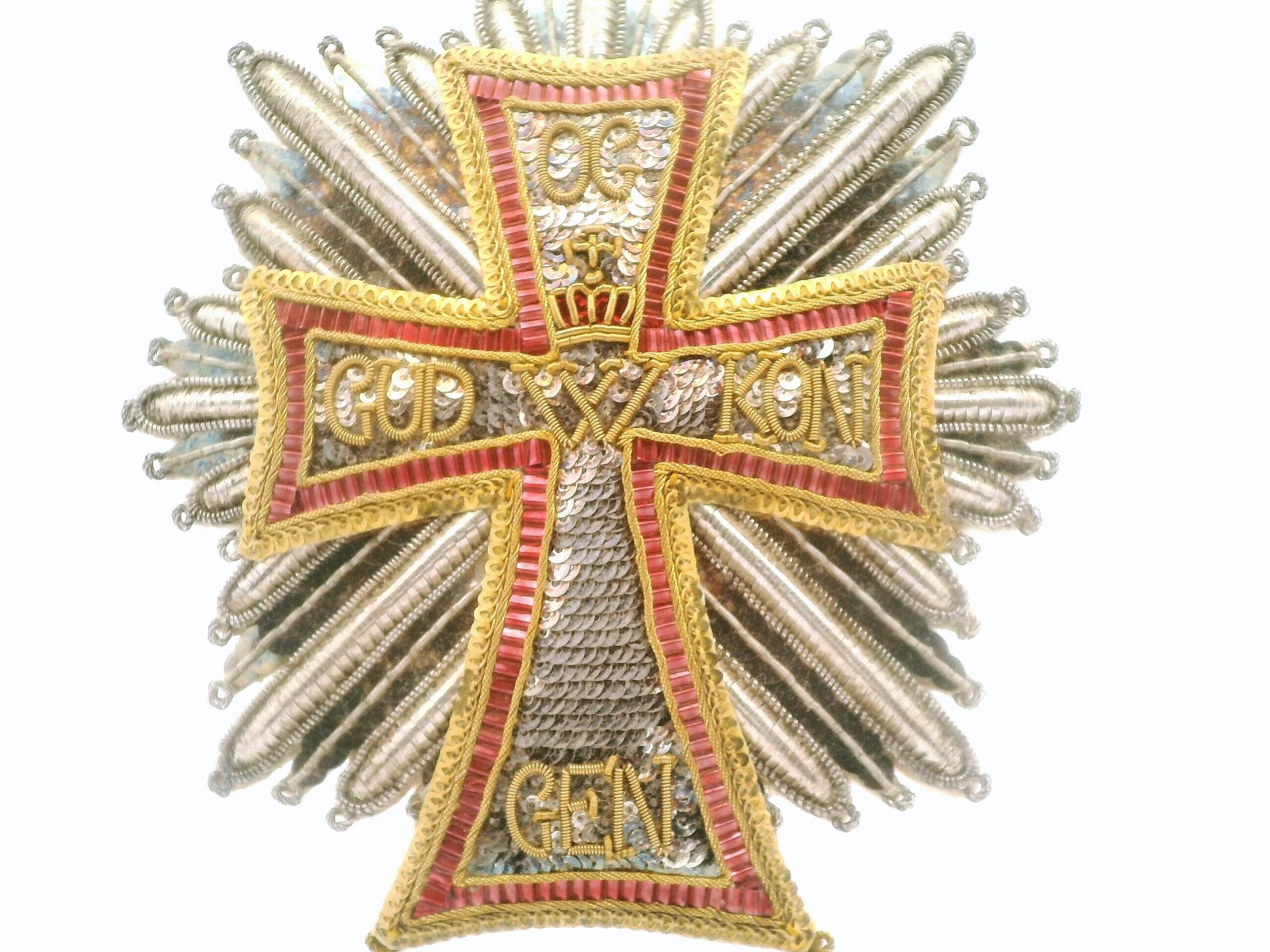 Der Dannebrog-Orden für Graf Maurice Joseph Dietrichstein – Großkreuzstern, auf Stoffunterlage, 90 mm x 100 mm. Kreuz bestickt mit Golddraht, silbernen und goldenen Pailletten, rot gefärbten Silberrippen, alles überlagert von silbernen Strahlen, bestickt mit Silberdraht und silbernen Pailletten. Stern von hervorragender Qualität, ausgezeichnete Details und Qualität, um 1850. Name des Herstellers auf der Rückseite, fast neuwertiger Zustand. Mit originaler Papierverpackung. Ein vollständiges Exemplar. | The Order of Dannebrog for Count Maurice Joseph Dietrichstein – Grand Cross Star, mounted on fabric backing, measuring 90 mm × 100 mm. The cross is embroidered with gold wire, silver and gold sequins, and red-dyed silver ribs, all overlaid with silver rays embroidered with silver thread and sequins.