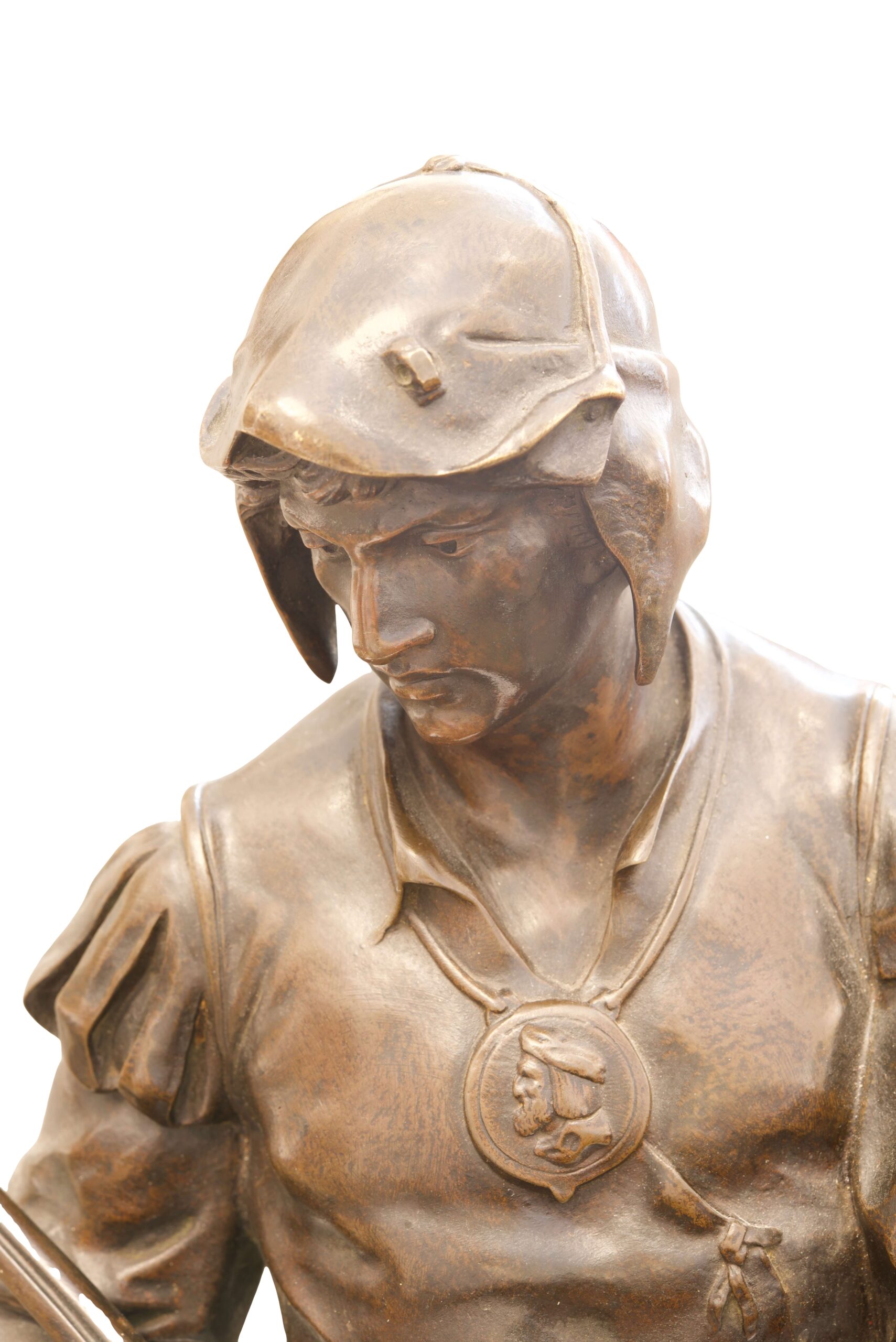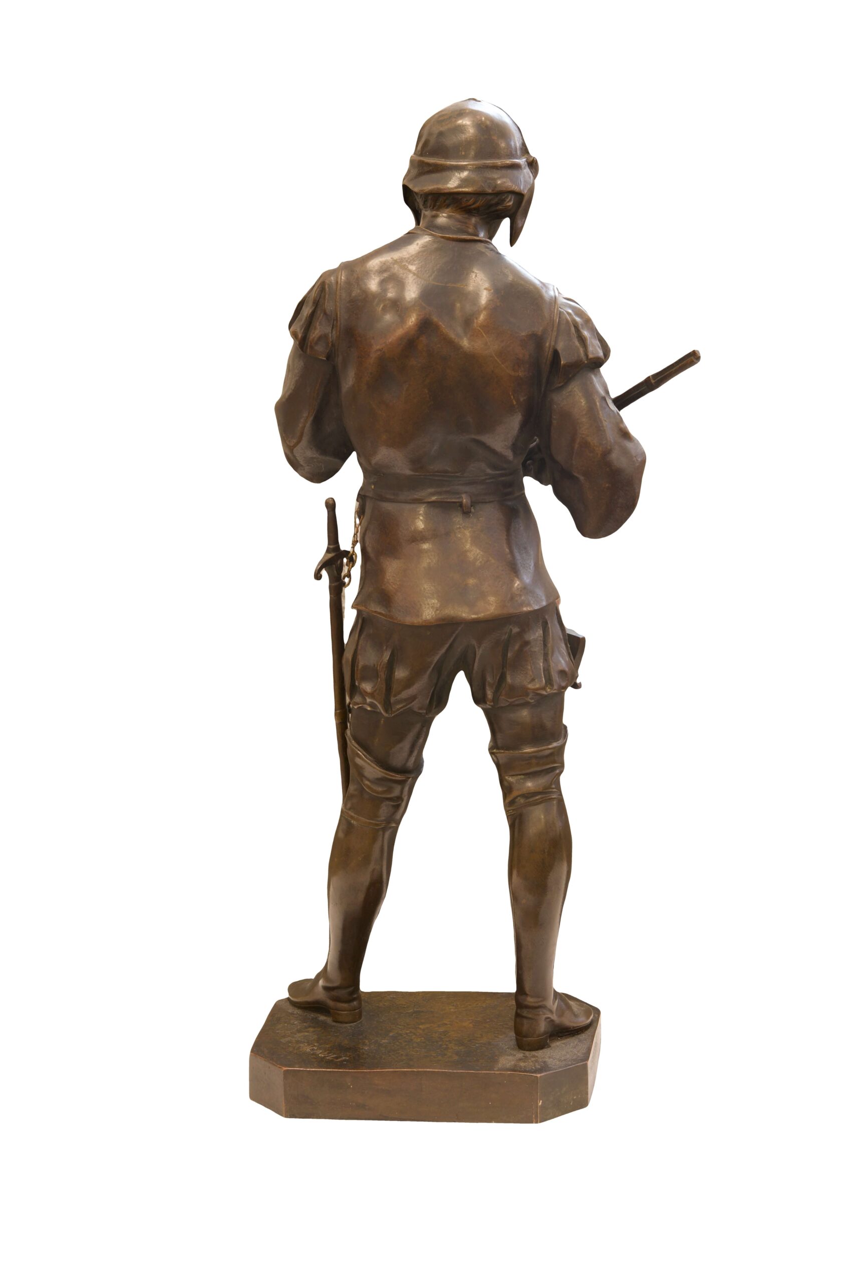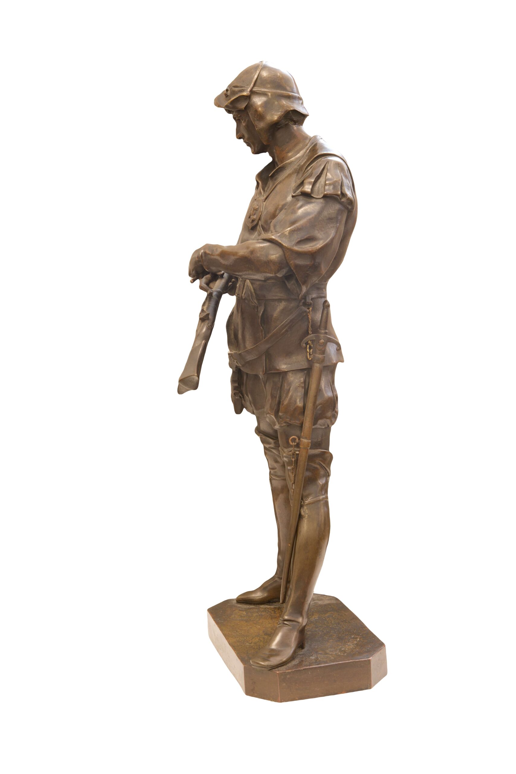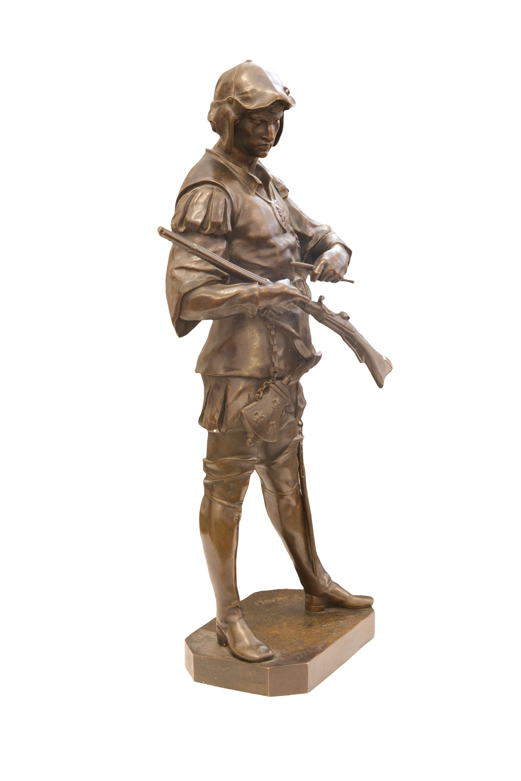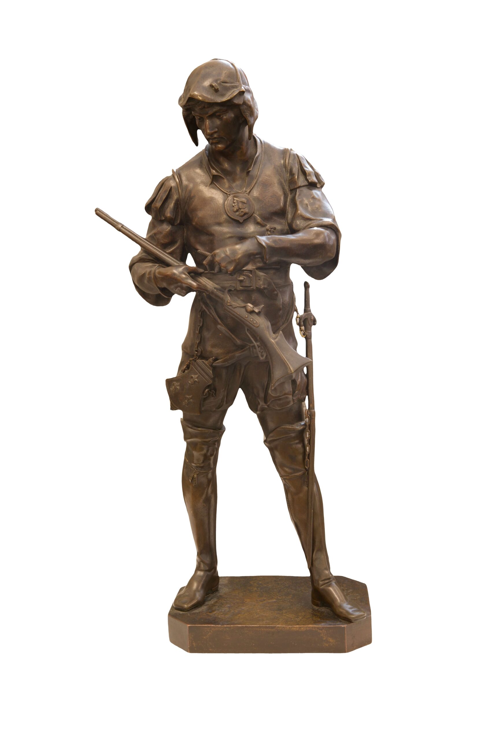 Soldat au mousquet – Bronzeplastik eines Soldaten mit Musketenbüchse, inspiriert von einem Entwurf Émile Picaults, signiert E., mit fein ausgearbeiteten Details an Rüstung, Kleidung, Helm und Medaillon, ca. 58 cm hoch | Soldat Au Mousquet – bronze sculpture of a soldier with musket, inspired by a design by Émile Picault, signed E., with finely detailed armor, clothing, helmet and medallion, approx. 58 cm high