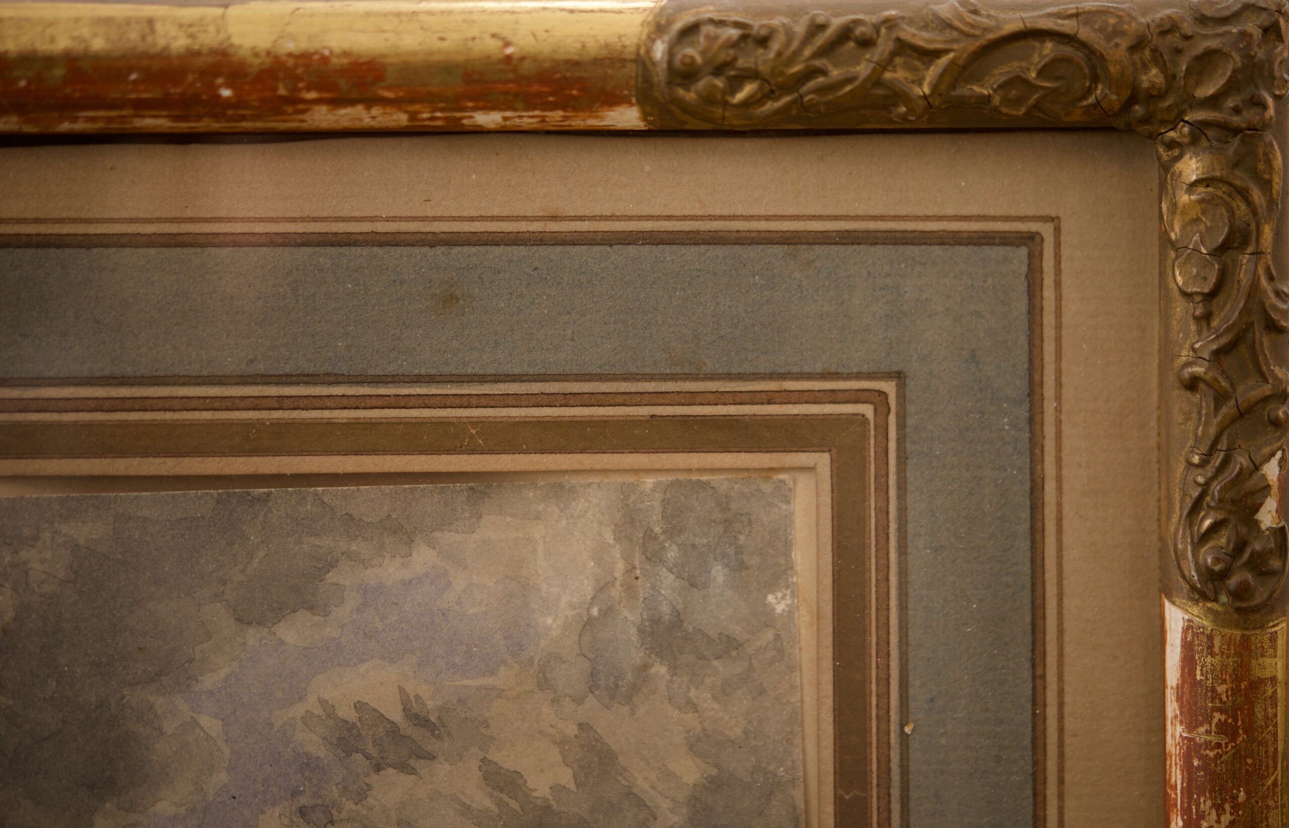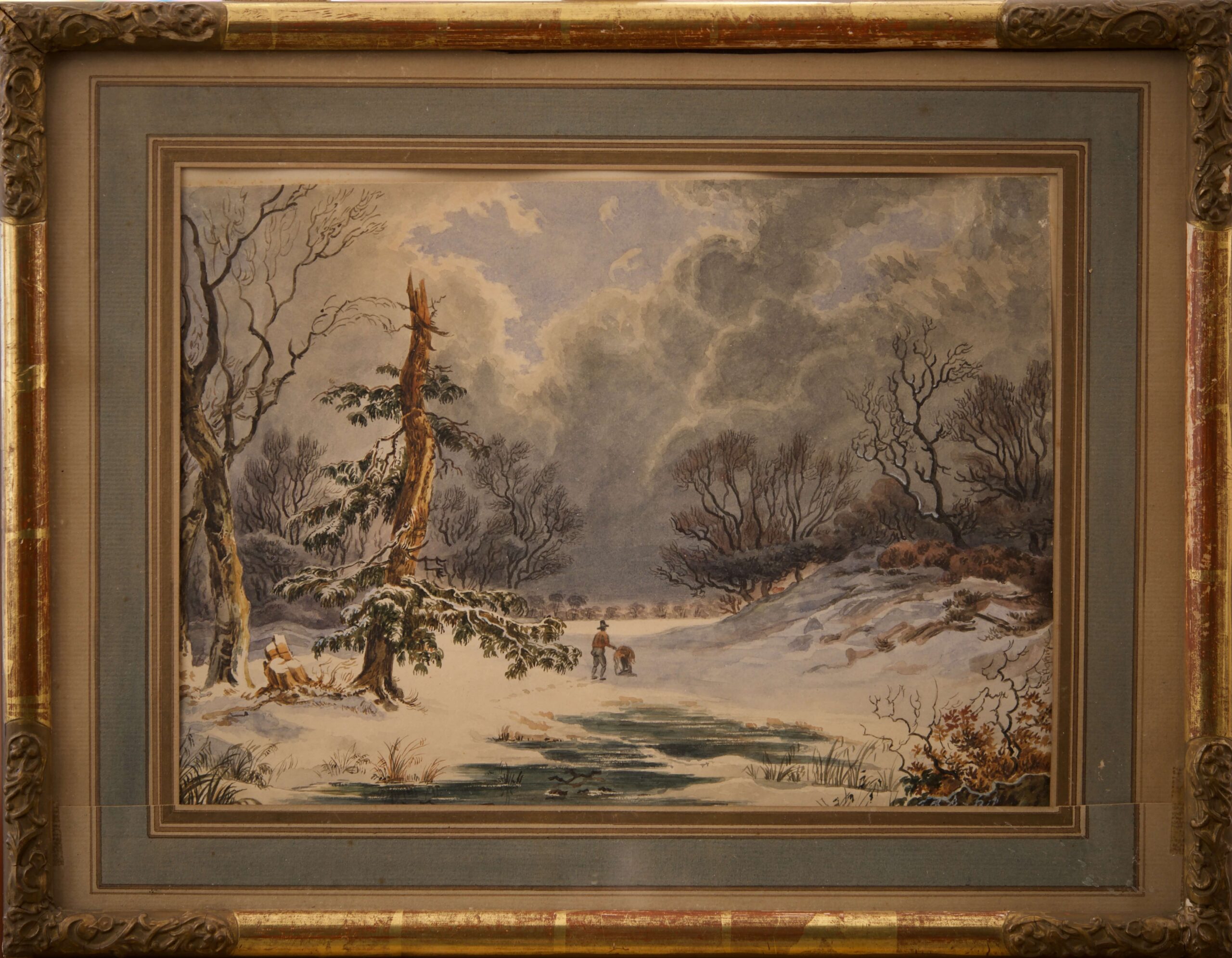 Winter Landscape with Lake and People, watercolor on paper, framed, slightly damaged, dimensions: 34.5 x 45 cm | Winterliche Landschaft Aquarell auf Papier, gerahmt, leicht bestoßen, Maße: 34,5 x 45 cm