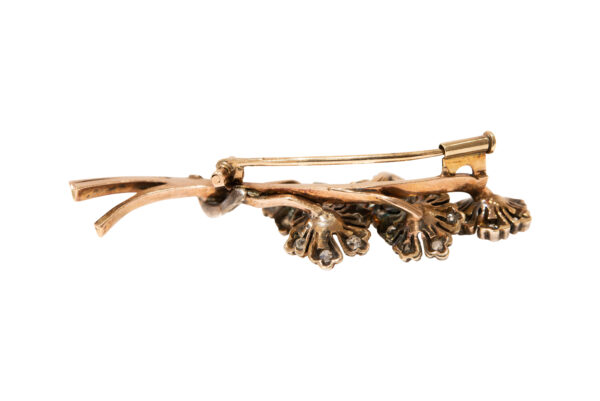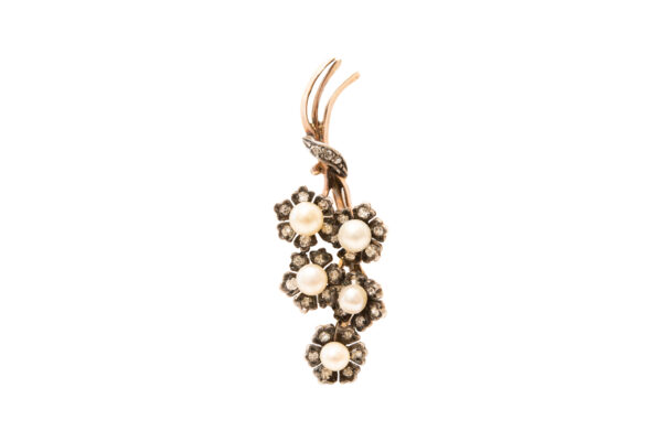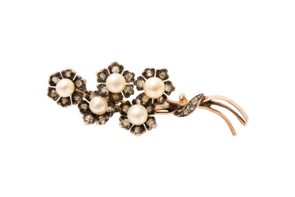 Brosche aus Gelbgold 585/fein und Silber 800/fein mit Diamanten im Achtkantschliff, zusammen ca. 0,95 ct, und 5 Akoya-Zuchtperlen, ca. 4,5-5 mm Durchmesser, Gesamtgewicht 6,6 g | Brooch in yellow gold 585/fine and silver 800/fine with octagonal-cut diamonds, together approx. 0.95 ct, and 5 Akoya cultured pearls, approx. 4.5-5 mm in diameter, total weight 6.6 g