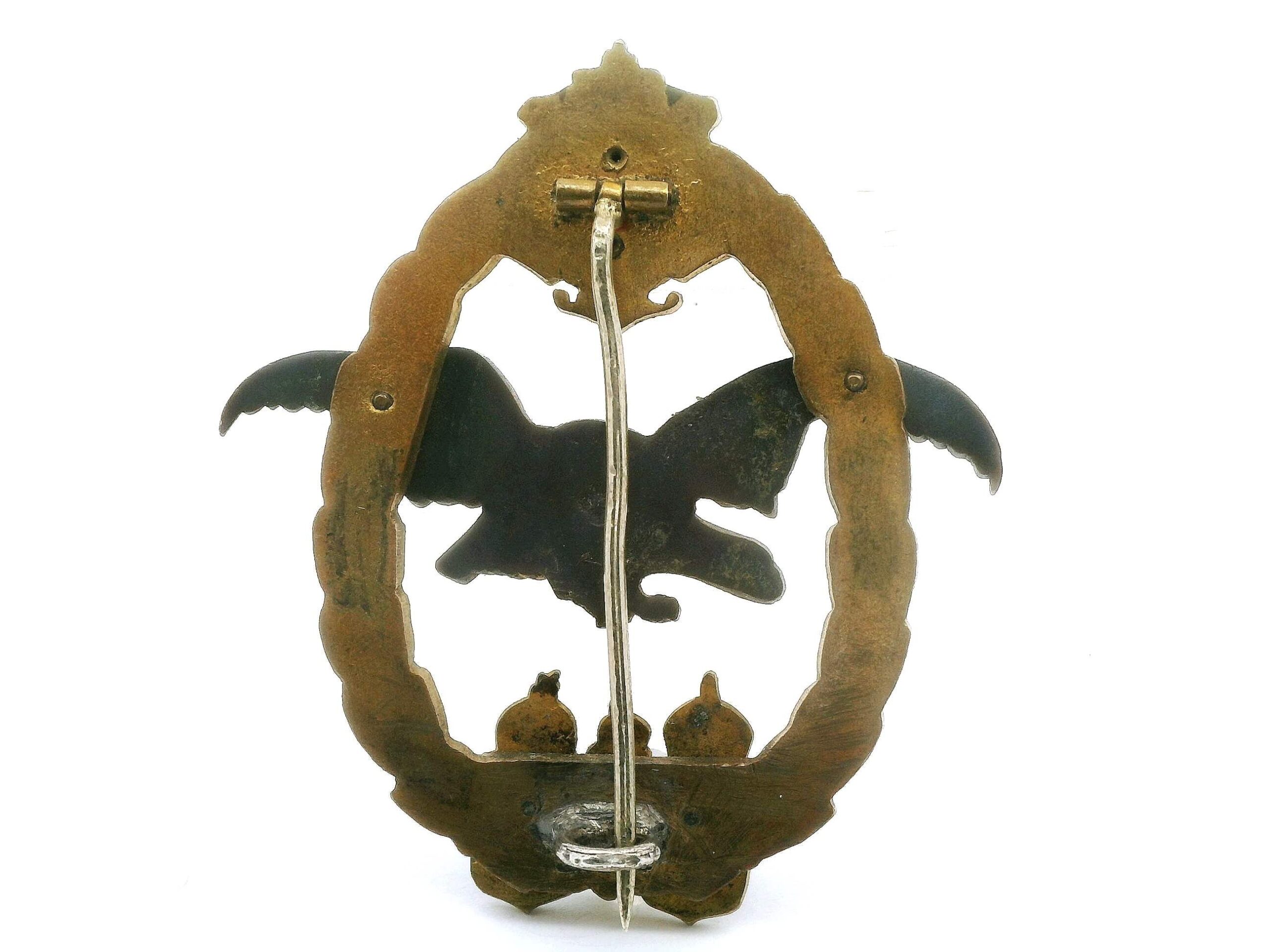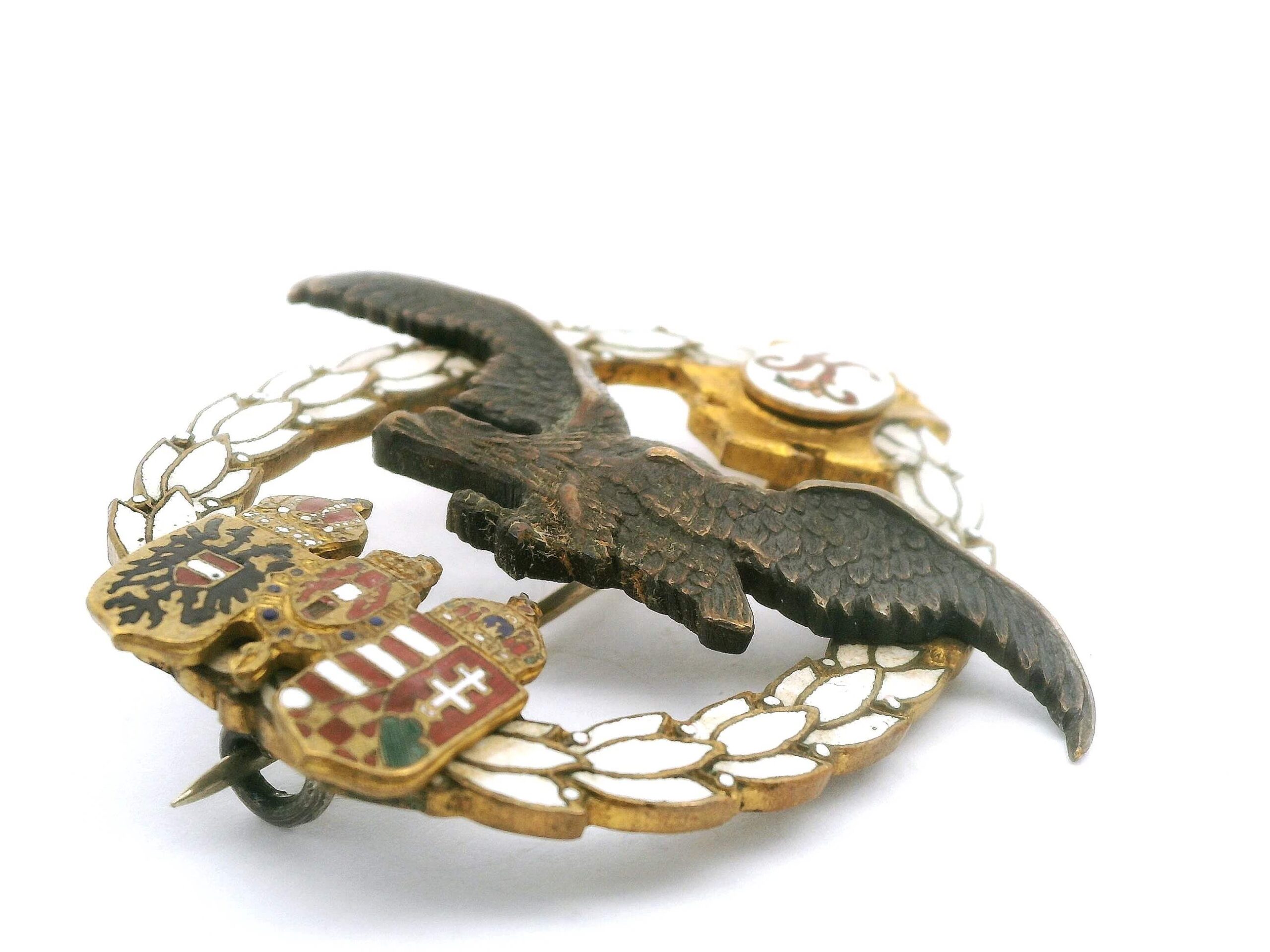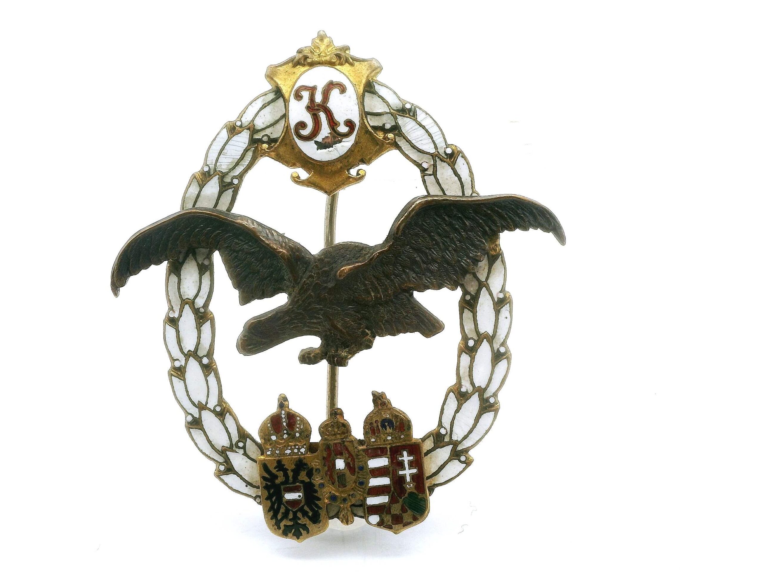 Spätes Abzeichen aus der Zeit des Ersten Weltkriegs, in zweiteiliger Ausführung, bestehend aus einem fein patinierten bronzenen Adler mit vergoldeten Blitzbündeln in den Fängen, befestigt mit zwei Nieten auf einem offenen ovalen Lorbeerkranz mit weißer Emaille. Am oberen Rand des Kranzes befindet sich ein weiß emailliertes Schild mit dem schwarzen Monogramm Kaiser Karls I., während die Unterseite mit dem Wappen der k.u.k. Monarchie verziert ist. Die Rückseite ist glatt und mit senkrechter Nadel versehen, unsigniert. Geringe Emailleverluste am Kranz, Haken mit zeitgenössischer Reparatur, insgesamt in getragenem, aber ansprechendem Zustand. Maße 55 × 57 mm. | Late First World War badge of two-piece construction, featuring a finely patinated bronze eagle clutching gilt lightning bolts, affixed by two rivets to an openwork oval laurel wreath with white enamel finish. At the top of the wreath sits a white-enamelled shield bearing the black-enamelled cipher of Emperor Karl I, while the base is adorned with the coat of arms of the Austro-Hungarian Empire. The reverse is plain, fitted with a vertical pin assembly, unmarked. Light enamel loss to the wreath, catch with period repair, overall in worn but appealing condition. Measures 55 × 57 mm.