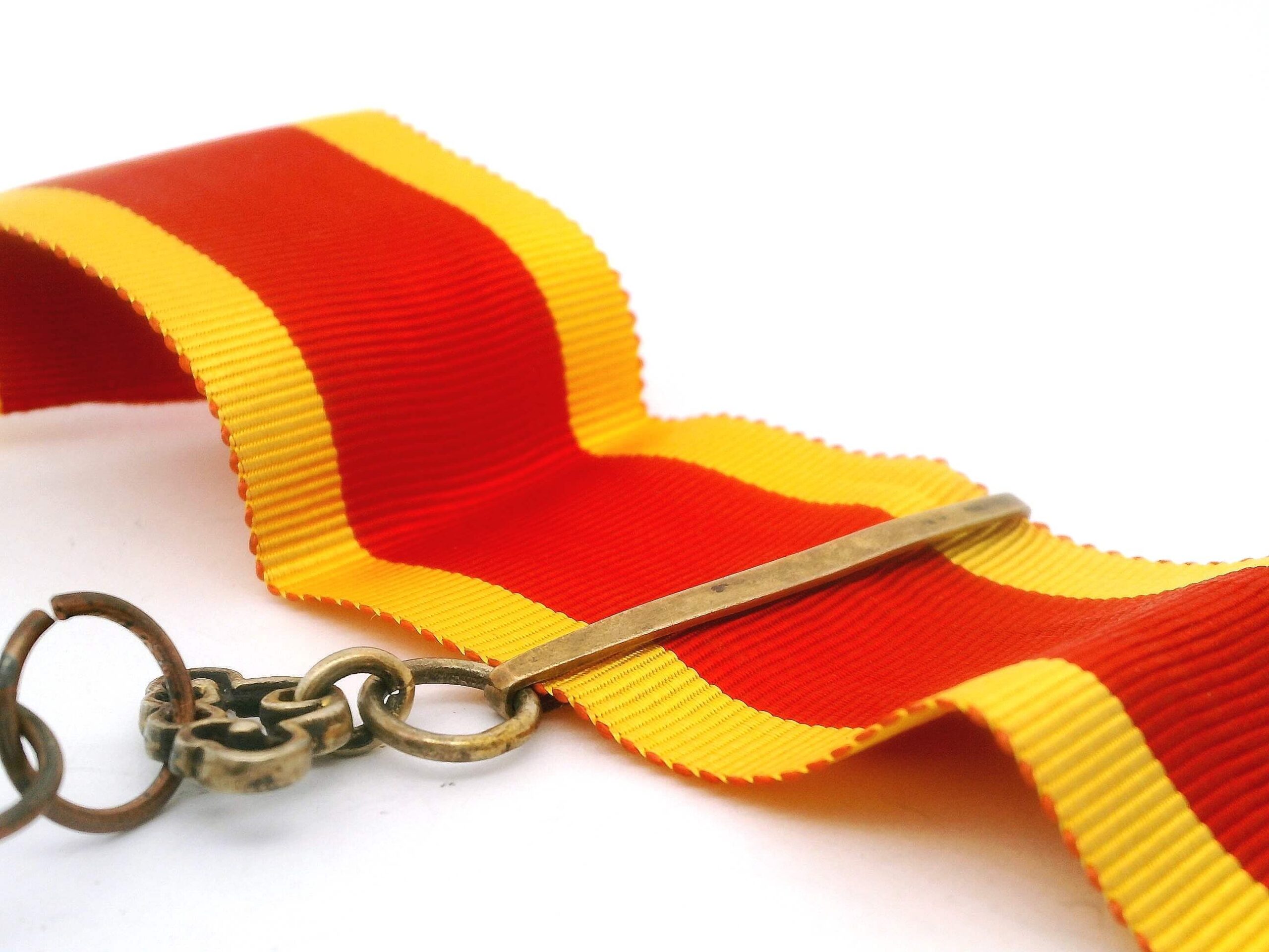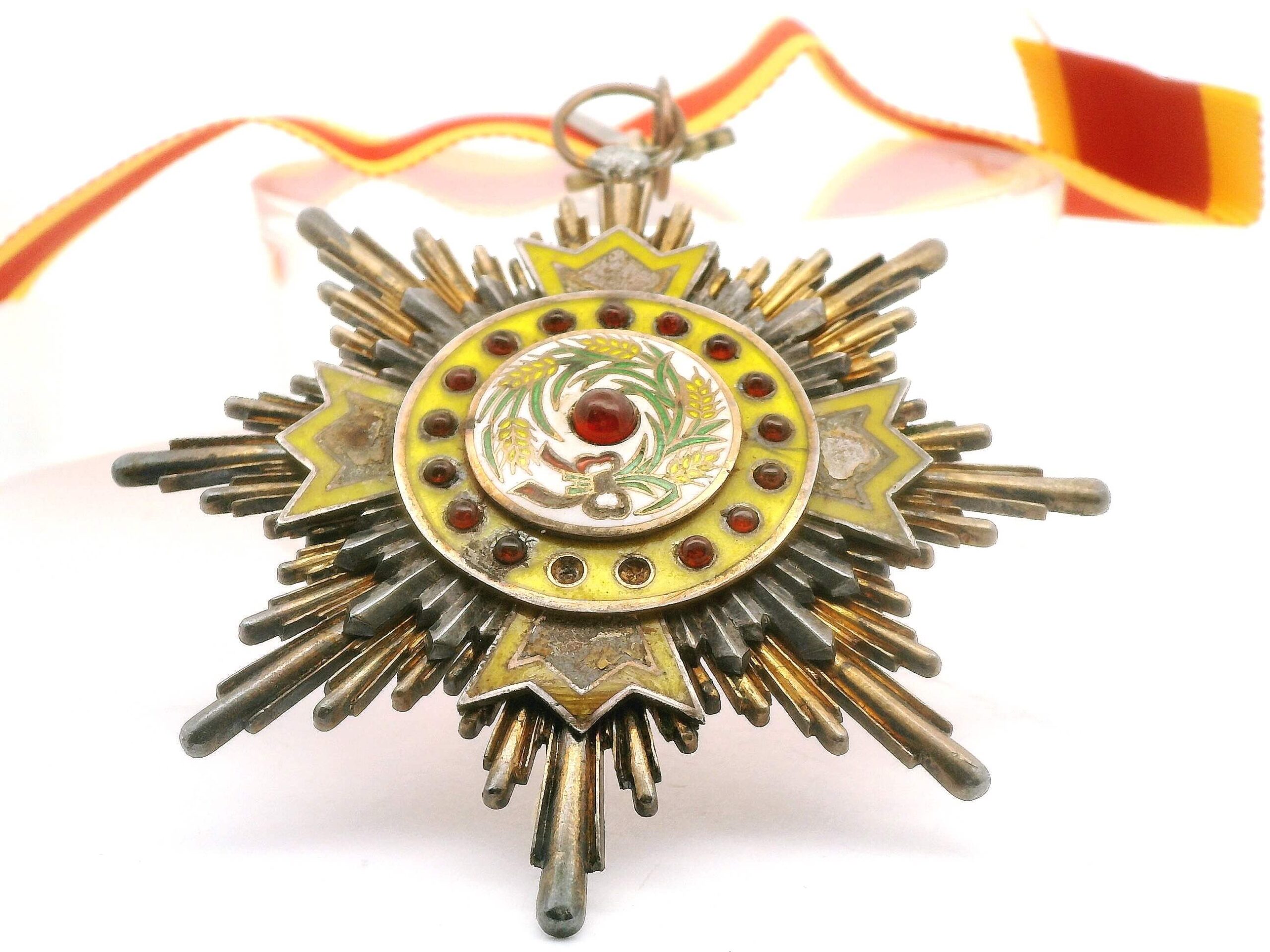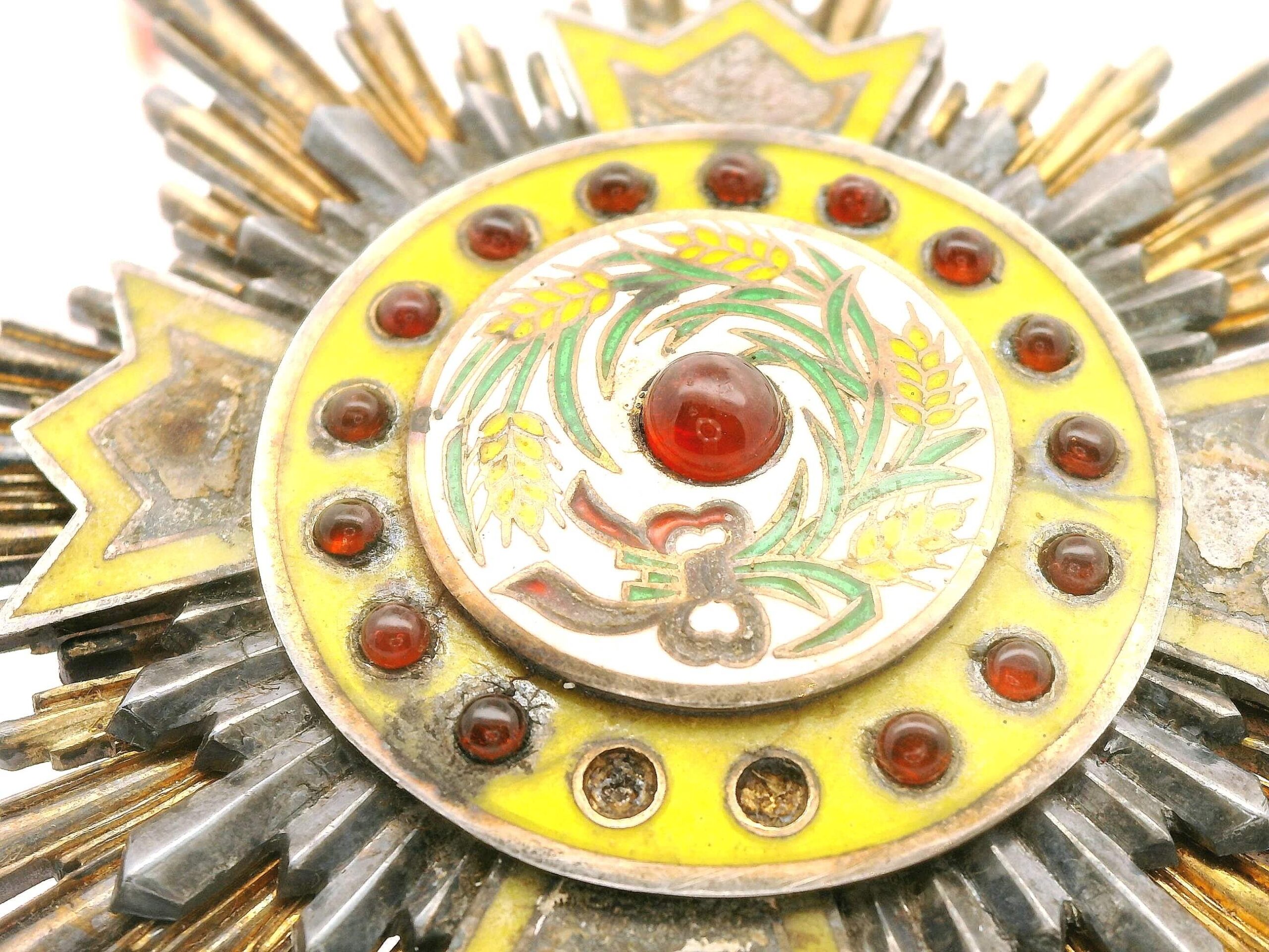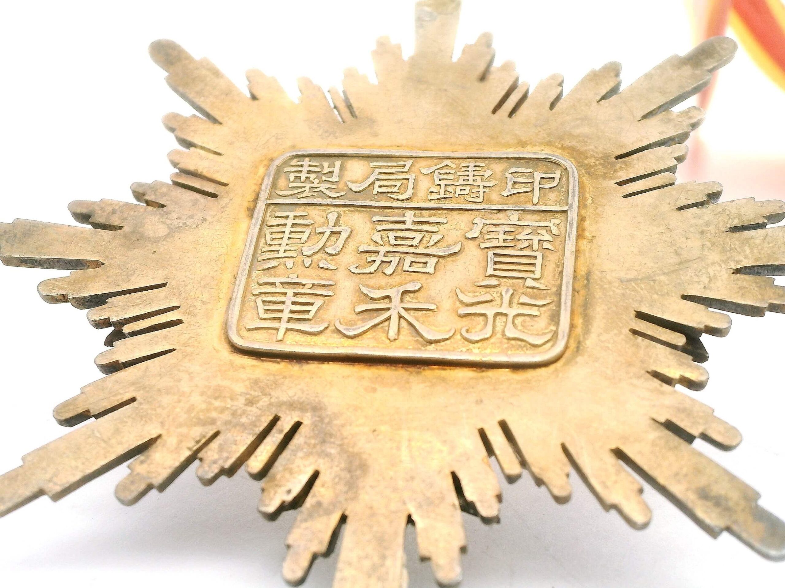 Seltene und eindrucksvolle Ausführung des Ordens des Kostbaren Glänzenden Goldenen Korns („Order of Chia-Ho“ 嘉禾勋章) aus der frühen Republikzeit, um 1915. Der Orden besteht aus einem siebenstrahligen, vergoldeten Silberstern, der von einem vierarmigen, chartreusefarben emaillierten Kreuz überlagert wird. In den Zwischenräumen befinden sich feine Strahlenbündel aus Silber, während das Medaillon im Zentrum einen roten Glasstein zeigt, umgeben von handbemalten goldenen Ähren und einem emaillierten Rand mit siebzehn kleineren roten Glassteinen. Die Rückseite trägt eine zentrale Plakette mit chinesischen Schriftzeichen, die auf die Herstellung durch die Zentralchinesische Münze und den Namen des Ordens verweisen. Das Stück weist den Verlust der ursprünglichen Lorbeeraufhängung auf, stattdessen wurde später ein integrierter Ring ergänzt; kleinere Emailleschäden an den Kreuzarmen, zwei fehlende Glassteine sowie ein leicht loses Mittelfeld. Maße 81,6 × 81,2 mm. | A rare and impressive example of the Order of the Precious Brilliant Golden Grain (“Order of Chia-Ho” 嘉禾勋章) from the early Republican period, circa 1915. The order features a seven-pointed star in silver gilt, overlaid by a four-armed cross with chartreuse enamel. Between the arms are clusters of fine silver rays, while the central medallion displays a red glass paste surrounded by hand-painted golden grain motifs and an enameled border set with seventeen smaller red glass stones. The reverse bears a central plaque inscribed in Chinese characters, indicating manufacture by the Central Chinese Mint and naming the order. The piece shows loss of the original laurel suspension, replaced by an added integral ring; minor enamel losses to the arms, two missing glass stones, and a slightly loose central cross. Measures 81.6 × 81.2 mm.