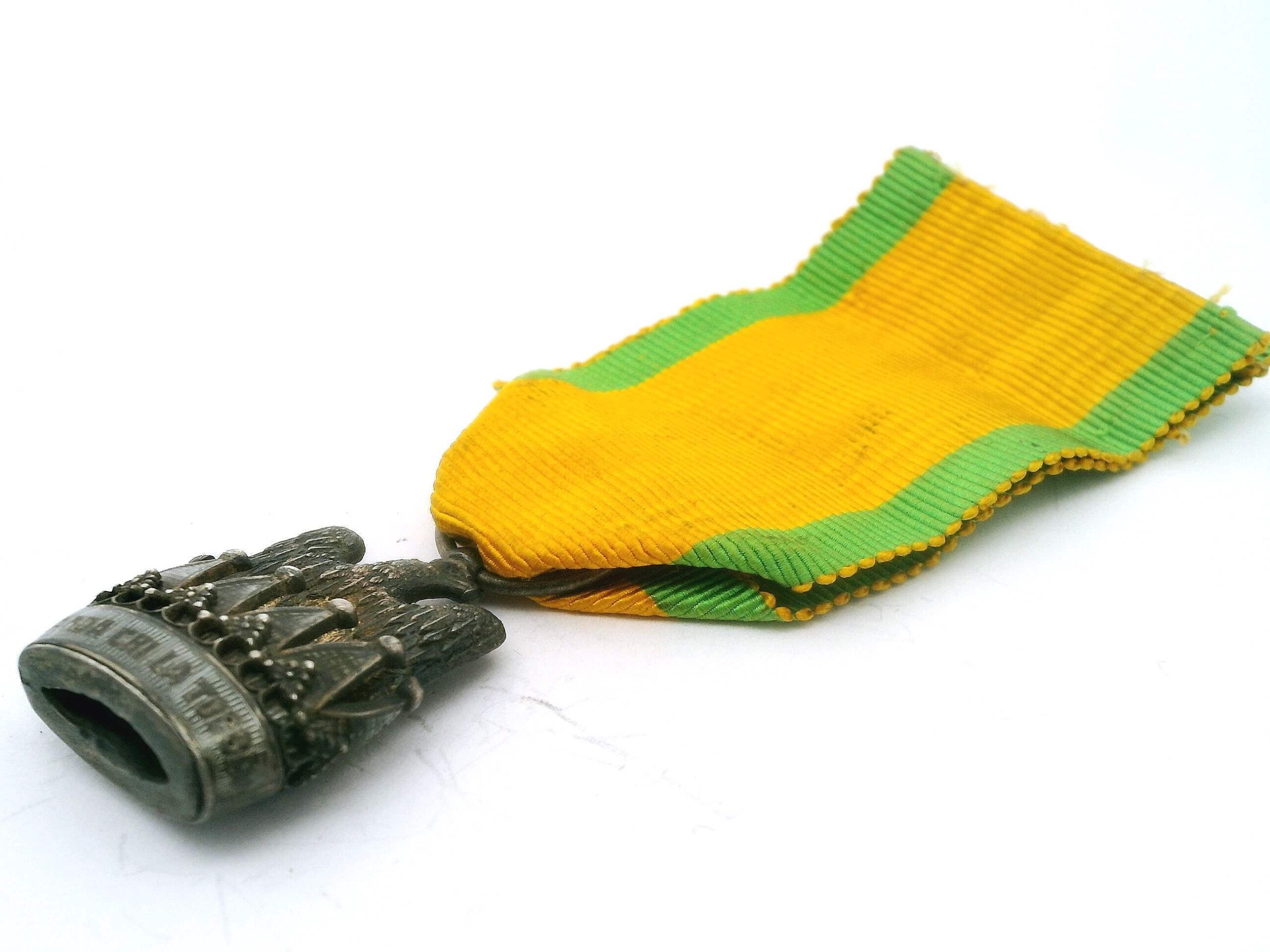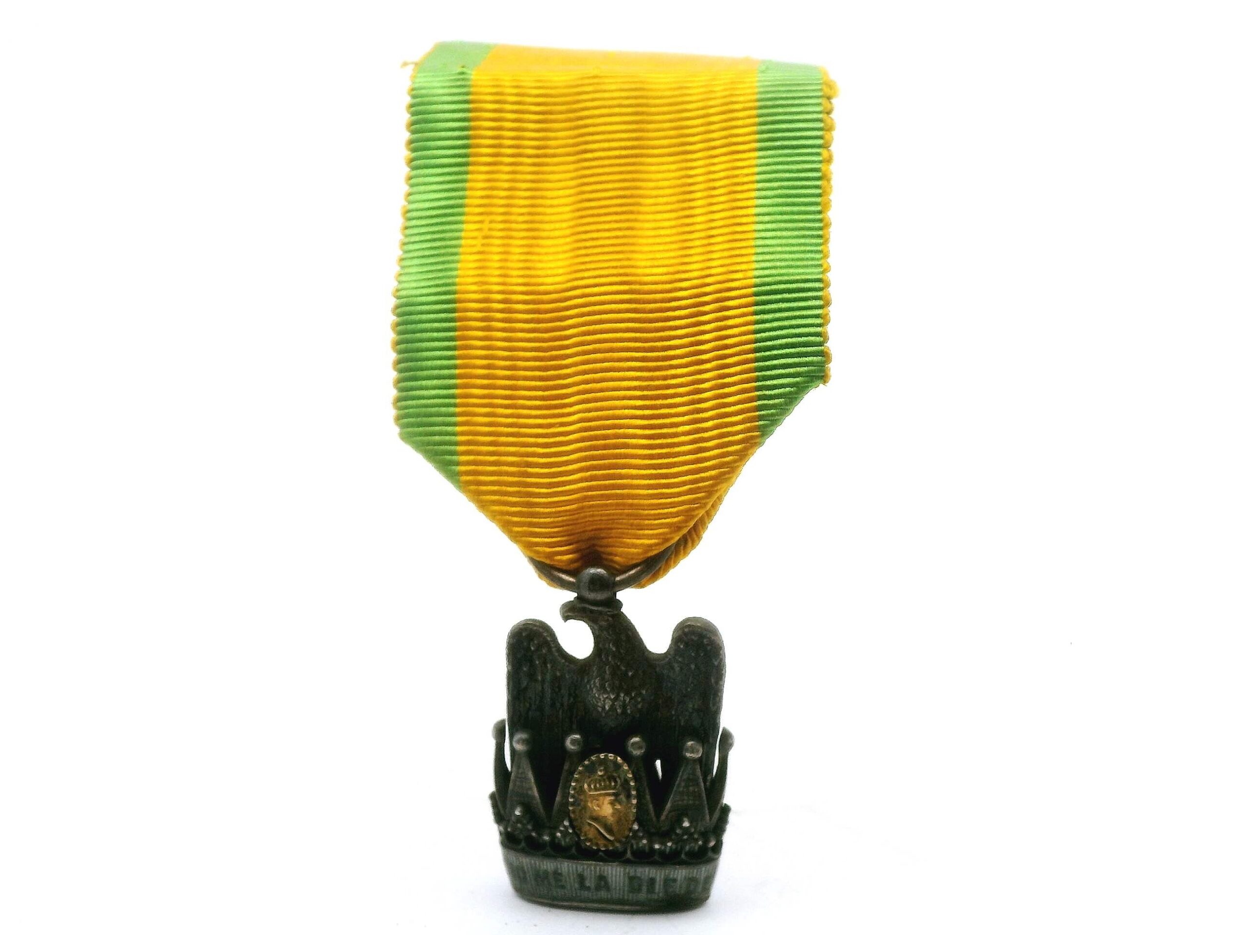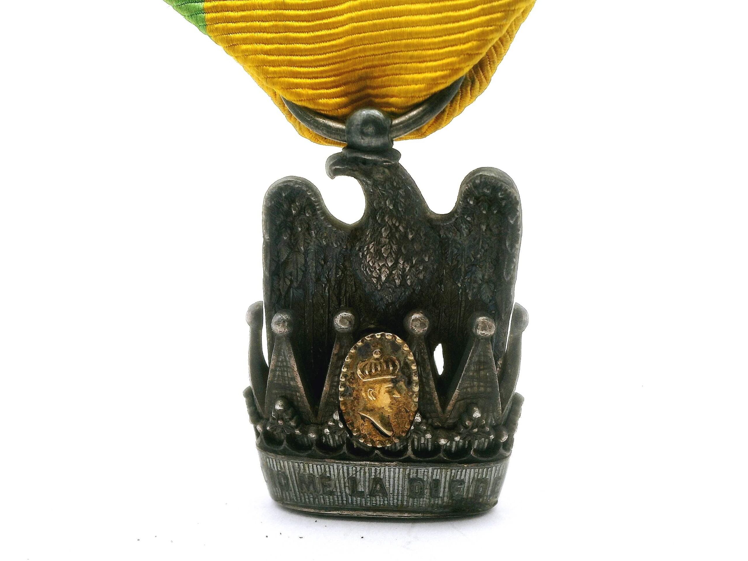 Seltene Ausführung um 1880, silbernes Abzeichen mit Adler, Krone und Ring, mit schöner altersbedingter Patina. Vor dunkelblauem, vertikal geriffeltem Emaillegrund feine florale Silberzier, im Zentrum goldene Büste Napoleons. Gestiftet am 5. Juni 1805 von Napoleon Bonaparte. Sehr schöne Erhaltung. Maße: ca. 30 × 20 mm | A rare circa 1880 issue, silver badge featuring an eagle, crown, and ring with attractive age patina. Fine floral silver ornament mounted over dark blue vertically ribbed enamel, with a central gold bust of Napoleon. Instituted on June 5, 1805, by Napoleon Bonaparte. Very fine condition. Measurements: approx. 30 × 20 mm
