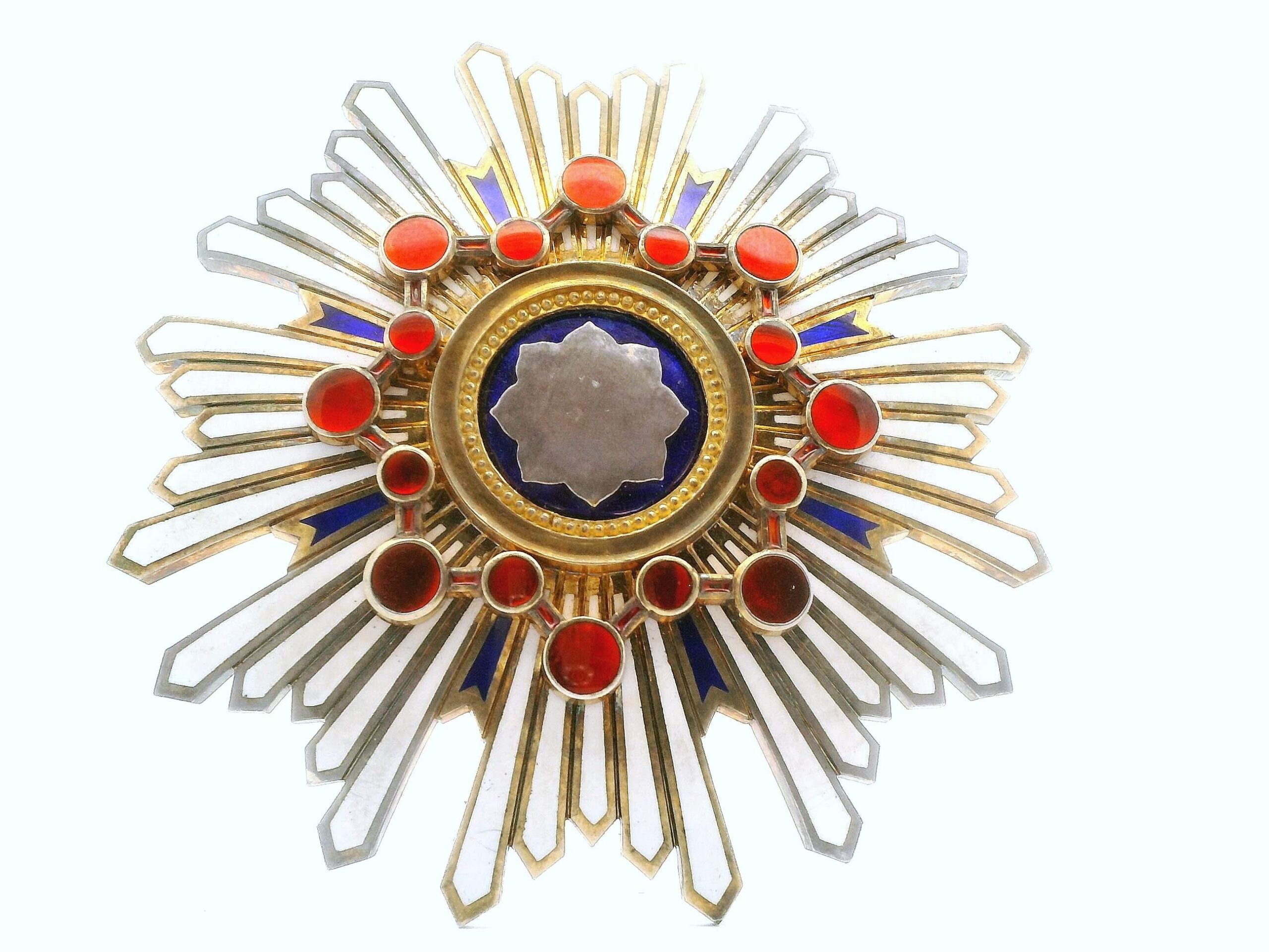Gestiftet 1888. Typ I (1888–2003). Bruststern aus vergoldetem Silber mit weißer und blauer Emaille, achtstrahlig mit kurzen blauen Zwischenstrahlen. Im Medaillon silberne Blüte auf blauem Grund, umgeben von einem vergoldeten Ring mit 16 roten Glascabochons.