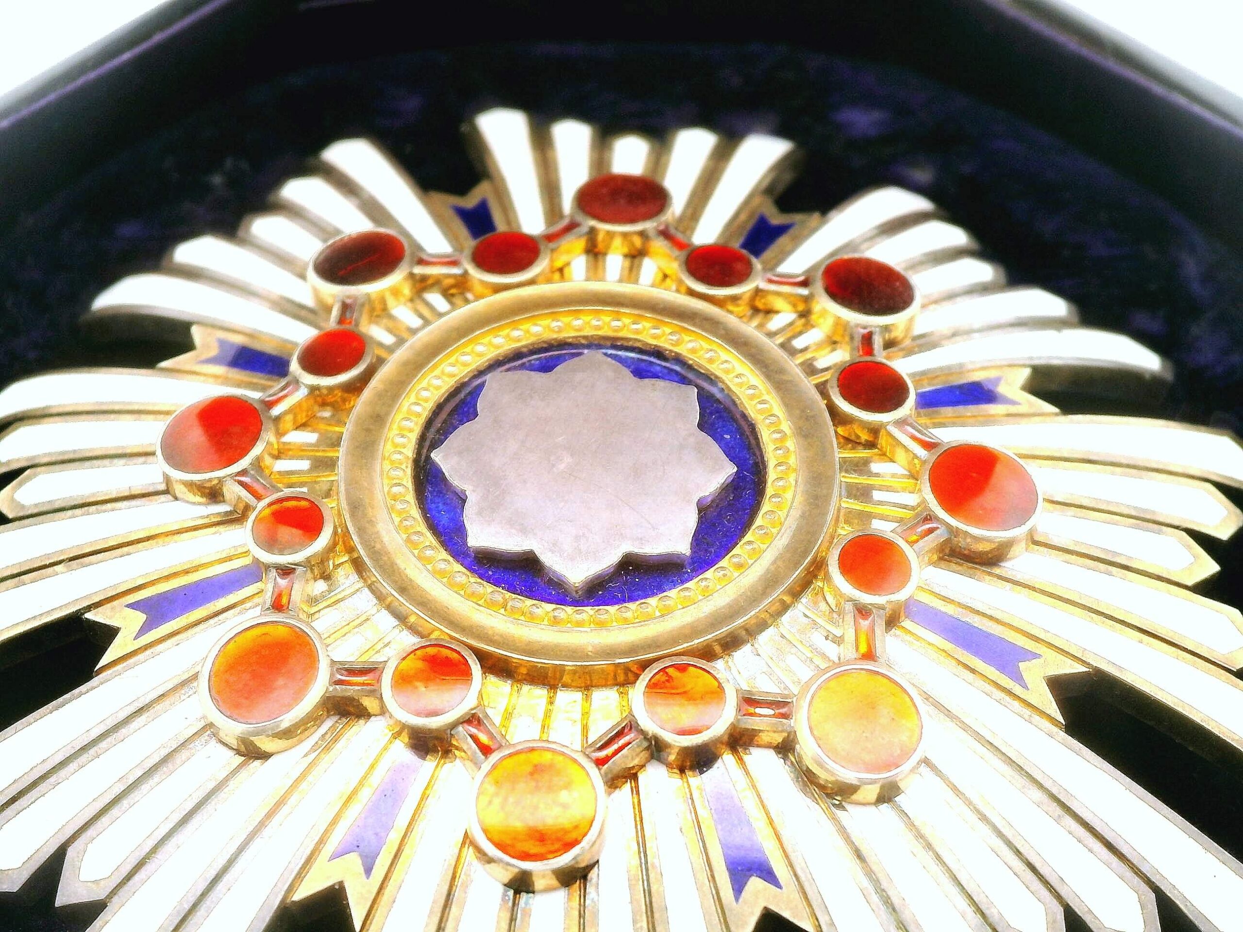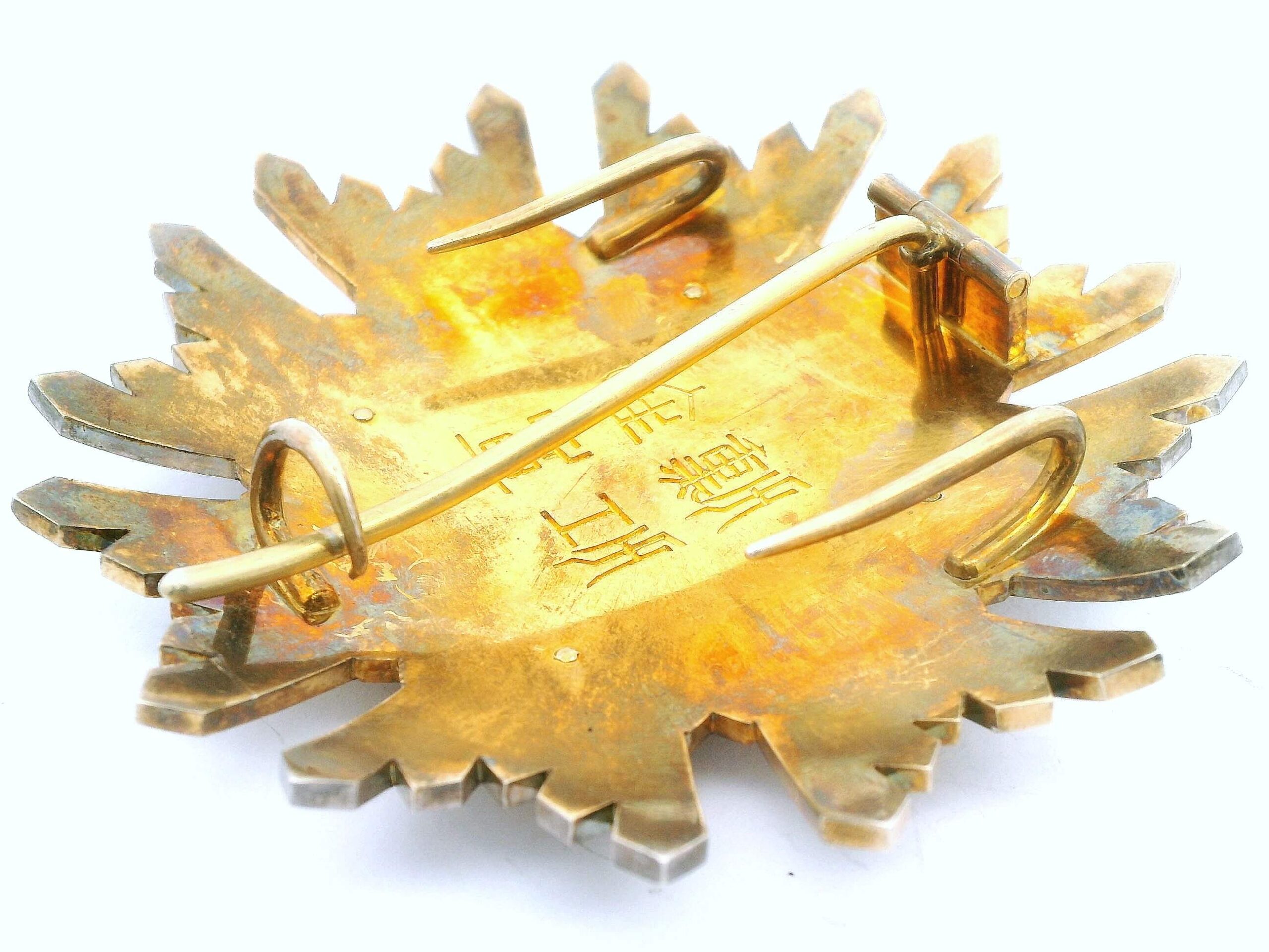 Ein repräsentatives und hervorragend erhaltenes Stück japanischer Ordenskunst. | Instituted in 1888. Type I (1888–2003). Breast star made of gilt silver with white and blue enamel, eight-pointed with short blue interstitial rays. The central medallion features a silver blossom on a blue field, surrounded by a gilt ring set with sixteen red glass cabochons.
