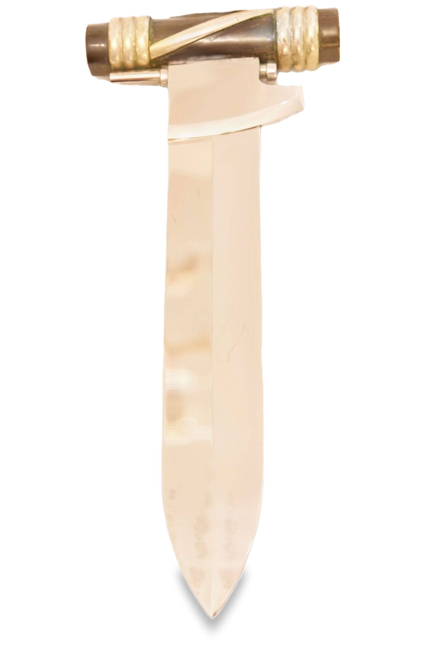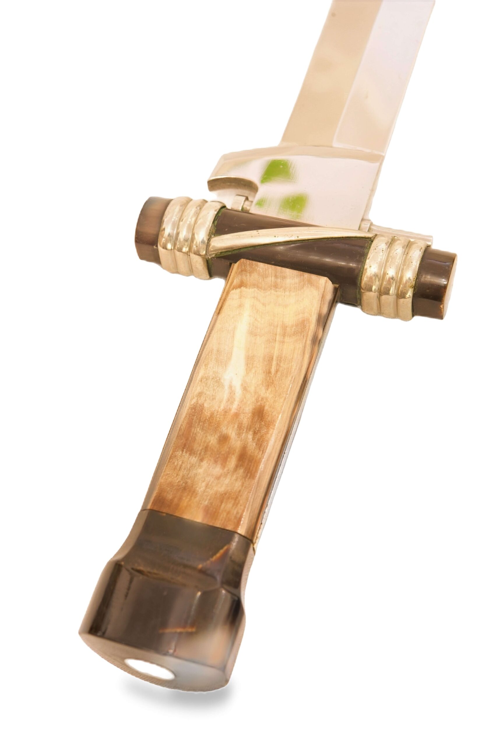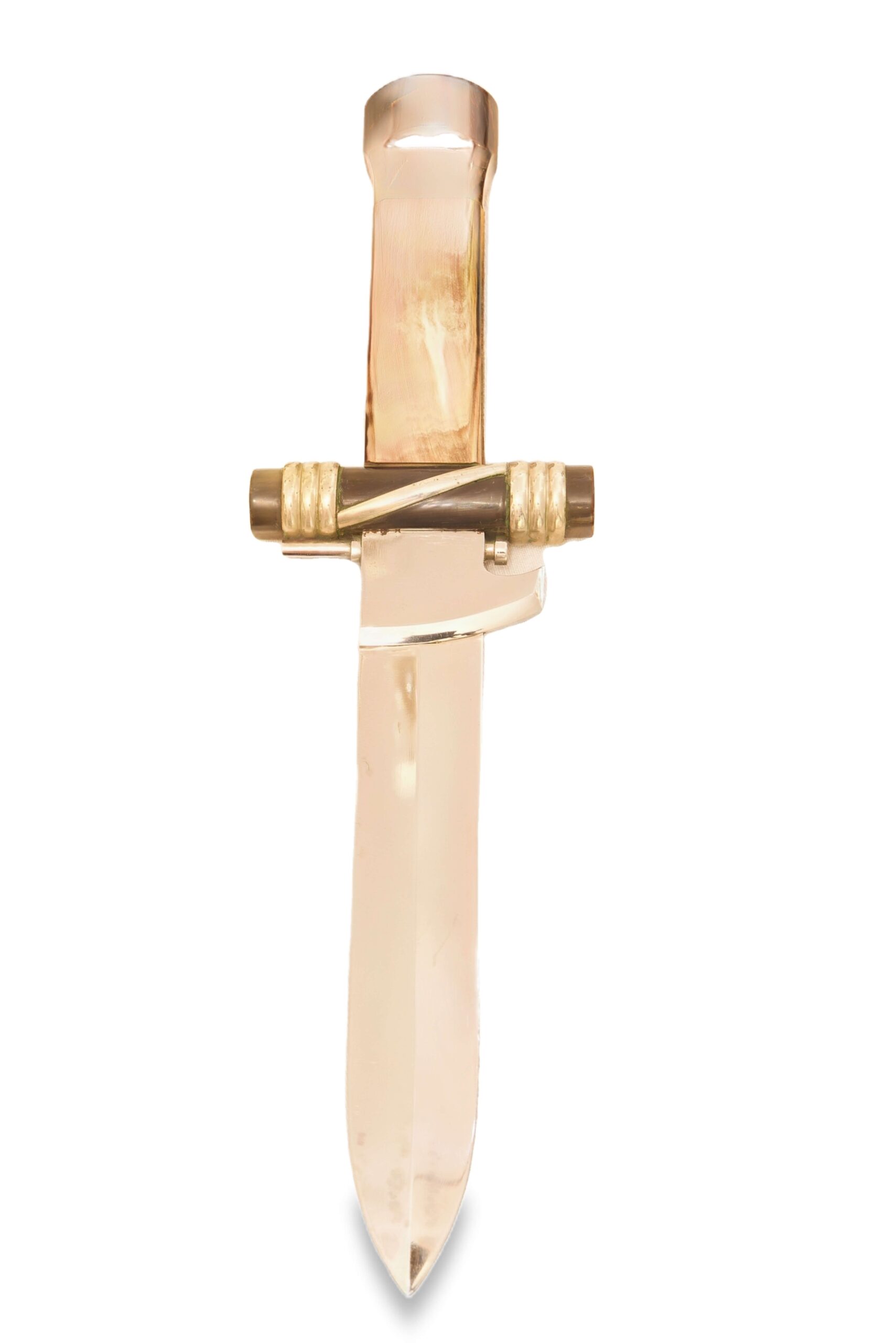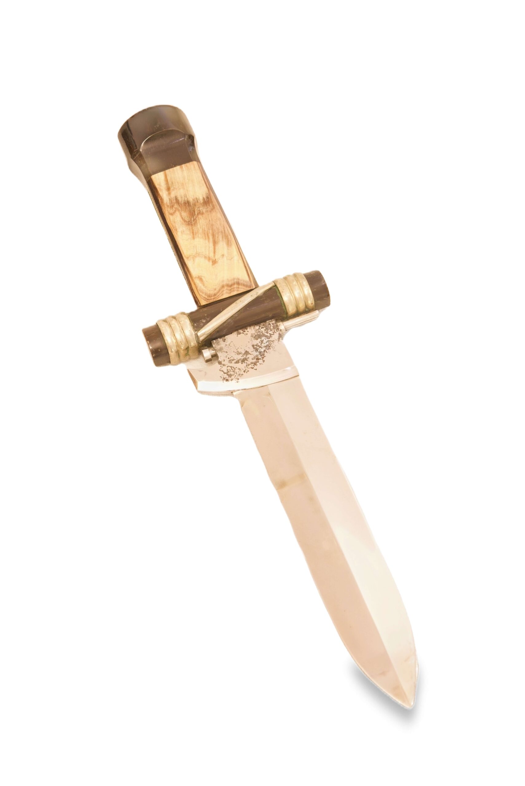 Außergewöhnlich gestalteter Dolch im Art-Déco-Stil, Gesamtlänge ca. 31,5 cm. Nickelplattierte Klinge (19 cm lang), poliert, mit scharfer Spitze und kleineren Dellen, auf einer Seite nahe der Parierstange mit Roststellen durch Lagerung. Parierstange mehrteilig, aus synthetischem braunem Material und nichtmagnetischem, vernickeltem Metall; Griff ebenfalls mehrteilig aus synthetischem Material gefertigt. Abgesehen von der Klinge in vorzüglicher Erhaltung. Ursprünglich ohne Scheide, in einer Präsentationskassette mit Namensgravur des Empfängers ausgegeben (hier fehlend). Seltener Dolch von hervorragendem italienischem Design. Provenienz: Aus dem Nachlass des ehemaligen Stabschefs (Initialen M.C.) des „Stato Maggiore della Milizia Confinaria“, der im Zweiten Weltkrieg an einer im Einsatz erlittenen Krankheit verstarb, zuletzt Kommandant der 137. Legion CCNN auf dem Balkan. | A superbly crafted Art Deco–style dagger, measuring approximately 31.5 cm in total length. The nickel-plated blade (19 cm long) is polished with a sharp tip, showing minor dents and some deeper rust spots near the crossguard due to age and storage. The crossguard is of multi-piece construction, combining synthetic brown material with nickel-plated non-magnetic metal; the grip is also multi-piece, made of synthetic material. Aside from the blade, the dagger remains in extremely fine condition. Originally issued without a scabbard, it would have been presented in a custom case bearing the recipient’s name (now missing). A rare dagger of elegant Italian design. Provenance: From the estate of the former Chief of Staff (initials M.C.) of the Stato Maggiore della Milizia Confinaria, who died during the Second World War from illness contracted in service as Commanding Officer of the 137th Legion CCNN, stationed in the Balkans.