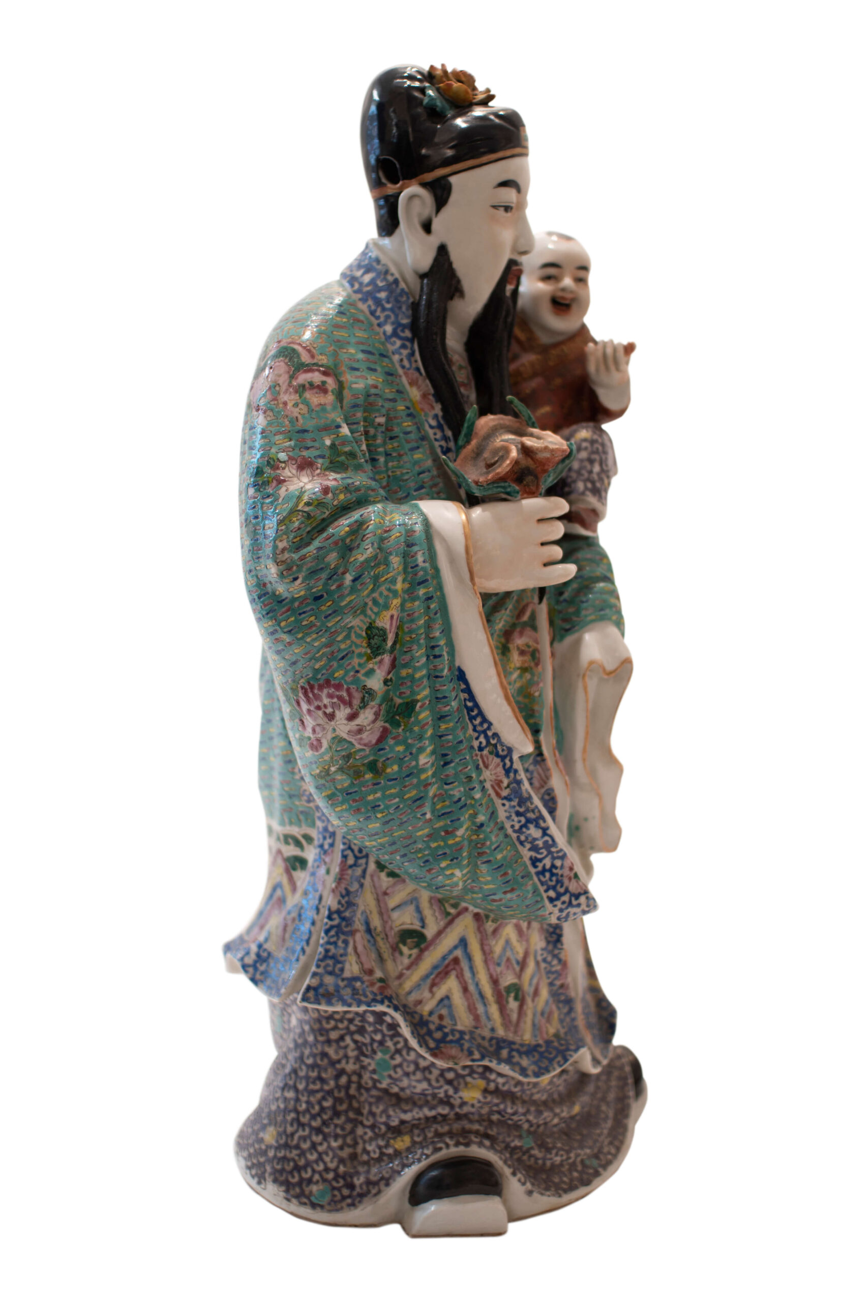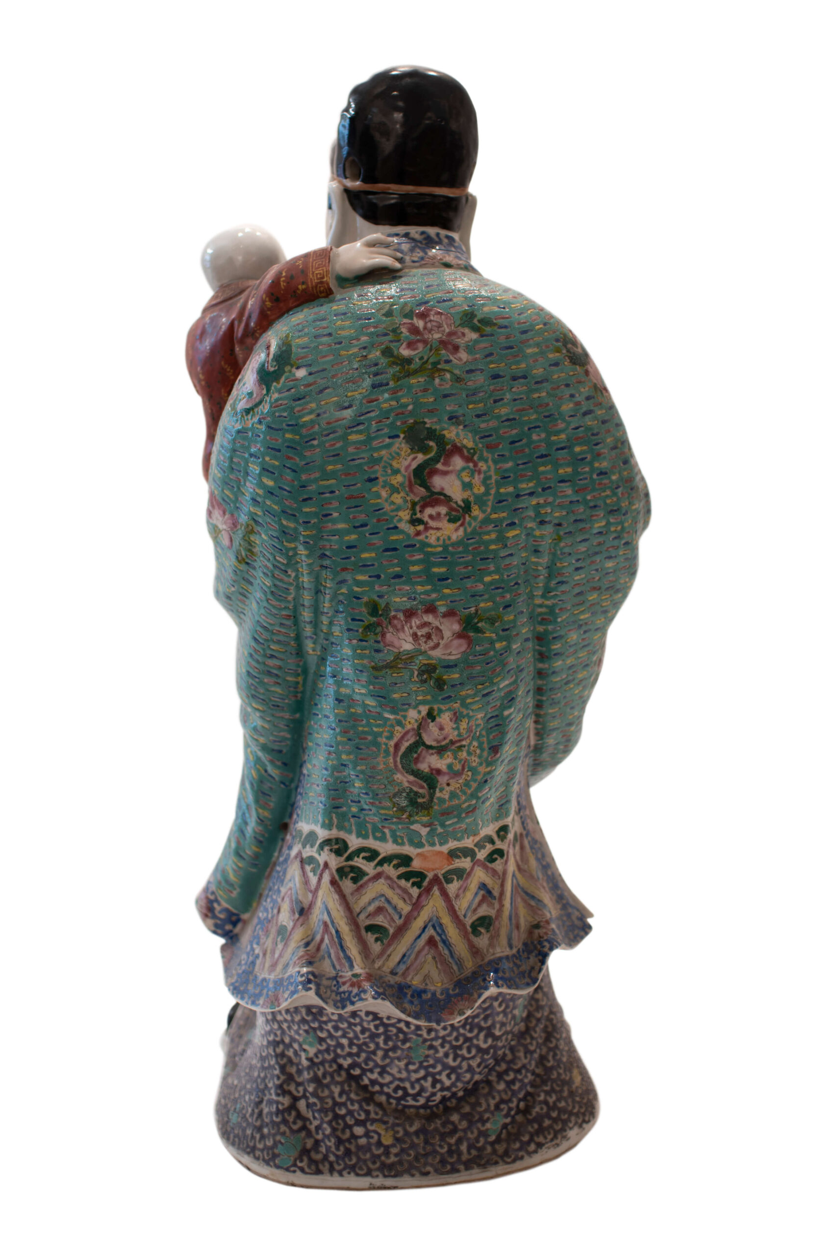 Old figure of an Asian priest with child, porcelain coloured painted, beautifully worked, 65 x 25 cm