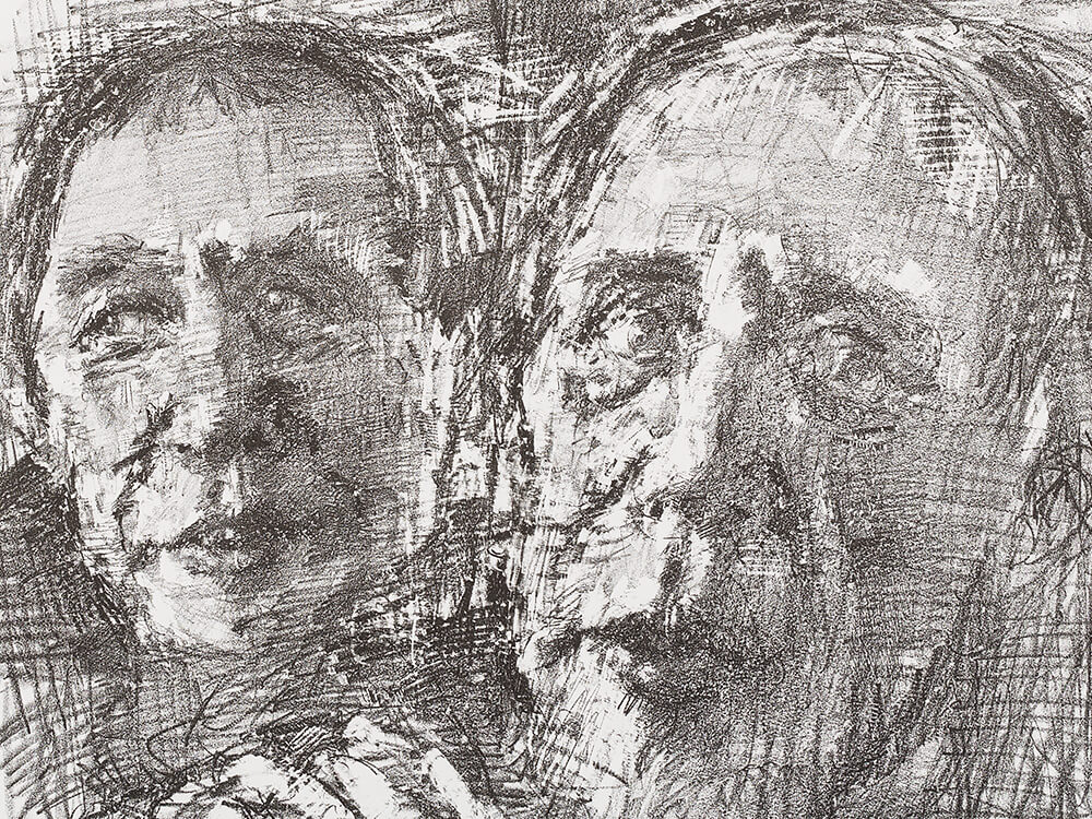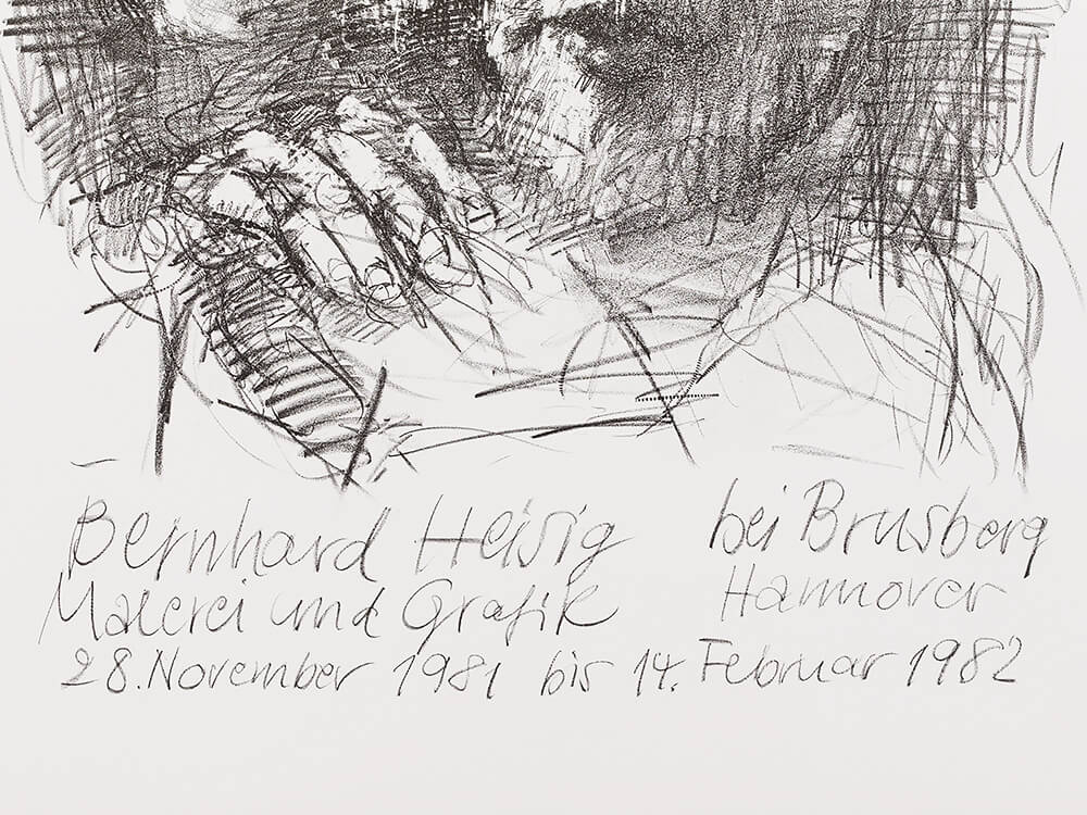 Lithograph on cardboard, Germany, 1981, poster for the exhibition “Bernhard Heisig Malerei und Grafik bei Brusberg Hannover” at the Brusberg Gallery from November 28, 1981 to February 14, 1982, title of the lithograph “Faust und Mephisto als Selbstportrait” (Faust and Mephisto as self-portrait), image dimensions: 69 x 55.5 cm; sheet dimensions: 80 x 67 cm
