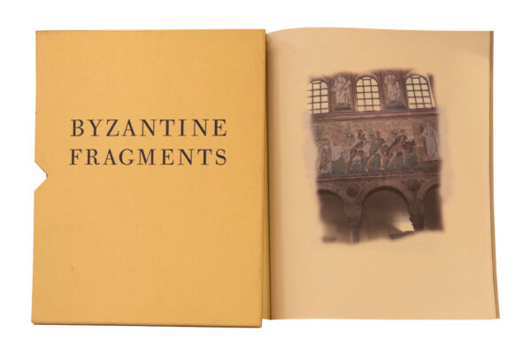 Fotografien von byzantinischen Mosaiken in der Basilika di San Vitale in Ravenna, das Titelblatt ist aus indigoblauem Transparentpapier mit Goldschrift. Der Einband ist aus goldenem Arches- Papier welches mit Kupferfarbe bedruckt ist. Jedes Buch ist mit umberfarbenen Faden handgenäht und in einen geprägten Goldschuber untergebracht. Maße: 40,5 x 30 cm | Photographs of byzantine mosaics in the Basilica di San Vitale in Ravenna. The cover is made of indigo blue tracing paper with gold lettering, also included in the cover is an golden arches paper printed with copper ink. Each book is hand sewn with umber thread and housed in an embossed gold slipcase. Dimensions: 40,5 x 30 cm