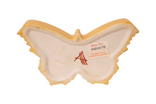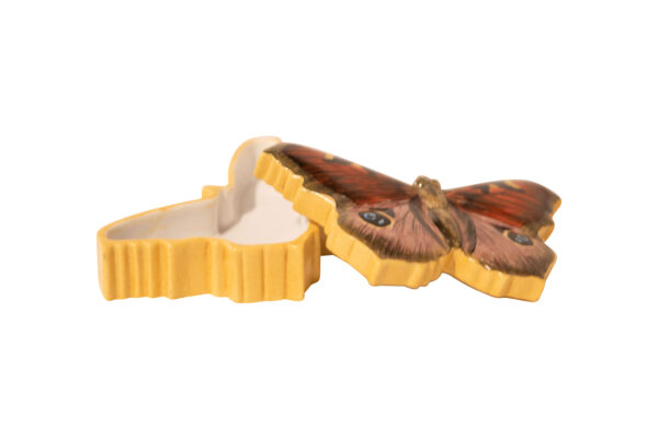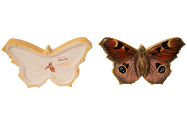 Die Keramikdose hat einen Deckel und ist in der Form eines Tagpfauenaugen Schmetterlings. Maße: Breite 14 cm, Höhe 4 cm | The ceramic jar has a lid and is shaped like a peacock butterfly. Dimensions: width 14 cm, height 4 cm