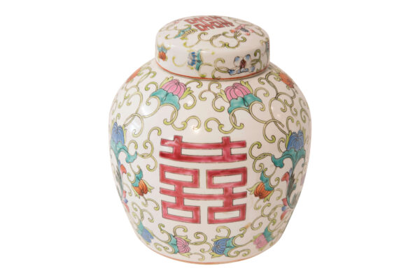 Porcelain, bulbous shape with lid colorfully decorated with flowers on light background, small crack in the body ,height 27 cm, diameter lid 13 cm | Porzellan, bauchige Form mit Deckel farbig dekoriert mit Blumen auf hellem Grund, kleiner Riss im Korpus, Höhe 27 cm, Durchmesser Deckel 13 cm