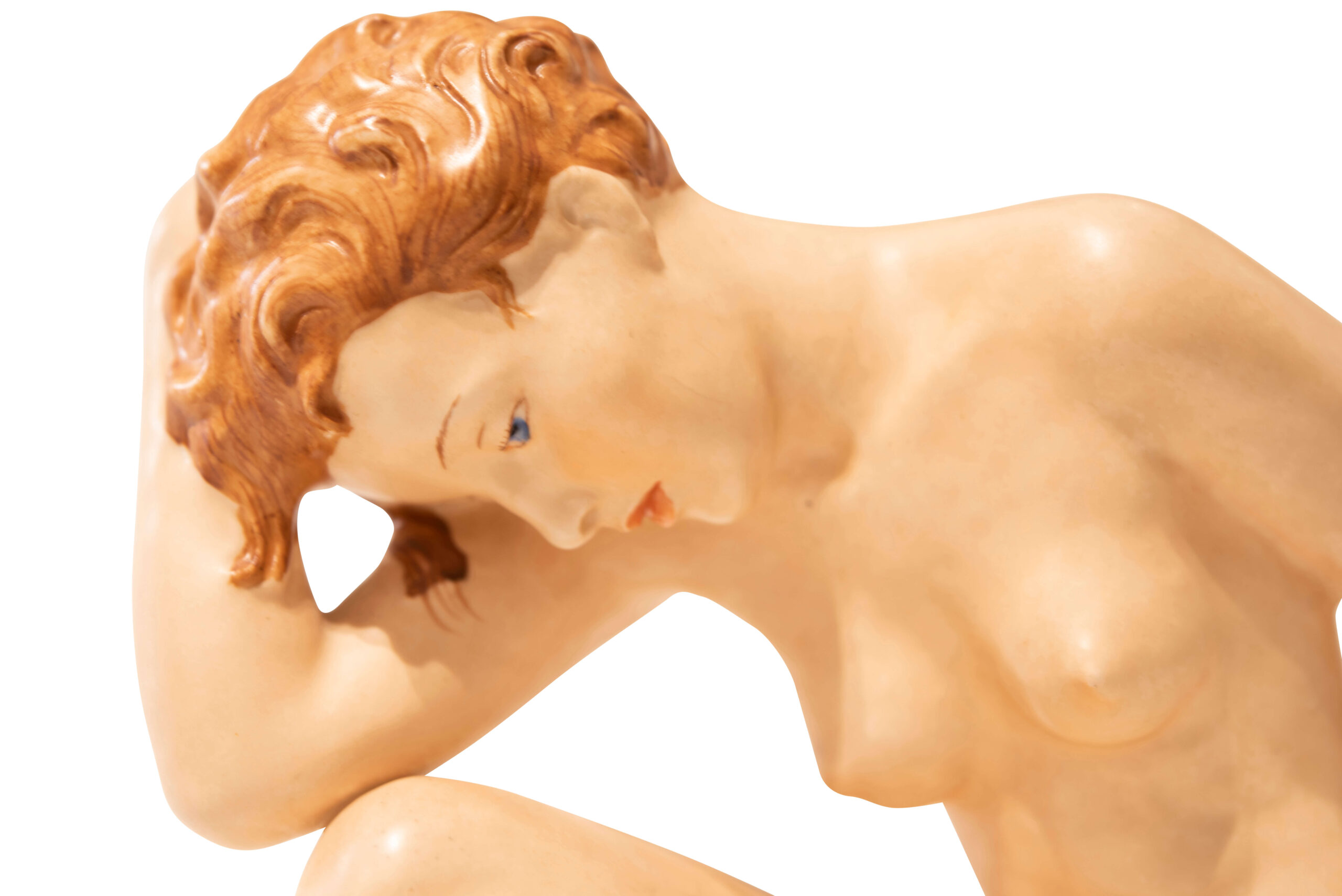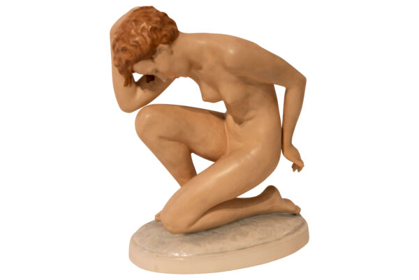 Die Porzellanfigur, aus der Royal Dax Porzellan Manufaktur, stellt ein nacktes Mädchen auf einem Sockel dar. Maße: Höhe 25 cm, Breite 12 cm, Länge 18,5 cm | The porcelain figurine, from the Royal Dax Porcelain Manufactory, depicts a naked girl on a pedestal. Dimensions: height 25 cm, width 12 cm, length 18,5 cm