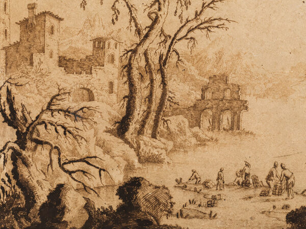 Pen and ink drawing in brown, partly washed, on light brown paper, Italy, 1st half of 18th century, Attributed to Francesco Bosio (act. 1725-1756) – Italian draftsman of the School of Bologna, Paper dimensions: 30.4 x 39.5 cm, Matted under glass in a gilt wooden frame: 66 x 85 cm