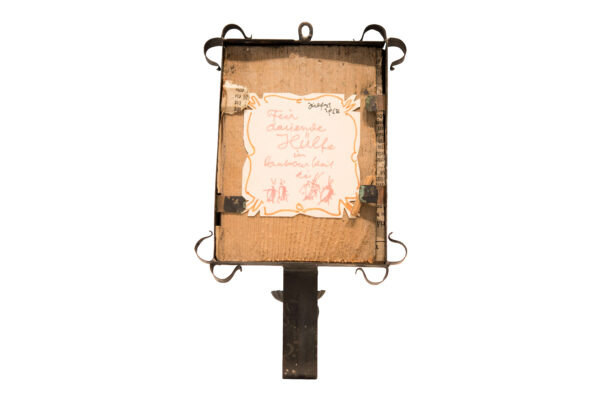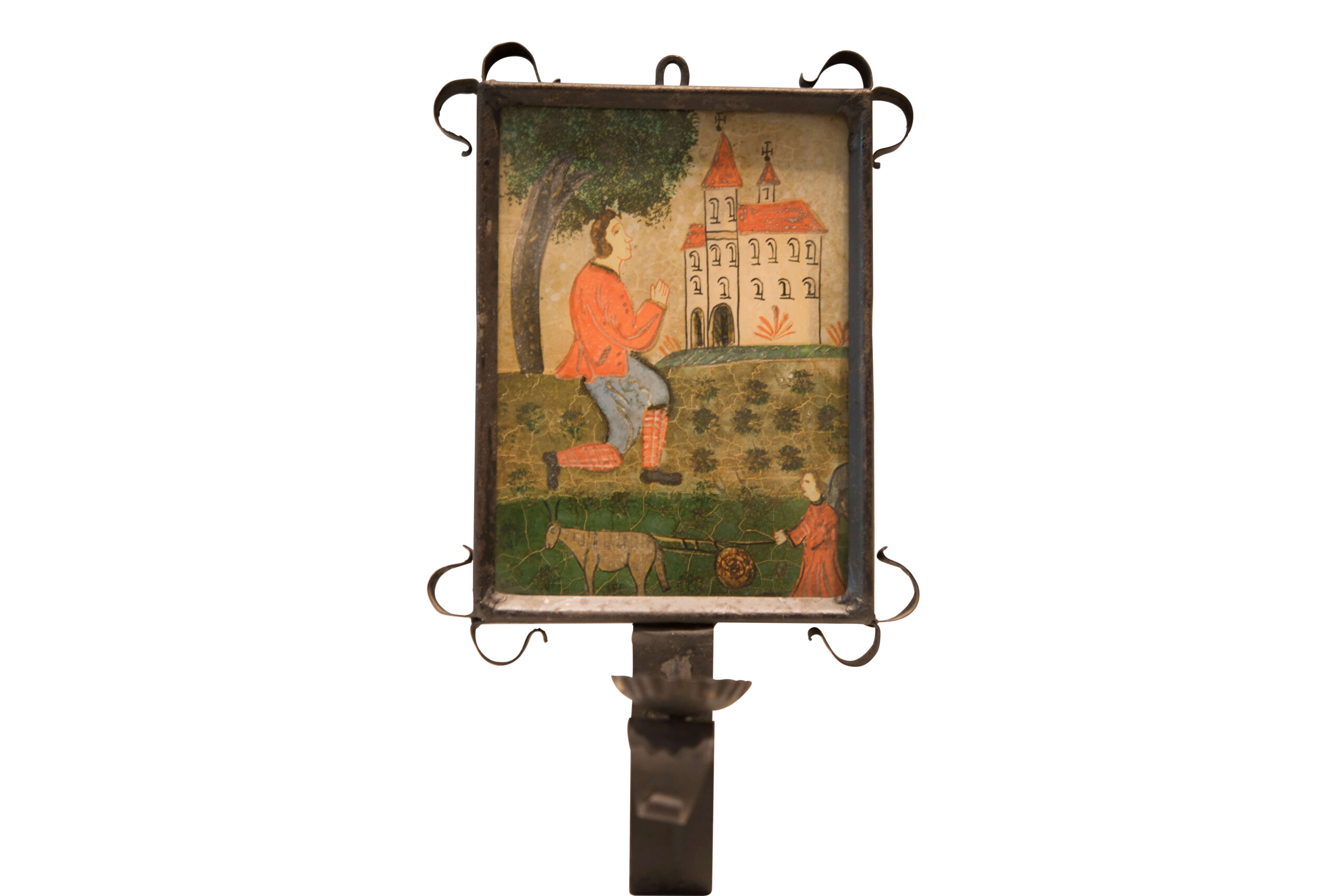 Kerzenbild, Hinterglasmalerei,Rahmen und Kerzenhalter aus Stahl, Kirche mit einem betenden Heiligen, Maße: 27 x 15cm | Candle painting, reverse glass painting,steel frame and candle holder, church with a praying saint, dimensions: 27 x 15cm