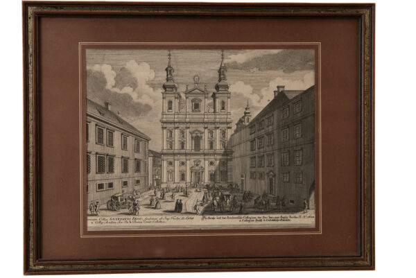 Kupferstich von H. Sperl nach einer Zeichnung von Salomon Kleiner mit dem Titel (Text im Bild): “Templum et Academicum Collegium Societatis Jesu fundatum ab Imp. Ferdinado II. anno 1628”. Maße: 43.5 x 33 cm | “Templum et Academicum Collegium Societatis Jesu fundatum ab Imp. Ferdinado II. anno 1628”, framed picture behind glass, lithograph. Dimensions: 43.5 x 33 cm.