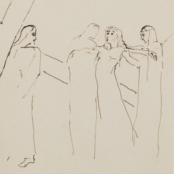 Black pen and ink on fine paper, laminated on wove paper (papier vélin), Germany, probably late 1920s, image dimensions: approx. 17 x 14 cm; sheet dimensions: 20 x 14.7 cm, image carrier: 44.9 x 34.9 cm, dynamic, fleetingly drawn composition probably depicting a scene from the Passion of Christ