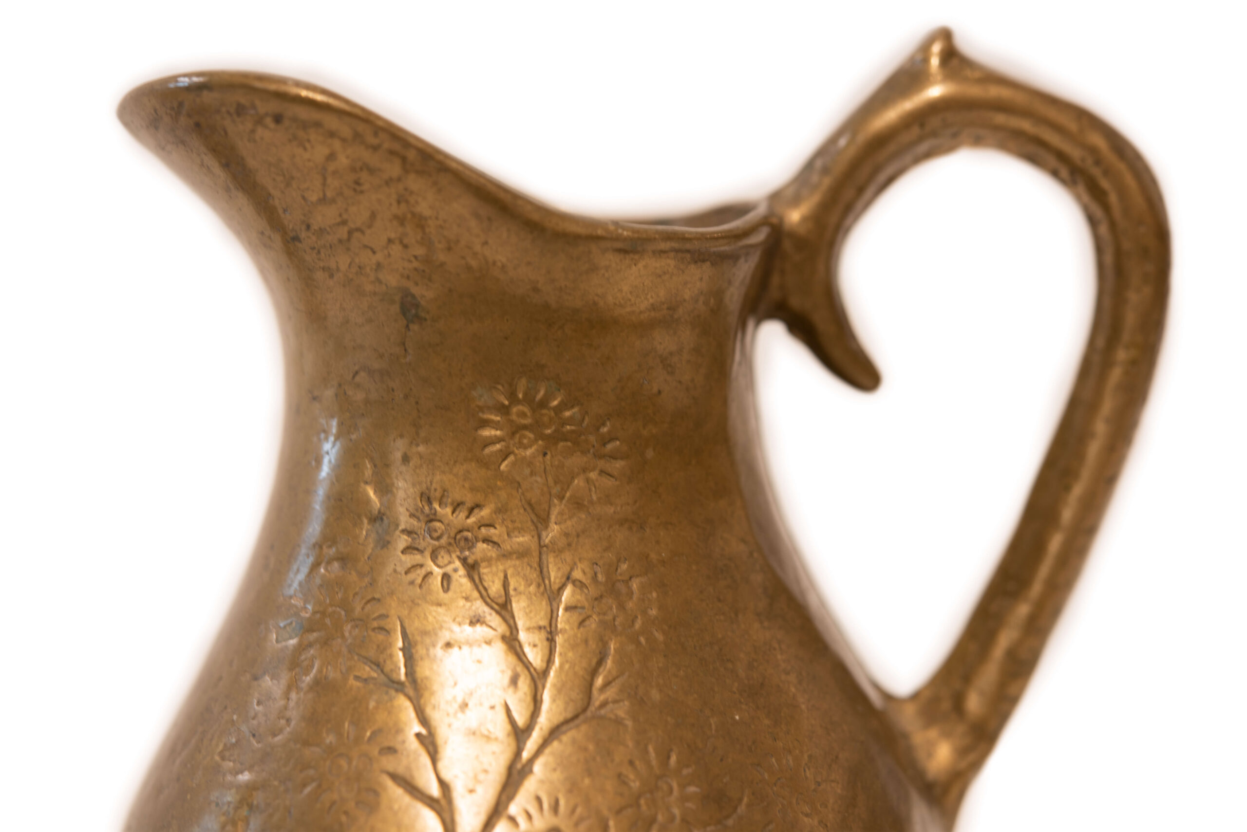 Messing Krug mit floralen Verzierungen, circa 17 cm hoch | Brass jug with floral decorations, circa 17 cm high