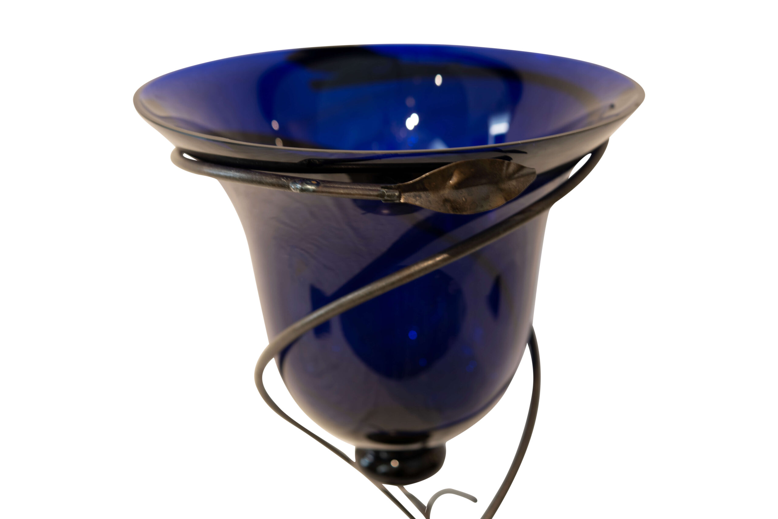 Blue glass with ornaments, metal (iron) frame with glass insert (lightly shaved) cobalt blue, height 40.5 cm, diameter 22.5 cm | Blaues Glas mit Ornamenten, Metall (Eisen) Gestell mit Glaseinsatz (leicht gescharte) Kobaltblau, Höhe 40,5 cm, Durchmesser 22,5 cm