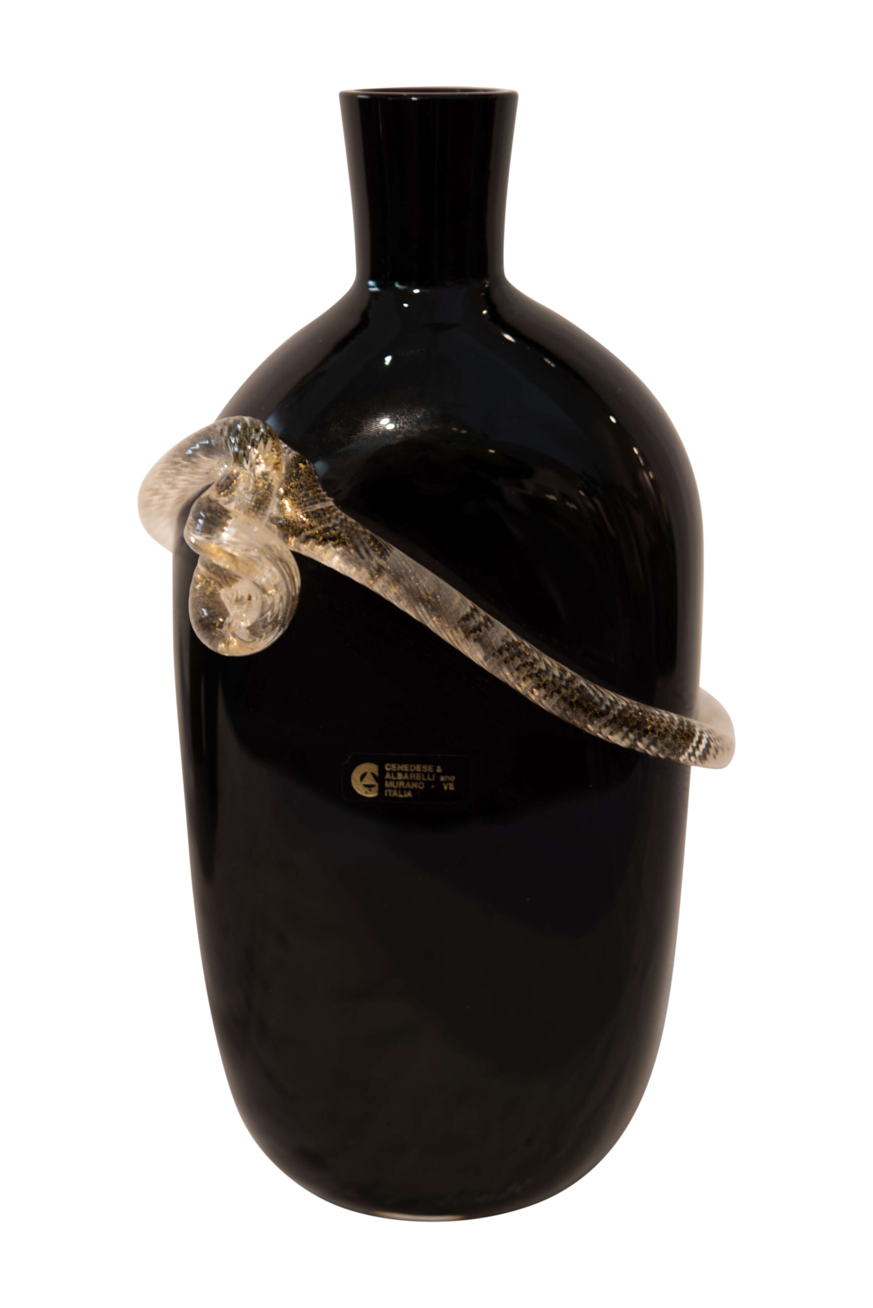 Murano bottle made of black glass with bow without stopper, 24,5 cm x 13,5 cm | Murano Flasche aus schwarzem Glas mit Masche ohne Stöpsel, 24,5 cm x 13,5 cm