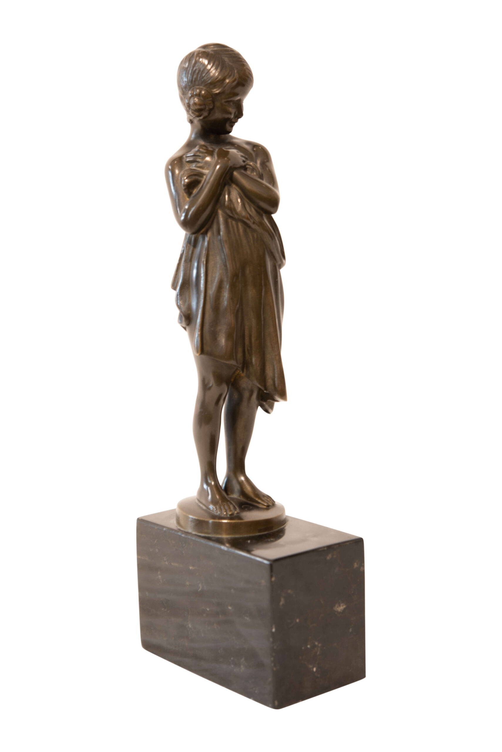 Bronze patinated, sculpture on marble base, standing youth with cloth in front of the body, marked no. 4614 Petri, height including base 35 cm | Bronze patiniert, Skulptur auf Marmorsockel, stehende Jugendliche mit Tuch vor dem Körper, bezeichnet Nr. 4614 Petri, Höhe inklusive Sockel 35 cm