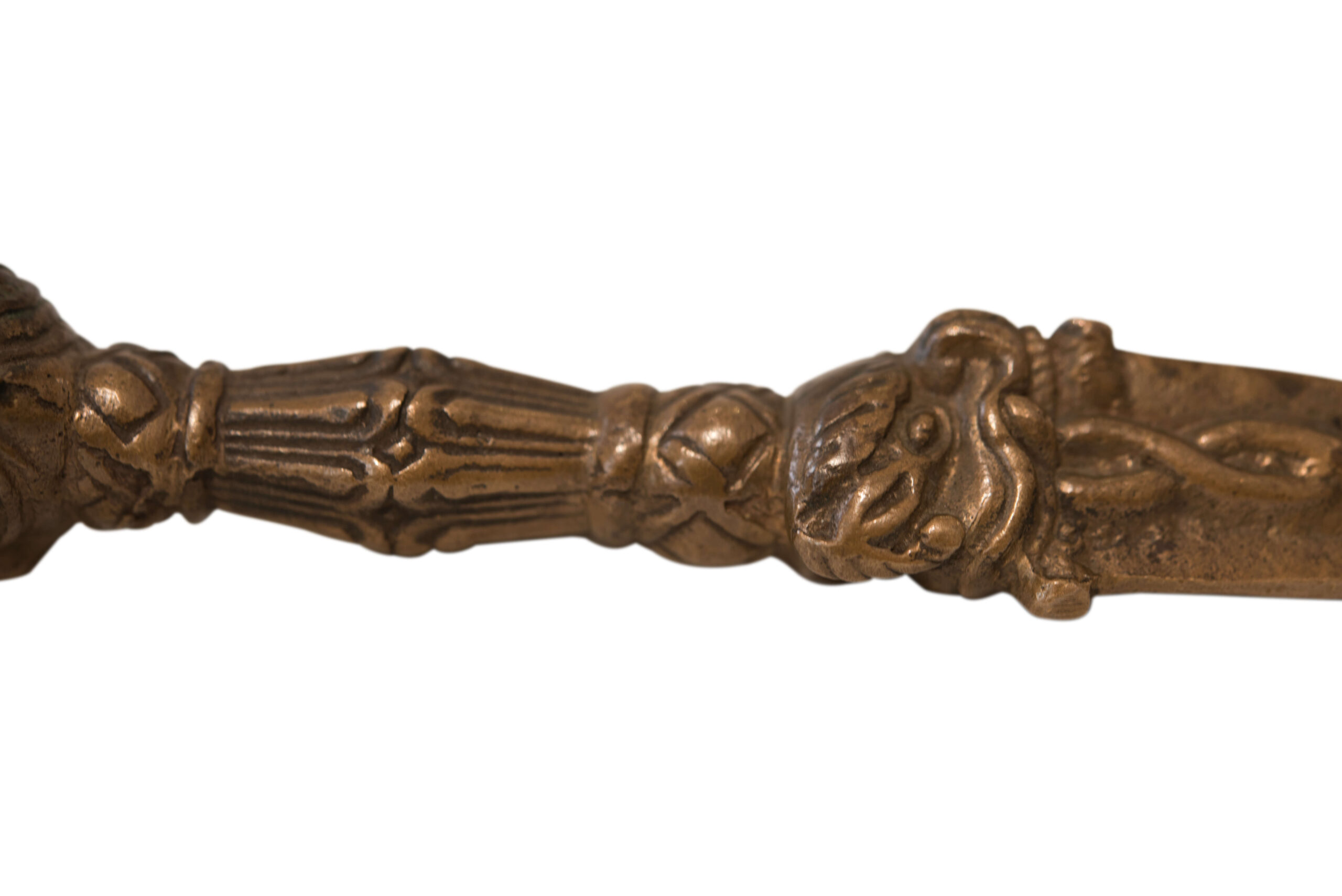 Phurba, Bronze, Kunstwerk mit schamanistischen Bezug, tibetanischer Buddhismus, Werkzeug mit drei Seiten, erinnert an Dolch, für religiöse Rituale und Exorzismen verwendet, circa 21,5 cm lang | Phurba, bronze, work of art with shamanistic reference, Tibetan Buddhism, tool with three sides, reminiscent of dagger, used for religious rituals and exorcisms, about 21.5 cm long