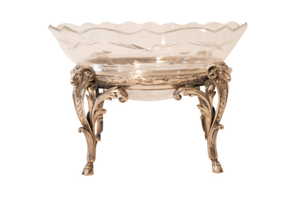 Table centerpiece silver 800/fine with glass insert, cut, round, hallmarked Diana with crescent moon, height 19 cm, diameter 27 cm, weight 1146 grams | Tafel-Aufsatz Silber 800/fein mit Glaseinsatz, geschliffen, Rund, Punziert Diana mit Mondsichel, Höhe 19 cm, Durchmesser 27 cm, Gewicht 1146 Gramm