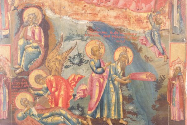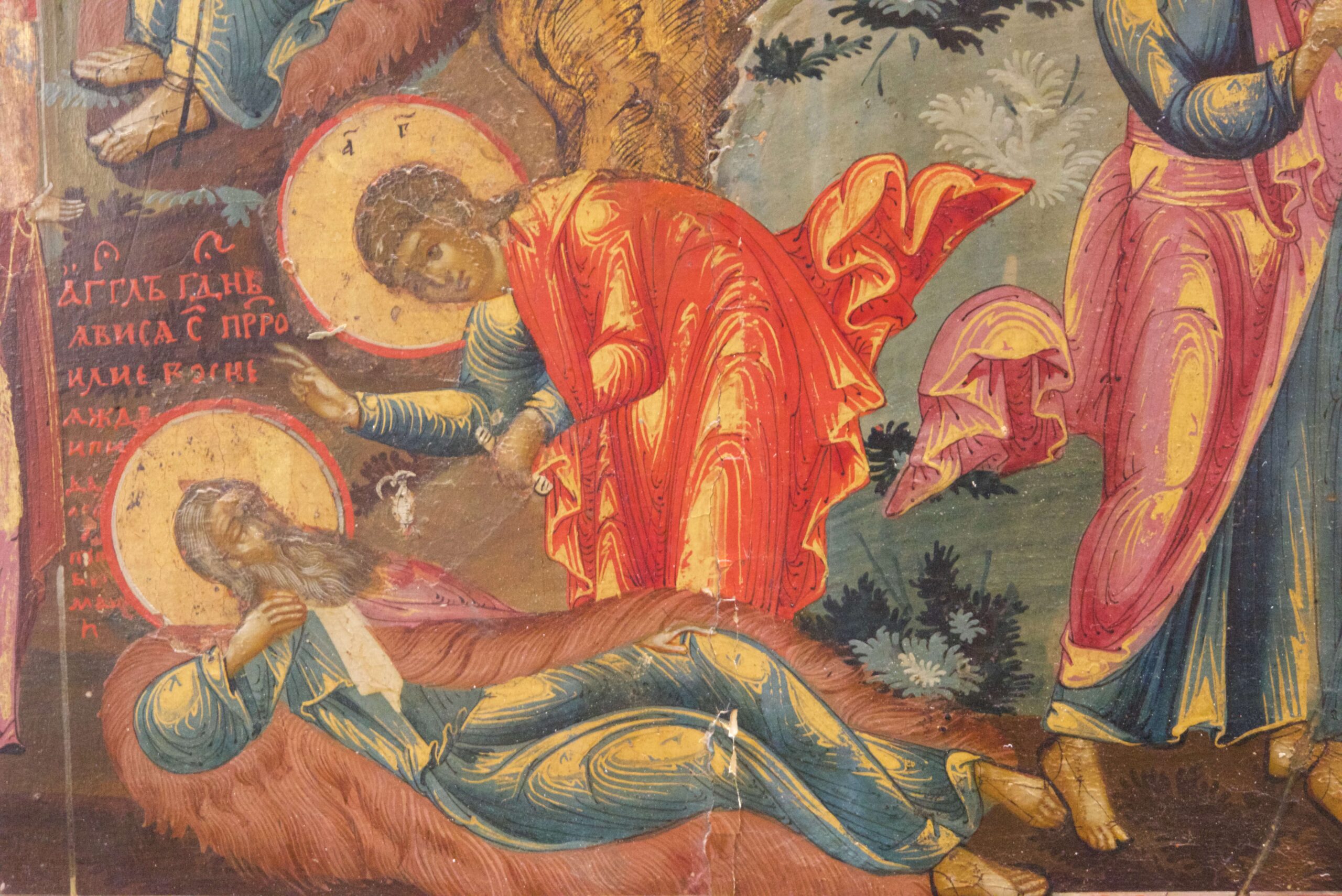 Russian icon Prophet Elijah around 1800, in front dream of Elijah, right Elijah and his disciples set over the Jordan, above God the Father and Elijah in the chariot of fire ascending to heaven, at the edge left church father Grigory and Zosima, right Basil the Great and Sawatij, gold background, expert opinion available, 40,5 x 35 cm.