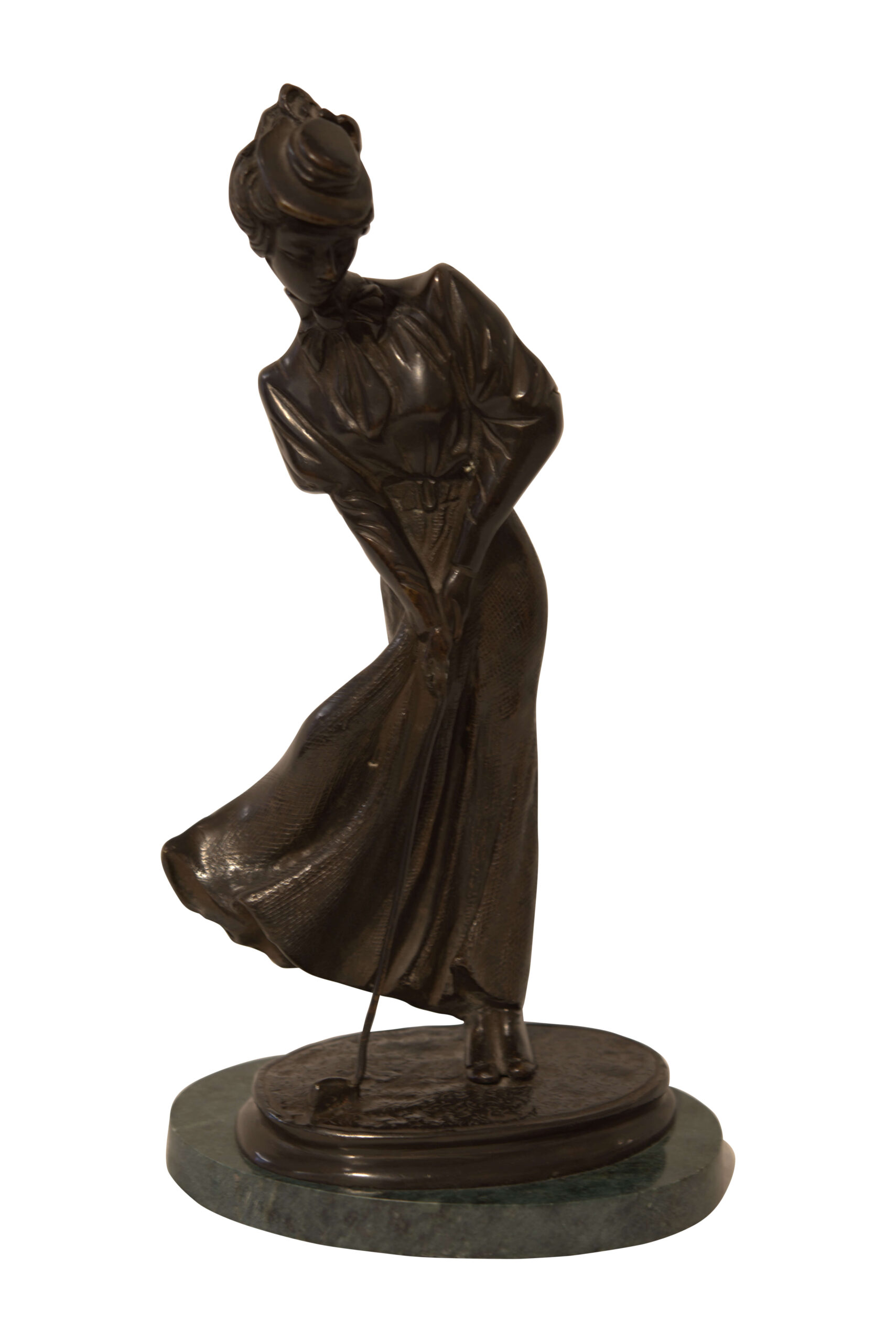 Die Bronzeskulptur ist braun patiniert und auf einer ovalen Bronze Plinthe montiert. Die ganze Figur, mit der Plinthe, steht auf einer ovalen und grünen Marmorplatte. Maße: Höhe 35 cm | The bronze sculpture has a brown patinated finish and is mounted on an oval bronze plinth. The entire figure, including the plinth, stands on an oval green marble slab. Dimensions: Height 35 cm