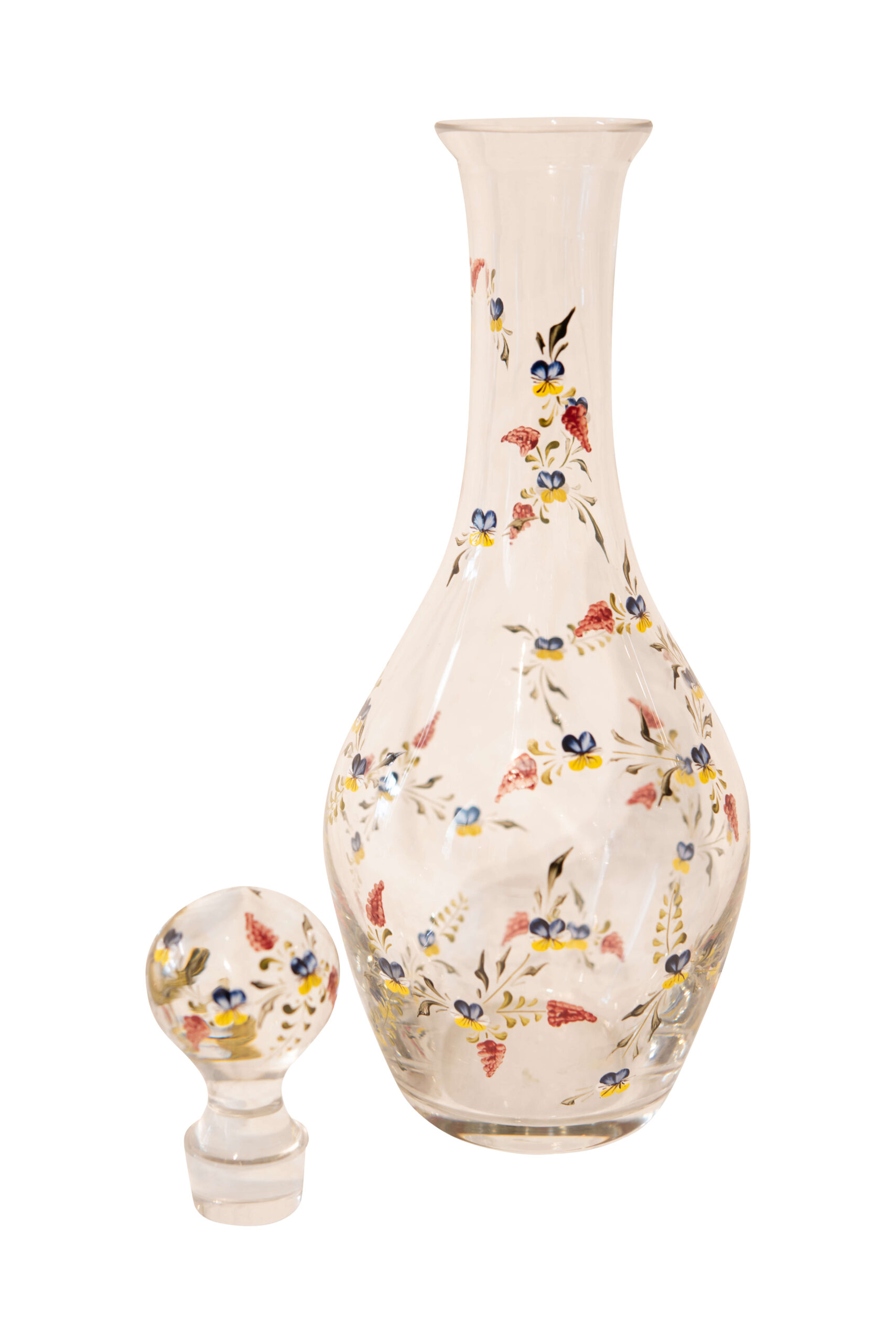 Set consisting of a painted glass wine carafe with glass stopper “Pansy” with six glasses, height 33.5 cm diameter 12 cm, glasses height 10.5 cm | Set bestehend aus einer bemalten Glas-Weinkaraffe mit Glasstöpsel “Stiefmütterchen” mit sechs Stamperln, Höhe 33,5 cm Durchmesser 12 cm Stamperln, Höhe 10,5 cm