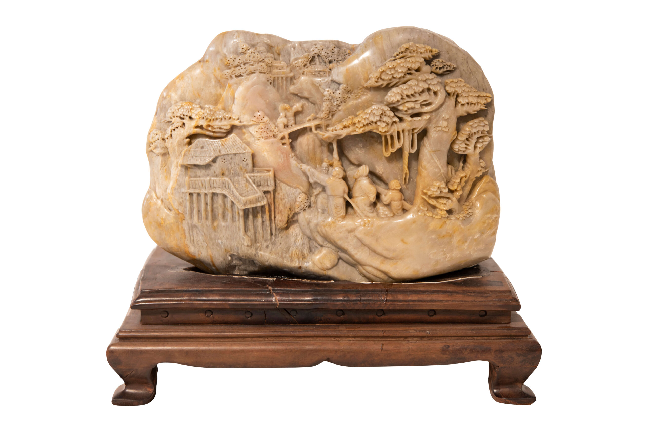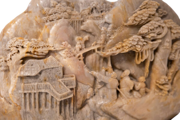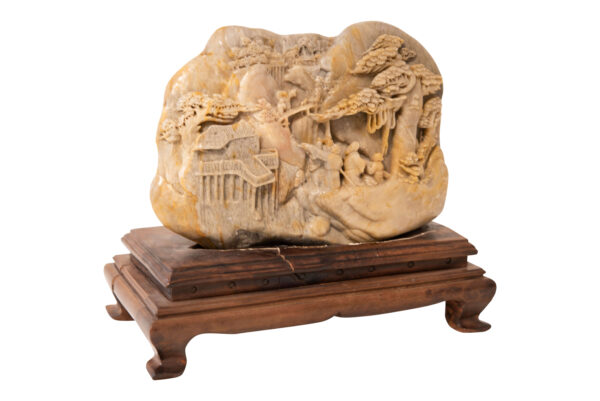 Soapstone, this sculpture shows a landscape with trees and people, on one side a monastery, very nicely worked on a rectangular wooden base, height 25 cm, width 30 cm | Speckstein, diese Skulptur zeigt eine Landschaft mit Bäumen und Personen, an der einer Seite ein Kloster, sehr schön gearbeitet auf einem recheckigen Holzsockel, Höhe 25 cm, Breite 30 cm