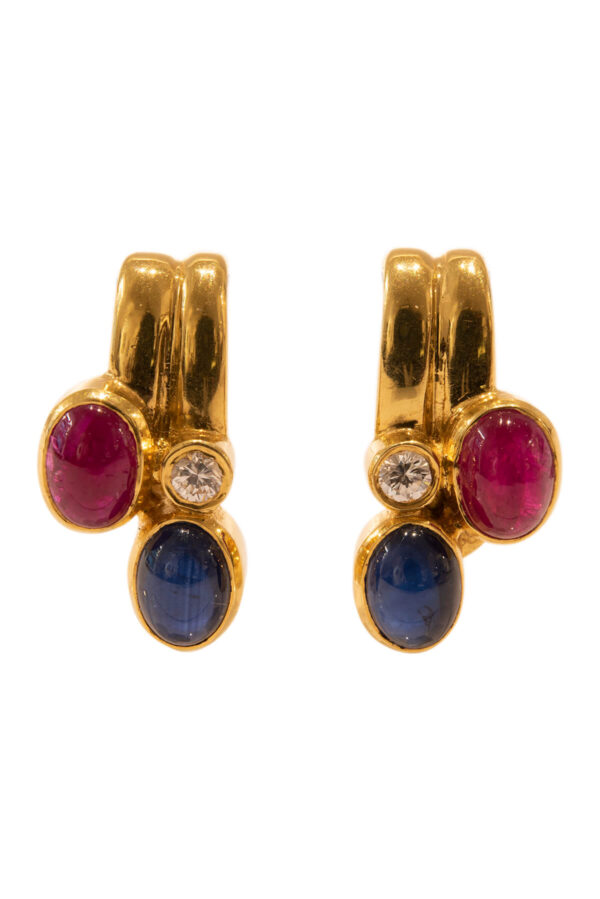 Stud earrings Yellowgold 750/000 fine, with diamonds together approximately 0,2ct, and two rubies oval dimensions: 6,5 x 5mm together approximately 1,2ct, and sapphires dimensions: 6,5 x 5mm together approximately 1,2ct, total weight 7,5g.