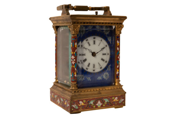 Enameled brass travel clock with travel box, Chinese cloisonne Dutch enamel clock, 19.5 cm height 10.2 cm x 8.8 cm depth | Emaillierte Messing Reiseuhr mit Reisebox, chinesische Cloisonne niederländische Emaille Uhr, 19,5 cm Höhe 10,2 cm x 8,8 cm Tiefe