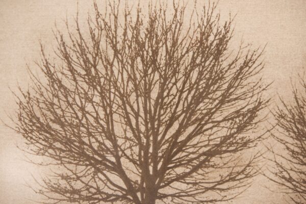Unbekannter Künstler “Zwei kahle Bäume in einer Winterlandschaft”. Zeichnung auf Leinwand, mit Rahmen 29,5 x 23 cm | Unknown artist “Two bare trees in a winter landscape”. Drawing on canvas, with frame 29,5 x 23 cm