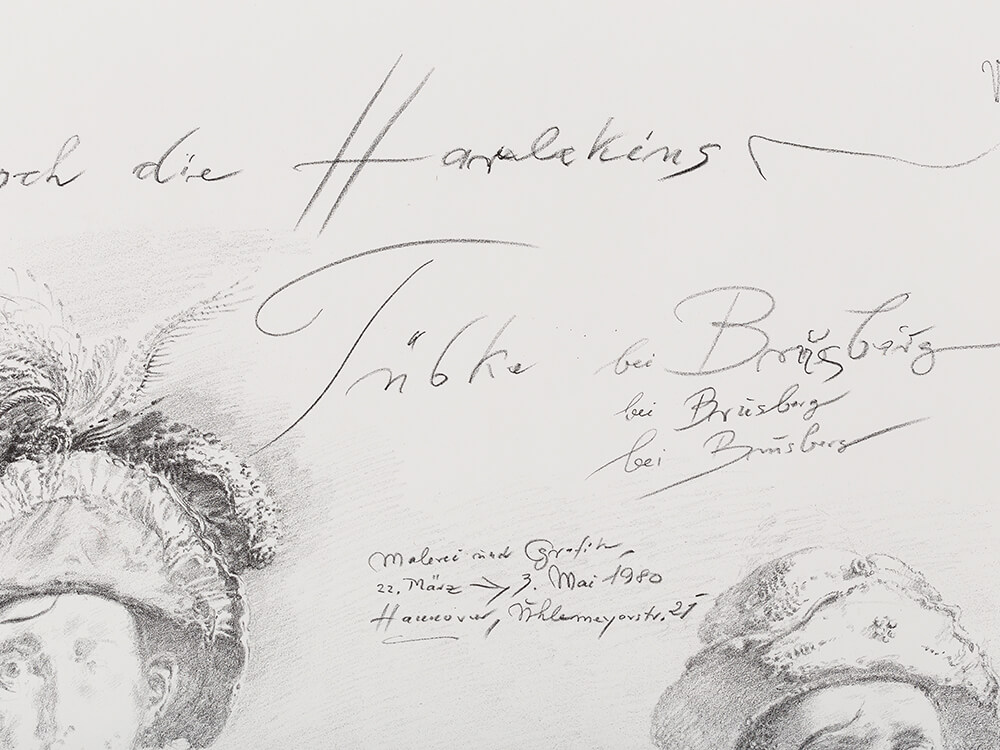 Lithograph on smooth paper, Germany, 1980, poster for the exhibition of Werner Tübke at the Galerie Brusberg, Hannover, 1980, dimensions: 97 x 67 cm, large image in character of two people dressed as harlequins, as part of a series of motifs that Tübke created inspired by the Commedia dell’arte