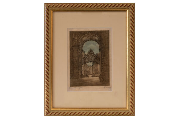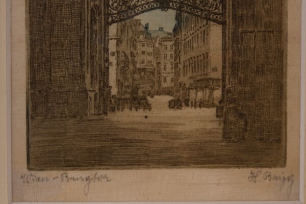 Wien Burgtor, kolorierte Radierung , mit Passepartout und goldenen Rahmen, signiert H. Bmjg, 27 x 21 cm | Vienna castle gate, colored etching, with passepartout and golden frame, signed H. Bmjg, 27 x 21 cm